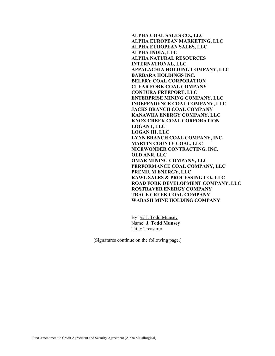 First Amendment to Credit Agreement and Security Agreement (Alpha Metallurgical) ALPHA COAL SALES CO., LLC ALPHA EUROPEAN MARKETING, LLC ALPHA EUROPEAN SALES, LLC ALPHA INDIA, LLC ALPHA NATURAL RESOURCES INTERNATIONAL, LLC APPALACHIA HOLDING COMPANY, LLC BARBARA HOLDINGS INC. BELFRY COAL CORPORATION CLEAR FORK COAL COMPANY CONTURA FREEPORT, LLC ENTERPRISE MINING COMPANY, LLC INDEPENDENCE COAL COMPANY, LLC JACKS BRANCH COAL COMPANY KANAWHA ENERGY COMPANY, LLC KNOX CREEK COAL CORPORATION LOGAN I, LLC LOGAN III, LLC LYNN BRANCH COAL COMPANY, INC. MARTIN COUNTY COAL, LLC NICEWONDER CONTRACTING, INC. OLD ANR, LLC OMAR MINING COMPANY, LLC PERFORMANCE COAL COMPANY, LLC PREMIUM ENERGY, LLC RAWL SALES & PROCESSING CO., LLC ROAD FORK DEVELOPMENT COMPANY, LLC ROSTRAVER ENERGY COMPANY TRACE CREEK COAL COMPANY WABASH MINE HOLDING COMPANY By: /s/ J. Todd Munsey Name: J. Todd Munsey Title: Treasurer [Signatures continue on the following page.]