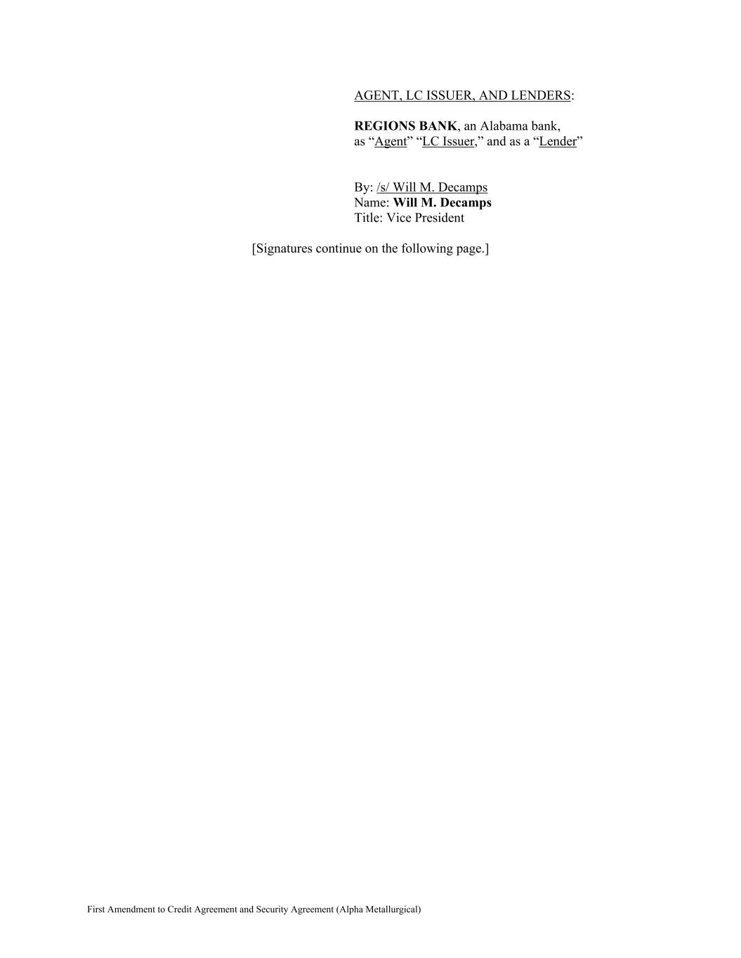 First Amendment to Credit Agreement and Security Agreement (Alpha Metallurgical) AGENT, LC ISSUER, AND LENDERS: REGIONS BANK, an Alabama bank, as “Agent” “LC Issuer,” and as a “Lender” By: /s/ Will M. Decamps Name: Will M. Decamps Title: Vice President [Signatures continue on the following page.]