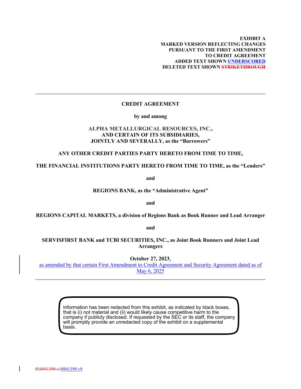 EXHIBIT A MARKED VERSION REFLECTING CHANGES PURSUANT TO THE FIRST AMENDMENT TO CREDIT AGREEMENT ADDED TEXT SHOWN UNDERSCORED DELETED TEXT SHOWN STRIKETHROUGH CREDIT AGREEMENT by and among ALPHA METALLURGICAL RESOURCES, INC., AND CERTAIN OF ITS SUBSIDIARIES, JOINTLY AND SEVERALLY, as the “Borrowers” ANY OTHER CREDIT PARTIES PARTY HERETO FROM TIME TO TIME, THE FINANCIAL INSTITUTIONS PARTY HERETO FROM TIME TO TIME, as the “Lenders” and REGIONS BANK, as the “Administrative Agent” and REGIONS CAPITAL MARKETS, a division of Regions Bank as Book Runner and Lead Arranger and SERVISFIRST BANK and TCBI SECURITIES, INC., as Joint Book Runners and Joint Lead Arrangers October 27, 2023, as amended by that certain First Amendment to Credit Agreement and Security Agreement dated as of May 6, 2025 010941399.v10941399.v9 Information has been redacted from this exhibit, as indicated by black boxes, that is (i) not material and (ii) would likely cause competitive harm to the company if publicly disclosed. If requested by the SEC or its staff, the company will promptly provide an unredacted copy of the exhibit on a supplemental basis.