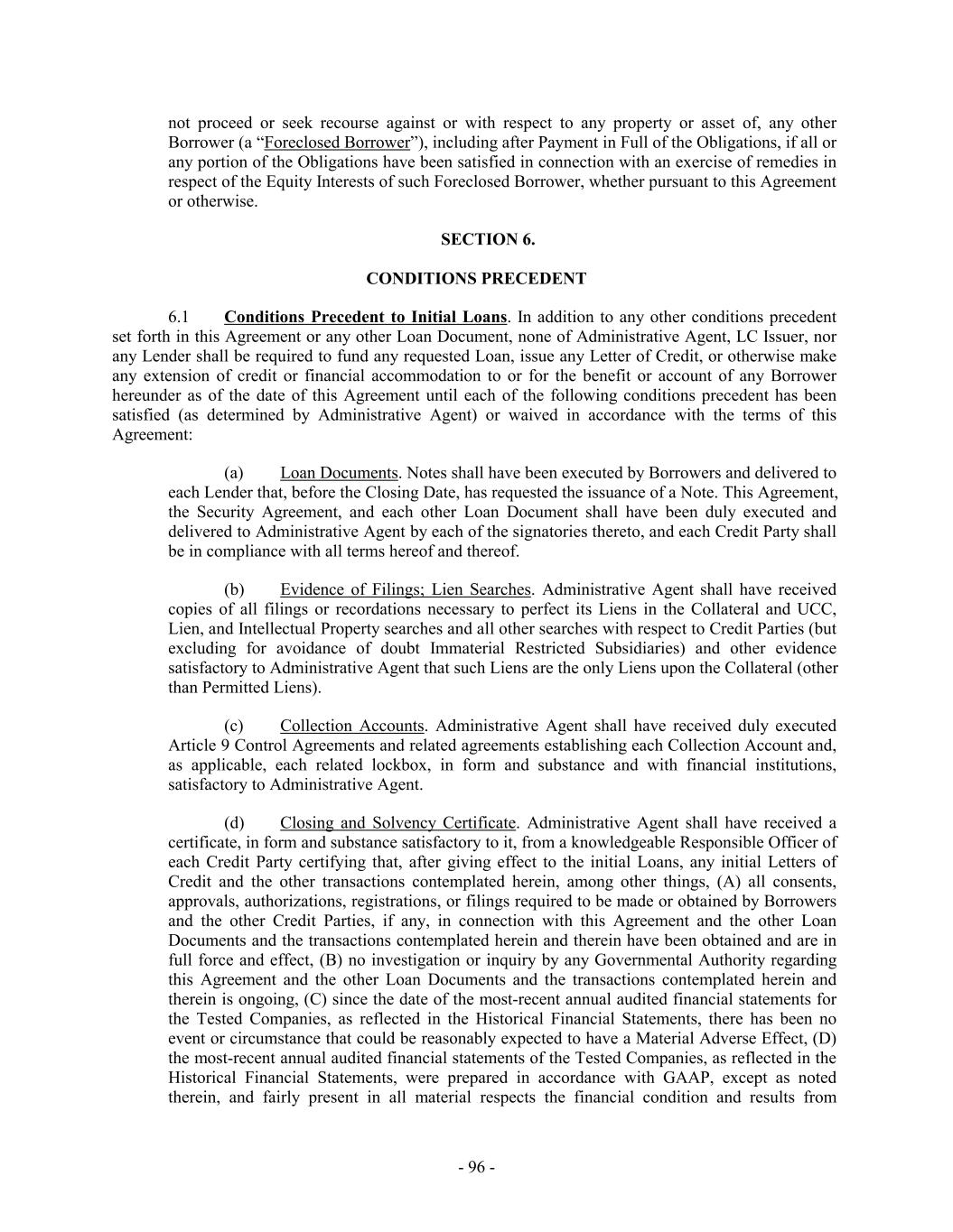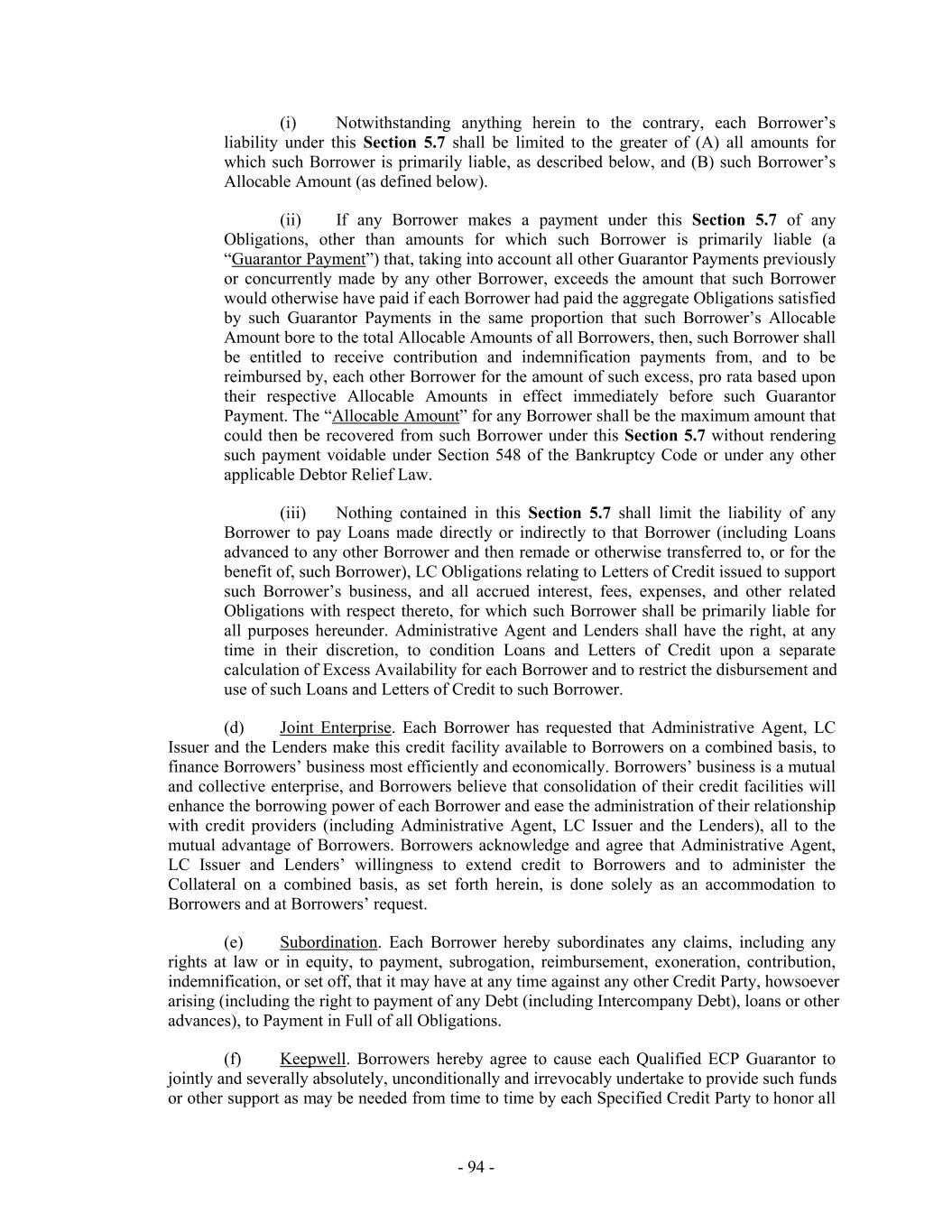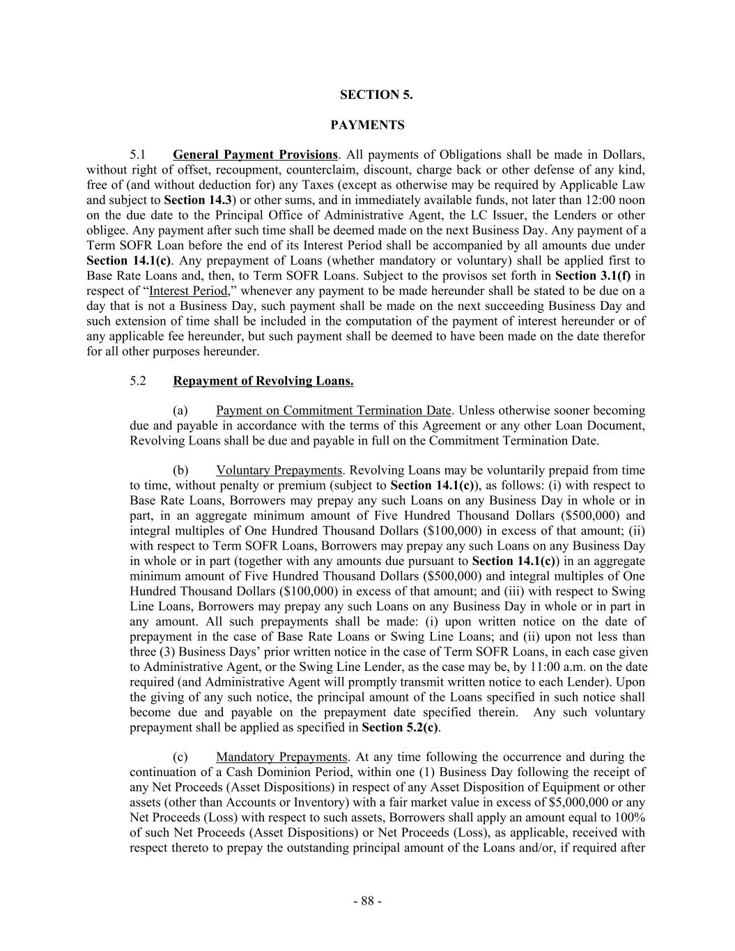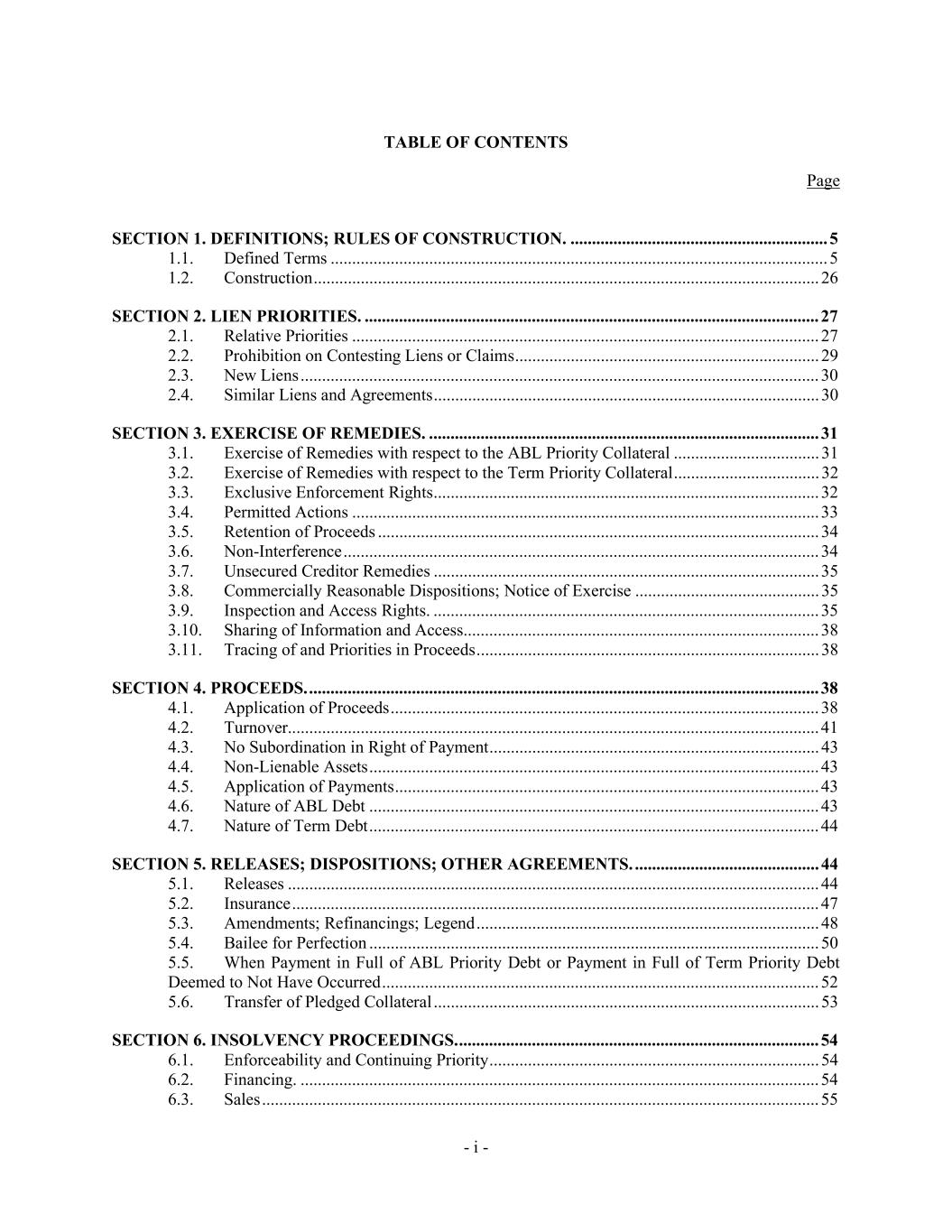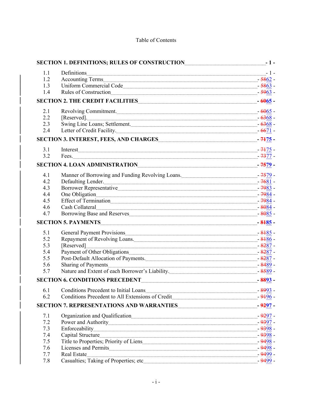 Table of Contents SECTION 1. DEFINITIONS; RULES OF CONSTRUCTION - 1 - 1.1 Definitions - 1 - 1.2 Accounting Terms - 5862 - 1.3 Uniform Commercial Code - 5863 - 1.4 Rules of Construction - 5963 - SECTION 2. THE CREDIT FACILITIES - 6065 - 2.1 Revolving Commitment. - 6065 - 2.2 [Reserved]. - 6368 - 2.3 Swing Line Loans; Settlement. - 6368 - 2.4 Letter of Credit Facility. - 6671 - SECTION 3. INTEREST, FEES, AND CHARGES - 7175 - 3.1 Interest - 7175 - 3.2 Fees. - 7377 - SECTION 4. LOAN ADMINISTRATION - 7579 - 4.1 Manner of Borrowing and Funding Revolving Loans. - 7579 - 4.2 Defaulting Lender. - 7681 - 4.3 Borrower Representative - 7983 - 4.4 One Obligation - 7984 - 4.5 Effect of Termination - 7984 - 4.6 Cash Collateral - 8084 - 4.7 Borrowing Base and Reserves - 8085 - SECTION 5. PAYMENTS - 8185 - 5.1 General Payment Provisions - 8185 - 5.2 Repayment of Revolving Loans. - 8186 - 5.3 [Reserved] - 8287 - 5.4 Payment of Other Obligations - 8287 - 5.5 Post-Default Allocation of Payments. - 8287 - 5.6 Sharing of Payments - 8489 - 5.7 Nature and Extent of each Borrower’s Liability. - 8589 - SECTION 6. CONDITIONS PRECEDENT - 8893 - 6.1 Conditions Precedent to Initial Loans - 8993 - 6.2 Conditions Precedent to All Extensions of Credit - 9196 - SECTION 7. REPRESENTATIONS AND WARRANTIES - 9297 - 7.1 Organization and Qualification - 9297 - 7.2 Power and Authority - 9397 - 7.3 Enforceability - 9398 - 7.4 Capital Structure - 9398 - 7.5 Title to Properties; Priority of Liens - 9498 - 7.6 Licenses and Permits - 9498 - 7.7 Real Estate - 9499 - 7.8 Casualties; Taking of Properties; etc - 9499 - - i -