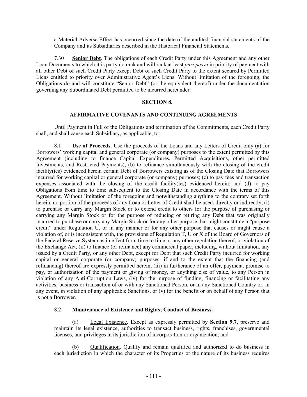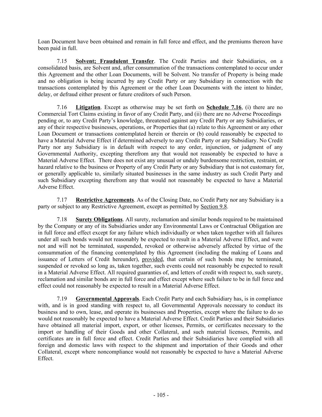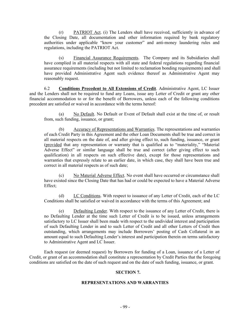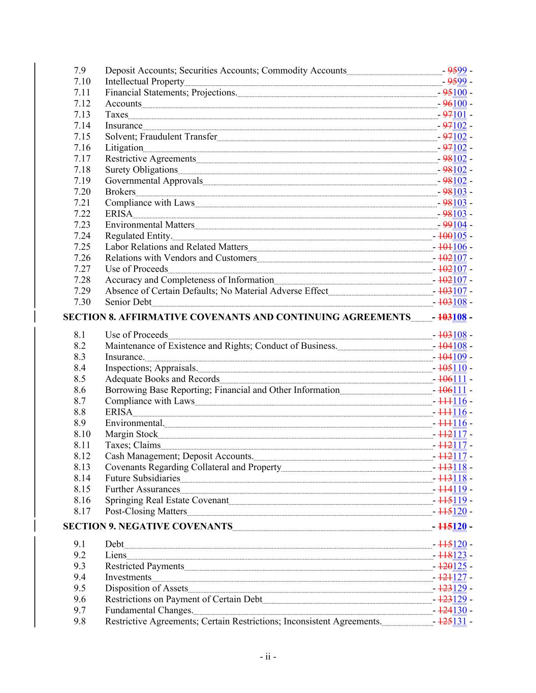 7.9 Deposit Accounts; Securities Accounts; Commodity Accounts - 9599 - 7.10 Intellectual Property - 9599 - 7.11 Financial Statements; Projections. - 95100 - 7.12 Accounts - 96100 - 7.13 Taxes - 97101 - 7.14 Insurance - 97102 - 7.15 Solvent; Fraudulent Transfer - 97102 - 7.16 Litigation - 97102 - 7.17 Restrictive Agreements - 98102 - 7.18 Surety Obligations - 98102 - 7.19 Governmental Approvals - 98102 - 7.20 Brokers - 98103 - 7.21 Compliance with Laws - 98103 - 7.22 ERISA - 98103 - 7.23 Environmental Matters - 99104 - 7.24 Regulated Entity. - 100105 - 7.25 Labor Relations and Related Matters - 101106 - 7.26 Relations with Vendors and Customers - 102107 - 7.27 Use of Proceeds - 102107 - 7.28 Accuracy and Completeness of Information - 102107 - 7.29 Absence of Certain Defaults; No Material Adverse Effect - 103107 - 7.30 Senior Debt - 103108 - SECTION 8. AFFIRMATIVE COVENANTS AND CONTINUING AGREEMENTS - 103108 - 8.1 Use of Proceeds - 103108 - 8.2 Maintenance of Existence and Rights; Conduct of Business. - 104108 - 8.3 Insurance. - 104109 - 8.4 Inspections; Appraisals. - 105110 - 8.5 Adequate Books and Records - 106111 - 8.6 Borrowing Base Reporting; Financial and Other Information - 106111 - 8.7 Compliance with Laws - 111116 - 8.8 ERISA - 111116 - 8.9 Environmental. - 111116 - 8.10 Margin Stock - 112117 - 8.11 Taxes; Claims - 112117 - 8.12 Cash Management; Deposit Accounts. - 112117 - 8.13 Covenants Regarding Collateral and Property - 113118 - 8.14 Future Subsidiaries - 113118 - 8.15 Further Assurances - 114119 - 8.16 Springing Real Estate Covenant - 115119 - 8.17 Post-Closing Matters - 115120 - SECTION 9. NEGATIVE COVENANTS - 115120 - 9.1 Debt - 115120 - 9.2 Liens - 118123 - 9.3 Restricted Payments - 120125 - 9.4 Investments - 121127 - 9.5 Disposition of Assets - 123129 - 9.6 Restrictions on Payment of Certain Debt - 123129 - 9.7 Fundamental Changes. - 124130 - 9.8 Restrictive Agreements; Certain Restrictions; Inconsistent Agreements. - 125131 - - ii -