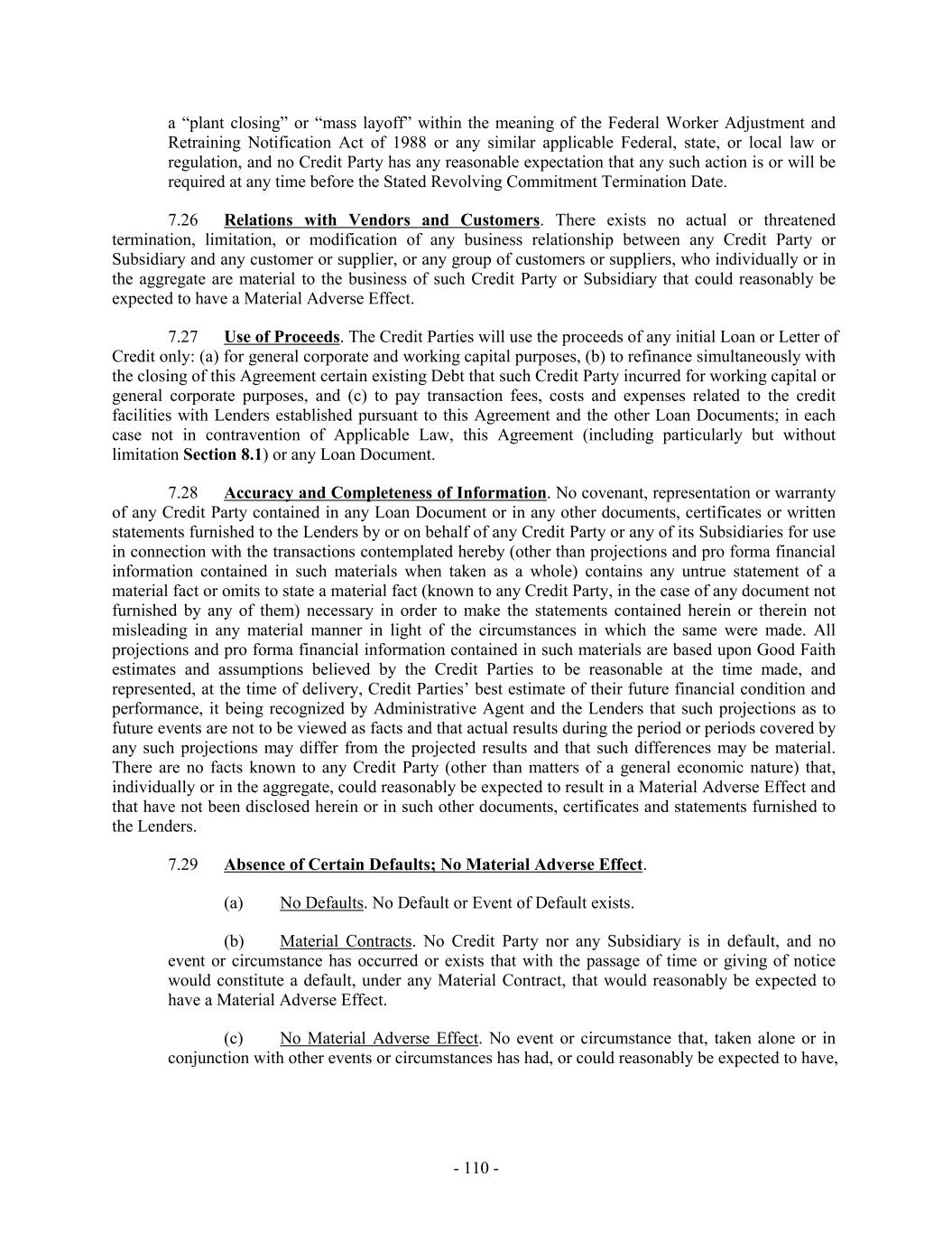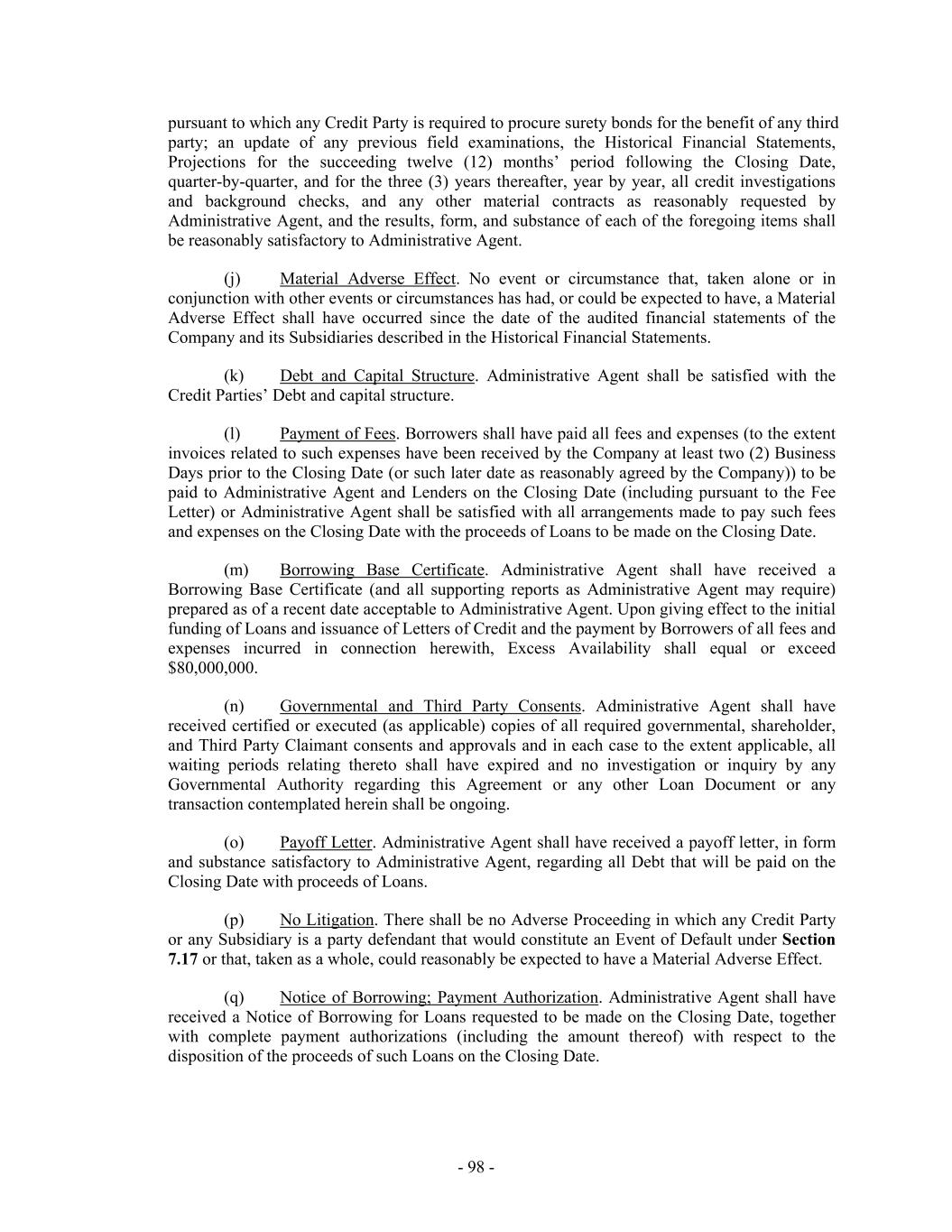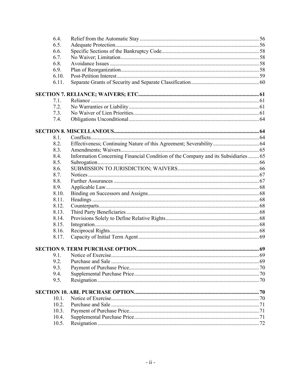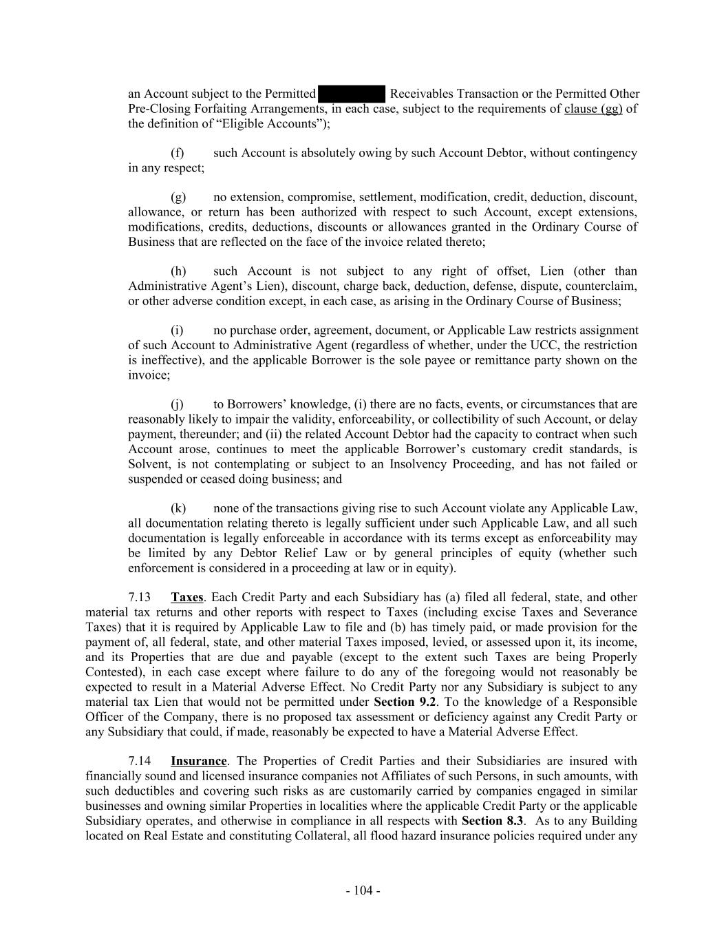 7.9 Deposit Accounts; Securities Accounts; Commodity Accounts - 9599 - 7.10 Intellectual Property - 9599 - 7.11 Financial Statements; Projections. - 95100 - 7.12 Accounts - 96100 - 7.13 Taxes - 97101 - 7.14 Insurance - 97102 - 7.15 Solvent; Fraudulent Transfer - 97102 - 7.16 Litigation - 97102 - 7.17 Restrictive Agreements - 98102 - 7.18 Surety Obligations - 98102 - 7.19 Governmental Approvals - 98102 - 7.20 Brokers - 98103 - 7.21 Compliance with Laws - 98103 - 7.22 ERISA - 98103 - 7.23 Environmental Matters - 99104 - 7.24 Regulated Entity. - 100105 - 7.25 Labor Relations and Related Matters - 101106 - 7.26 Relations with Vendors and Customers - 102107 - 7.27 Use of Proceeds - 102107 - 7.28 Accuracy and Completeness of Information - 102107 - 7.29 Absence of Certain Defaults; No Material Adverse Effect - 103107 - 7.30 Senior Debt - 103108 - SECTION 8. AFFIRMATIVE COVENANTS AND CONTINUING AGREEMENTS - 103108 - 8.1 Use of Proceeds - 103108 - 8.2 Maintenance of Existence and Rights; Conduct of Business. - 104108 - 8.3 Insurance. - 104109 - 8.4 Inspections; Appraisals. - 105110 - 8.5 Adequate Books and Records - 106111 - 8.6 Borrowing Base Reporting; Financial and Other Information - 106111 - 8.7 Compliance with Laws - 111116 - 8.8 ERISA - 111116 - 8.9 Environmental. - 111116 - 8.10 Margin Stock - 112117 - 8.11 Taxes; Claims - 112117 - 8.12 Cash Management; Deposit Accounts. - 112117 - 8.13 Covenants Regarding Collateral and Property - 113118 - 8.14 Future Subsidiaries - 113118 - 8.15 Further Assurances - 114119 - 8.16 Springing Real Estate Covenant - 115119 - 8.17 Post-Closing Matters - 115120 - SECTION 9. NEGATIVE COVENANTS - 115120 - 9.1 Debt - 115120 - 9.2 Liens - 118123 - 9.3 Restricted Payments - 120125 - 9.4 Investments - 121127 - 9.5 Disposition of Assets - 123129 - 9.6 Restrictions on Payment of Certain Debt - 123129 - 9.7 Fundamental Changes. - 124130 - 9.8 Restrictive Agreements; Certain Restrictions; Inconsistent Agreements. - 125131 - - ii -