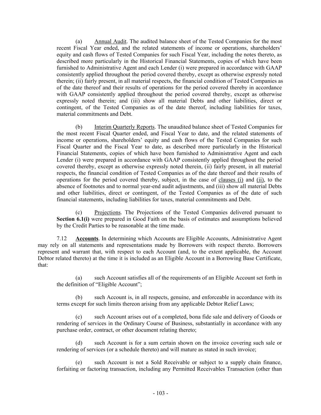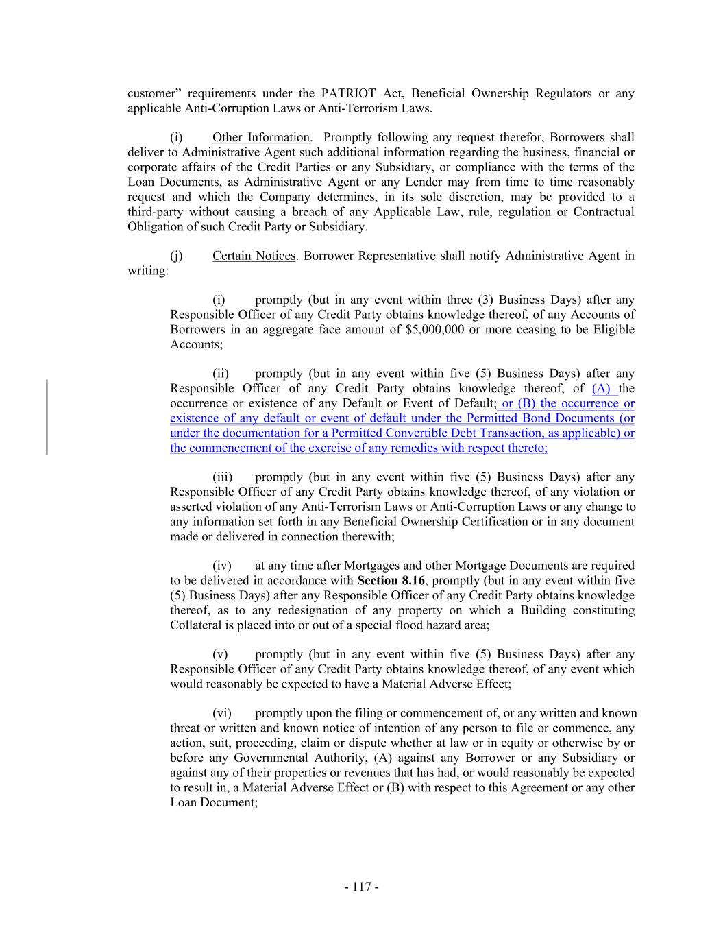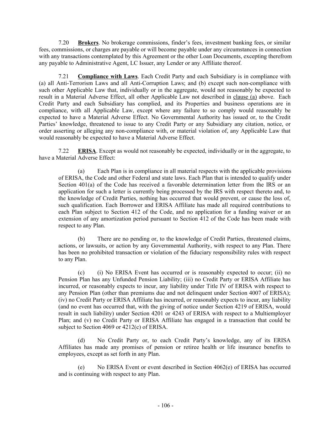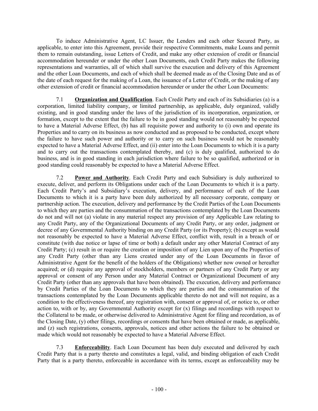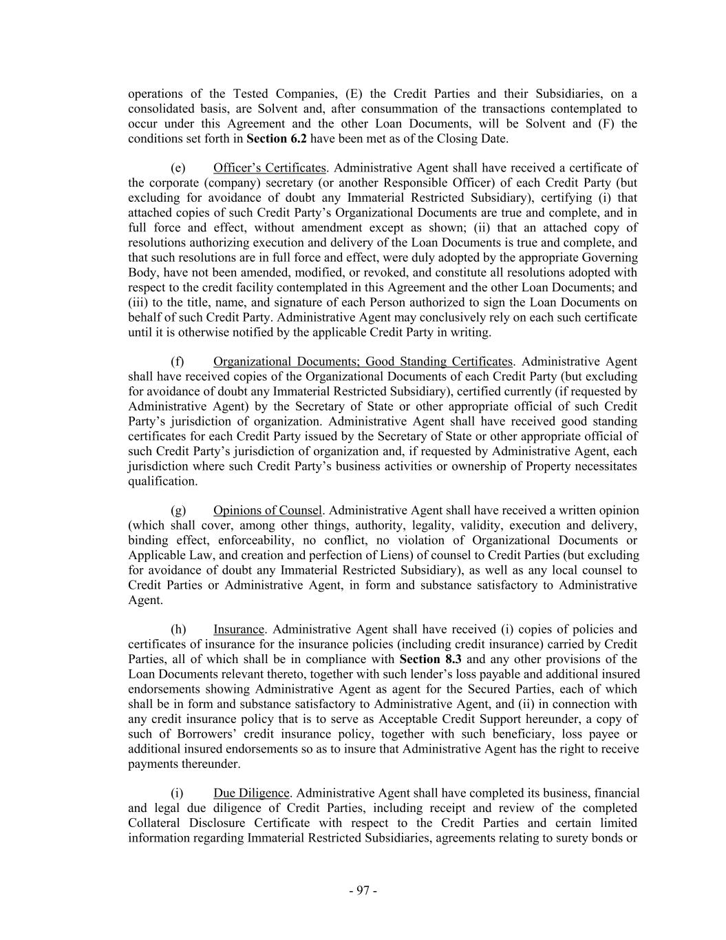 7.9 Deposit Accounts; Securities Accounts; Commodity Accounts - 9599 - 7.10 Intellectual Property - 9599 - 7.11 Financial Statements; Projections. - 95100 - 7.12 Accounts - 96100 - 7.13 Taxes - 97101 - 7.14 Insurance - 97102 - 7.15 Solvent; Fraudulent Transfer - 97102 - 7.16 Litigation - 97102 - 7.17 Restrictive Agreements - 98102 - 7.18 Surety Obligations - 98102 - 7.19 Governmental Approvals - 98102 - 7.20 Brokers - 98103 - 7.21 Compliance with Laws - 98103 - 7.22 ERISA - 98103 - 7.23 Environmental Matters - 99104 - 7.24 Regulated Entity. - 100105 - 7.25 Labor Relations and Related Matters - 101106 - 7.26 Relations with Vendors and Customers - 102107 - 7.27 Use of Proceeds - 102107 - 7.28 Accuracy and Completeness of Information - 102107 - 7.29 Absence of Certain Defaults; No Material Adverse Effect - 103107 - 7.30 Senior Debt - 103108 - SECTION 8. AFFIRMATIVE COVENANTS AND CONTINUING AGREEMENTS - 103108 - 8.1 Use of Proceeds - 103108 - 8.2 Maintenance of Existence and Rights; Conduct of Business. - 104108 - 8.3 Insurance. - 104109 - 8.4 Inspections; Appraisals. - 105110 - 8.5 Adequate Books and Records - 106111 - 8.6 Borrowing Base Reporting; Financial and Other Information - 106111 - 8.7 Compliance with Laws - 111116 - 8.8 ERISA - 111116 - 8.9 Environmental. - 111116 - 8.10 Margin Stock - 112117 - 8.11 Taxes; Claims - 112117 - 8.12 Cash Management; Deposit Accounts. - 112117 - 8.13 Covenants Regarding Collateral and Property - 113118 - 8.14 Future Subsidiaries - 113118 - 8.15 Further Assurances - 114119 - 8.16 Springing Real Estate Covenant - 115119 - 8.17 Post-Closing Matters - 115120 - SECTION 9. NEGATIVE COVENANTS - 115120 - 9.1 Debt - 115120 - 9.2 Liens - 118123 - 9.3 Restricted Payments - 120125 - 9.4 Investments - 121127 - 9.5 Disposition of Assets - 123129 - 9.6 Restrictions on Payment of Certain Debt - 123129 - 9.7 Fundamental Changes. - 124130 - 9.8 Restrictive Agreements; Certain Restrictions; Inconsistent Agreements. - 125131 - - ii -