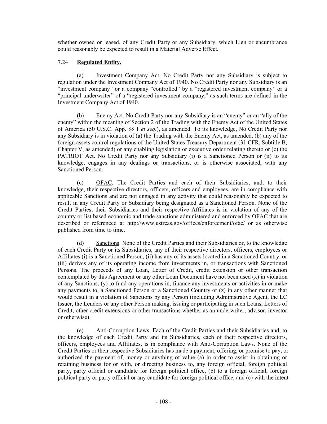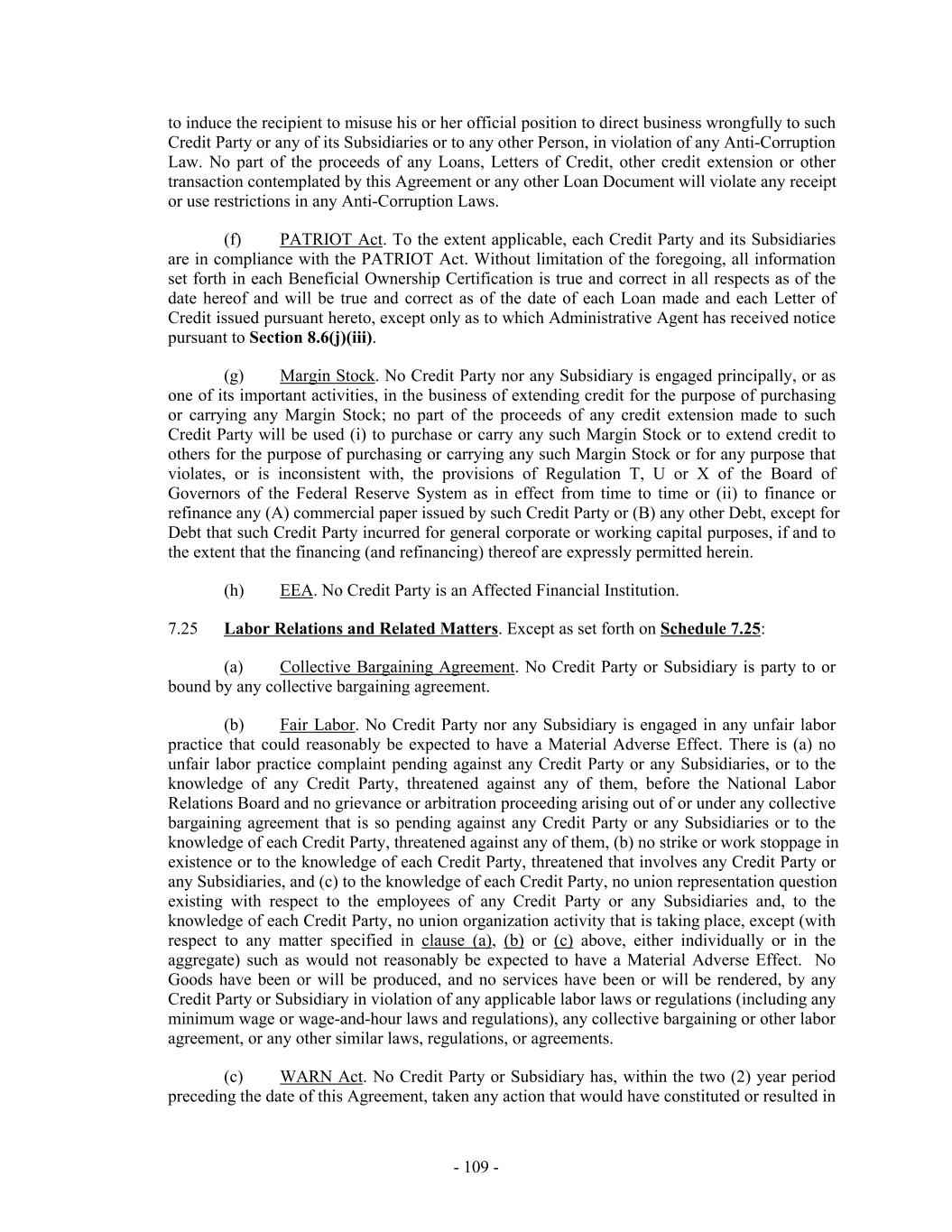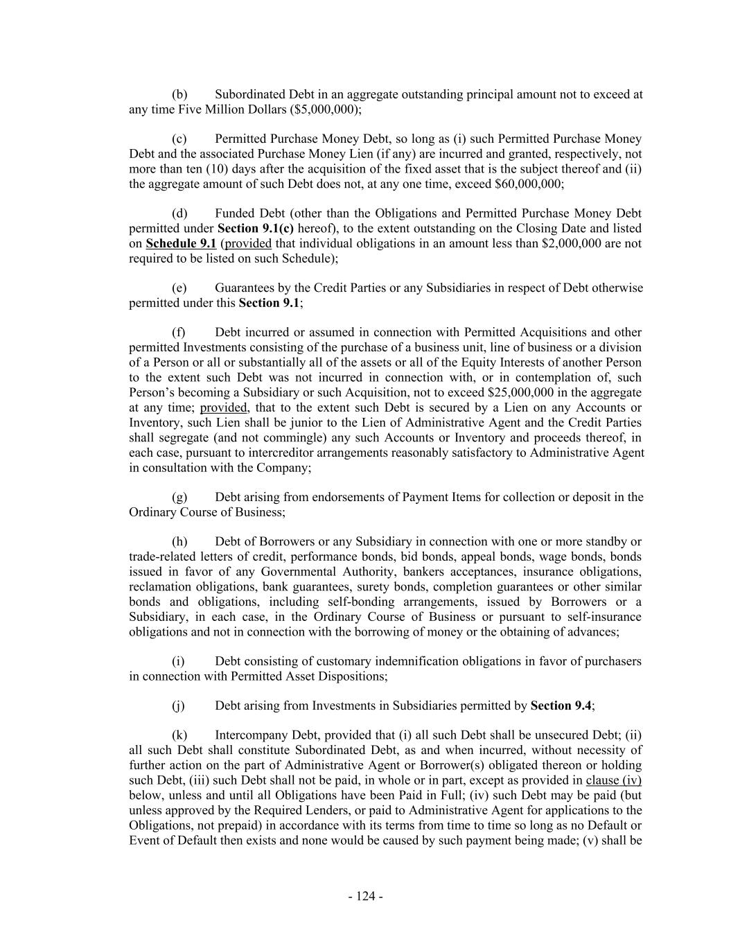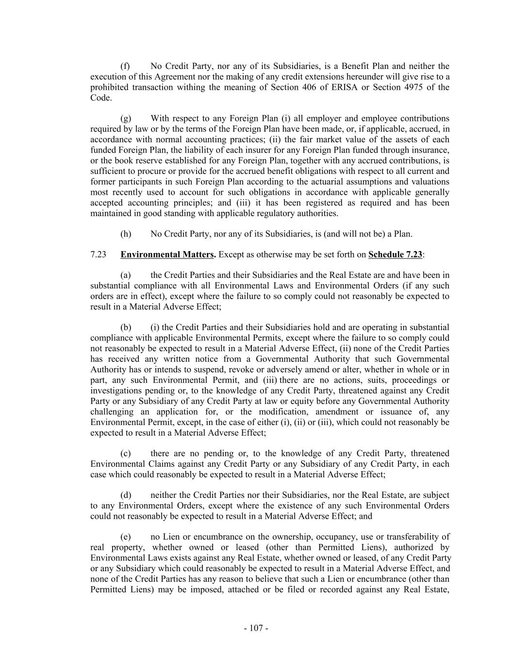 7.9 Deposit Accounts; Securities Accounts; Commodity Accounts - 9599 - 7.10 Intellectual Property - 9599 - 7.11 Financial Statements; Projections. - 95100 - 7.12 Accounts - 96100 - 7.13 Taxes - 97101 - 7.14 Insurance - 97102 - 7.15 Solvent; Fraudulent Transfer - 97102 - 7.16 Litigation - 97102 - 7.17 Restrictive Agreements - 98102 - 7.18 Surety Obligations - 98102 - 7.19 Governmental Approvals - 98102 - 7.20 Brokers - 98103 - 7.21 Compliance with Laws - 98103 - 7.22 ERISA - 98103 - 7.23 Environmental Matters - 99104 - 7.24 Regulated Entity. - 100105 - 7.25 Labor Relations and Related Matters - 101106 - 7.26 Relations with Vendors and Customers - 102107 - 7.27 Use of Proceeds - 102107 - 7.28 Accuracy and Completeness of Information - 102107 - 7.29 Absence of Certain Defaults; No Material Adverse Effect - 103107 - 7.30 Senior Debt - 103108 - SECTION 8. AFFIRMATIVE COVENANTS AND CONTINUING AGREEMENTS - 103108 - 8.1 Use of Proceeds - 103108 - 8.2 Maintenance of Existence and Rights; Conduct of Business. - 104108 - 8.3 Insurance. - 104109 - 8.4 Inspections; Appraisals. - 105110 - 8.5 Adequate Books and Records - 106111 - 8.6 Borrowing Base Reporting; Financial and Other Information - 106111 - 8.7 Compliance with Laws - 111116 - 8.8 ERISA - 111116 - 8.9 Environmental. - 111116 - 8.10 Margin Stock - 112117 - 8.11 Taxes; Claims - 112117 - 8.12 Cash Management; Deposit Accounts. - 112117 - 8.13 Covenants Regarding Collateral and Property - 113118 - 8.14 Future Subsidiaries - 113118 - 8.15 Further Assurances - 114119 - 8.16 Springing Real Estate Covenant - 115119 - 8.17 Post-Closing Matters - 115120 - SECTION 9. NEGATIVE COVENANTS - 115120 - 9.1 Debt - 115120 - 9.2 Liens - 118123 - 9.3 Restricted Payments - 120125 - 9.4 Investments - 121127 - 9.5 Disposition of Assets - 123129 - 9.6 Restrictions on Payment of Certain Debt - 123129 - 9.7 Fundamental Changes. - 124130 - 9.8 Restrictive Agreements; Certain Restrictions; Inconsistent Agreements. - 125131 - - ii -