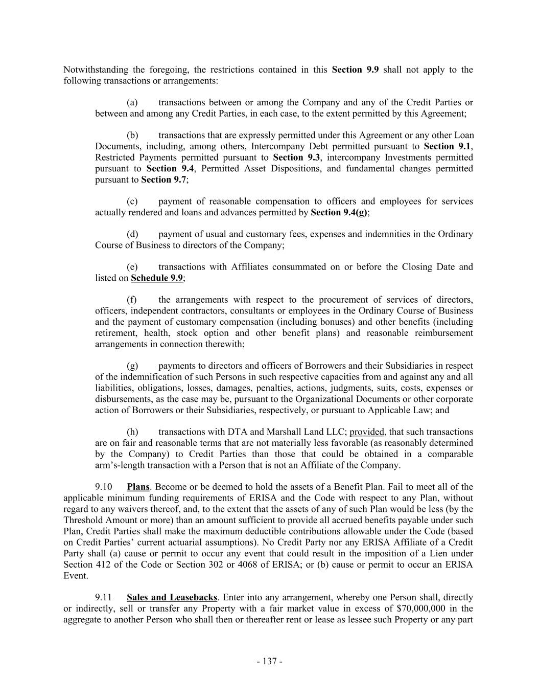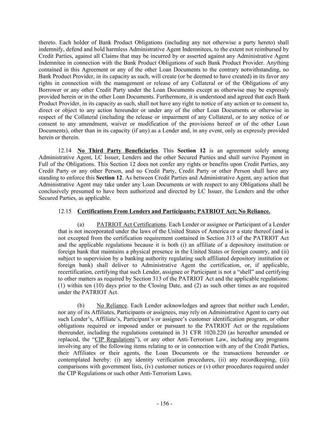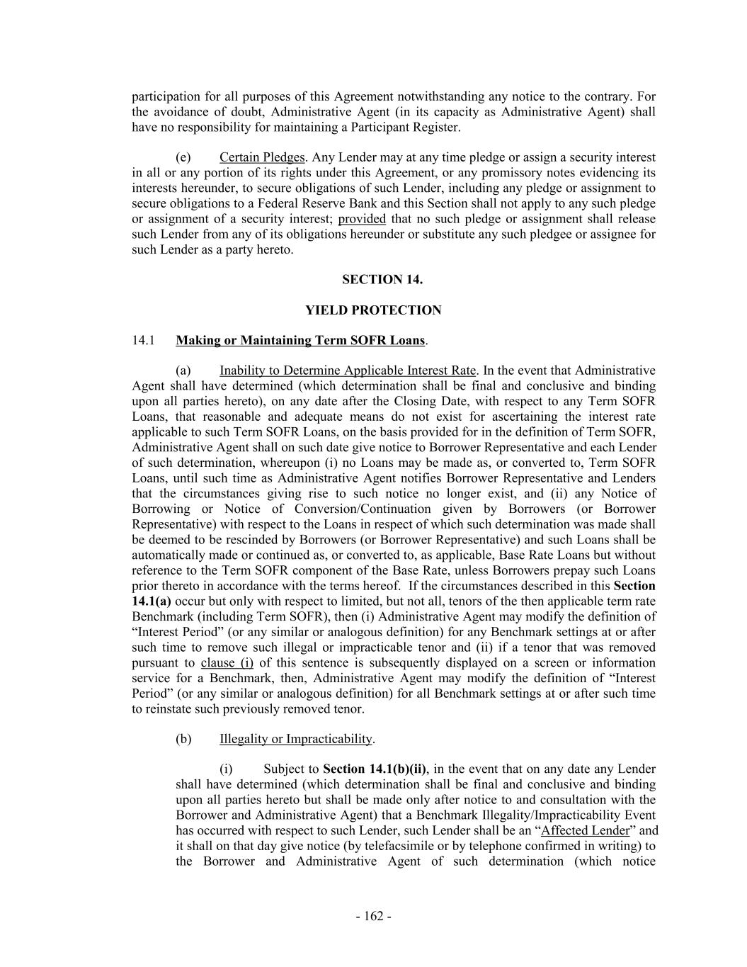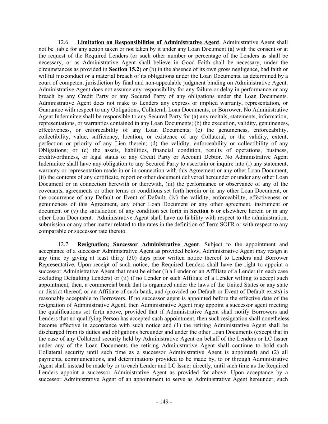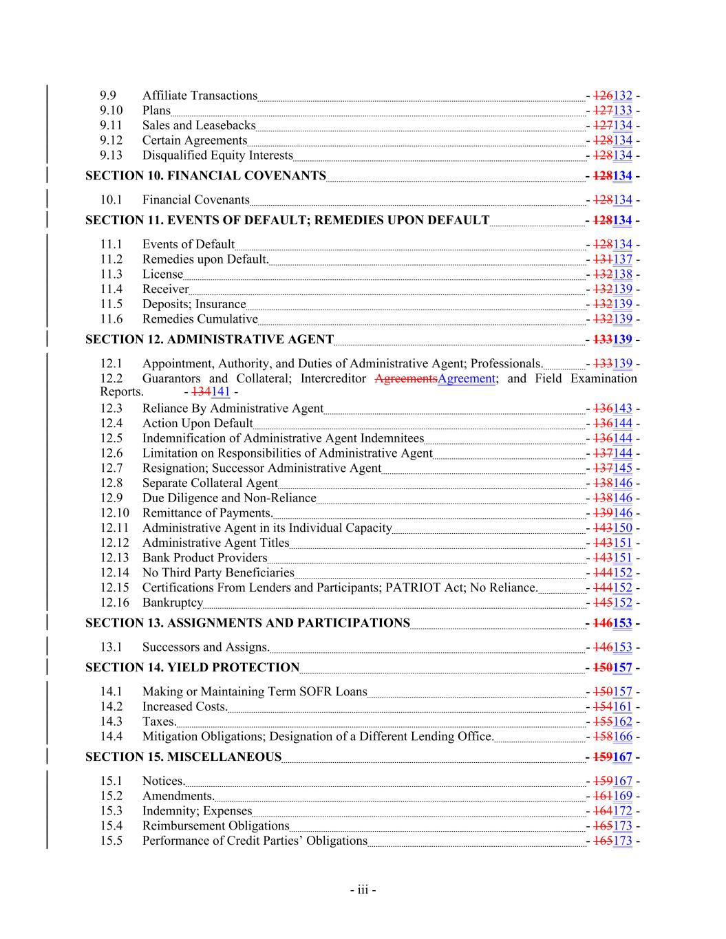 9.9 Affiliate Transactions - 126132 - 9.10 Plans - 127133 - 9.11 Sales and Leasebacks - 127134 - 9.12 Certain Agreements - 128134 - 9.13 Disqualified Equity Interests - 128134 - SECTION 10. FINANCIAL COVENANTS - 128134 - 10.1 Financial Covenants - 128134 - SECTION 11. EVENTS OF DEFAULT; REMEDIES UPON DEFAULT - 128134 - 11.1 Events of Default - 128134 - 11.2 Remedies upon Default. - 131137 - 11.3 License - 132138 - 11.4 Receiver - 132139 - 11.5 Deposits; Insurance - 132139 - 11.6 Remedies Cumulative - 132139 - SECTION 12. ADMINISTRATIVE AGENT - 133139 - 12.1 Appointment, Authority, and Duties of Administrative Agent; Professionals. - 133139 - 12.2 Guarantors and Collateral; Intercreditor AgreementsAgreement; and Field Examination Reports. - 134141 - 12.3 Reliance By Administrative Agent - 136143 - 12.4 Action Upon Default - 136144 - 12.5 Indemnification of Administrative Agent Indemnitees - 136144 - 12.6 Limitation on Responsibilities of Administrative Agent - 137144 - 12.7 Resignation; Successor Administrative Agent - 137145 - 12.8 Separate Collateral Agent - 138146 - 12.9 Due Diligence and Non-Reliance - 138146 - 12.10 Remittance of Payments. - 139146 - 12.11 Administrative Agent in its Individual Capacity - 143150 - 12.12 Administrative Agent Titles - 143151 - 12.13 Bank Product Providers - 143151 - 12.14 No Third Party Beneficiaries - 144152 - 12.15 Certifications From Lenders and Participants; PATRIOT Act; No Reliance. - 144152 - 12.16 Bankruptcy - 145152 - SECTION 13. ASSIGNMENTS AND PARTICIPATIONS - 146153 - 13.1 Successors and Assigns. - 146153 - SECTION 14. YIELD PROTECTION - 150157 - 14.1 Making or Maintaining Term SOFR Loans - 150157 - 14.2 Increased Costs. - 154161 - 14.3 Taxes. - 155162 - 14.4 Mitigation Obligations; Designation of a Different Lending Office. - 158166 - SECTION 15. MISCELLANEOUS - 159167 - 15.1 Notices. - 159167 - 15.2 Amendments. - 161169 - 15.3 Indemnity; Expenses - 164172 - 15.4 Reimbursement Obligations - 165173 - 15.5 Performance of Credit Parties’ Obligations - 165173 - - iii -