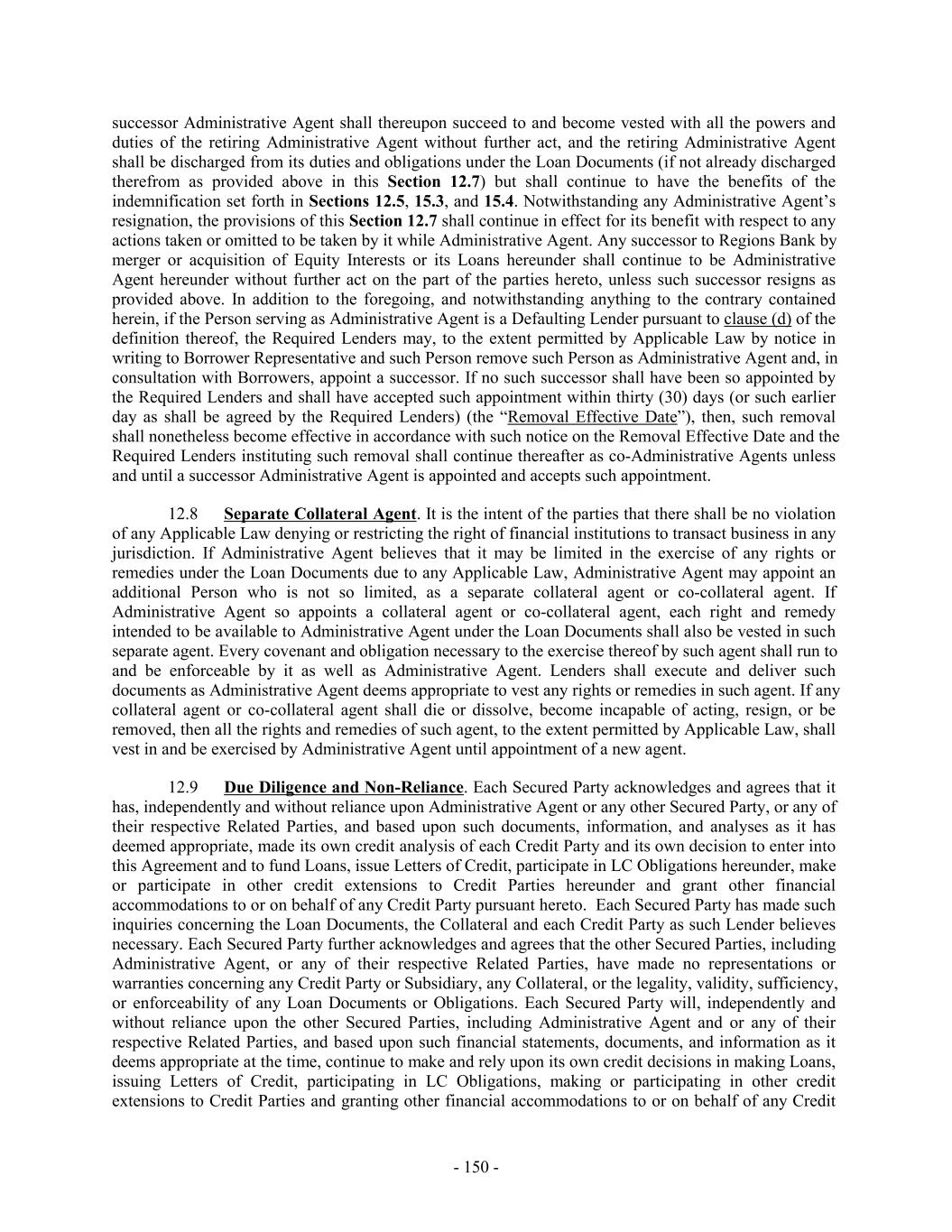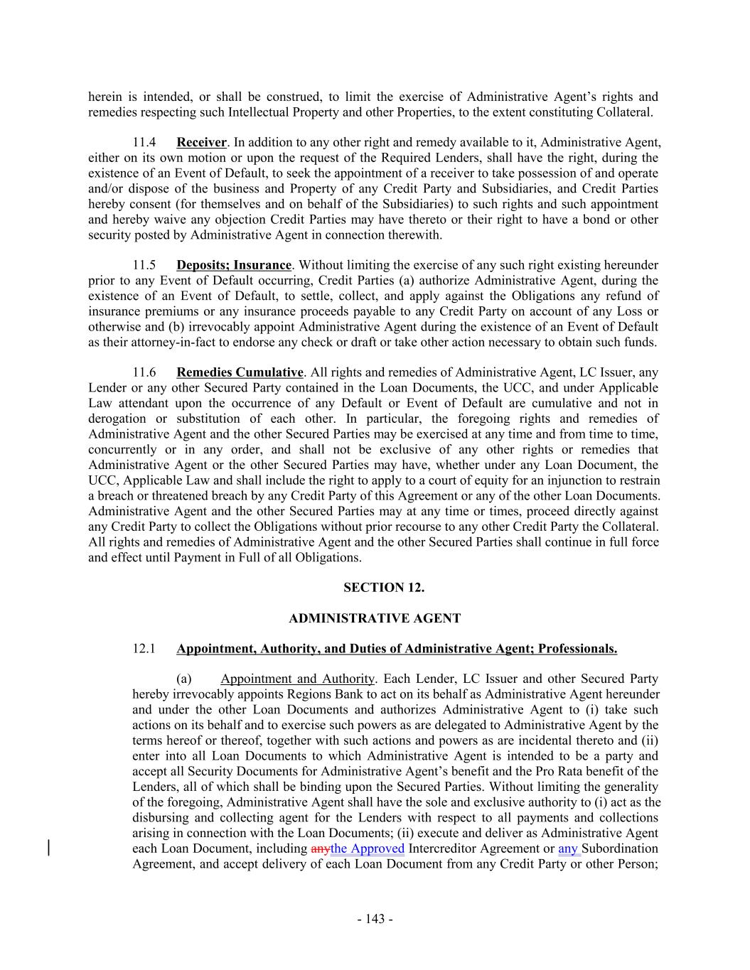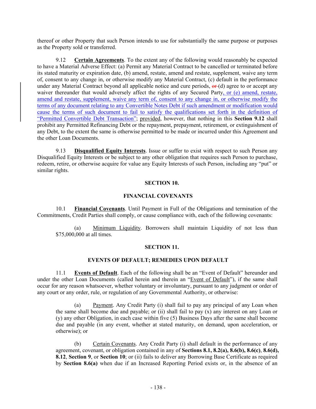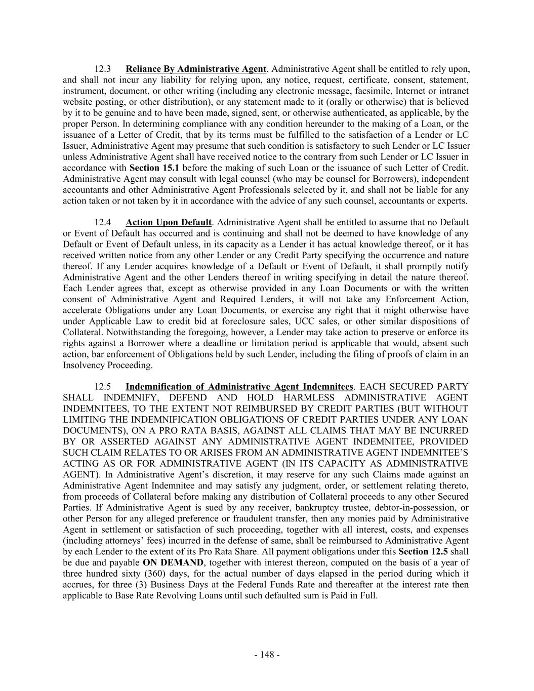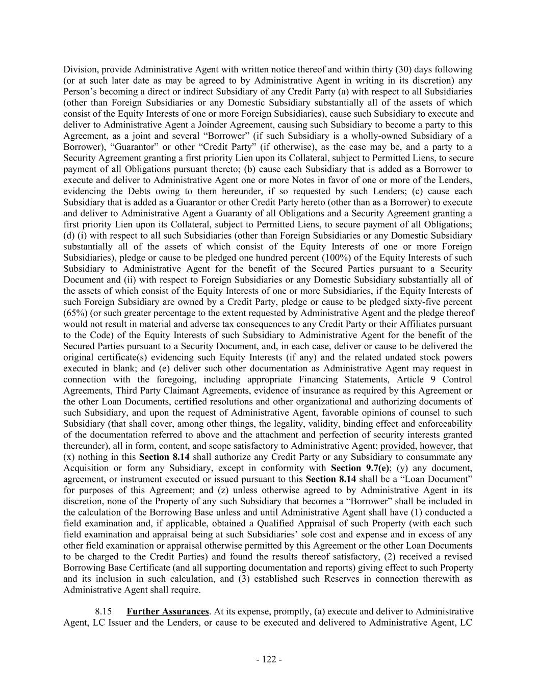 9.9 Affiliate Transactions - 126132 - 9.10 Plans - 127133 - 9.11 Sales and Leasebacks - 127134 - 9.12 Certain Agreements - 128134 - 9.13 Disqualified Equity Interests - 128134 - SECTION 10. FINANCIAL COVENANTS - 128134 - 10.1 Financial Covenants - 128134 - SECTION 11. EVENTS OF DEFAULT; REMEDIES UPON DEFAULT - 128134 - 11.1 Events of Default - 128134 - 11.2 Remedies upon Default. - 131137 - 11.3 License - 132138 - 11.4 Receiver - 132139 - 11.5 Deposits; Insurance - 132139 - 11.6 Remedies Cumulative - 132139 - SECTION 12. ADMINISTRATIVE AGENT - 133139 - 12.1 Appointment, Authority, and Duties of Administrative Agent; Professionals. - 133139 - 12.2 Guarantors and Collateral; Intercreditor AgreementsAgreement; and Field Examination Reports. - 134141 - 12.3 Reliance By Administrative Agent - 136143 - 12.4 Action Upon Default - 136144 - 12.5 Indemnification of Administrative Agent Indemnitees - 136144 - 12.6 Limitation on Responsibilities of Administrative Agent - 137144 - 12.7 Resignation; Successor Administrative Agent - 137145 - 12.8 Separate Collateral Agent - 138146 - 12.9 Due Diligence and Non-Reliance - 138146 - 12.10 Remittance of Payments. - 139146 - 12.11 Administrative Agent in its Individual Capacity - 143150 - 12.12 Administrative Agent Titles - 143151 - 12.13 Bank Product Providers - 143151 - 12.14 No Third Party Beneficiaries - 144152 - 12.15 Certifications From Lenders and Participants; PATRIOT Act; No Reliance. - 144152 - 12.16 Bankruptcy - 145152 - SECTION 13. ASSIGNMENTS AND PARTICIPATIONS - 146153 - 13.1 Successors and Assigns. - 146153 - SECTION 14. YIELD PROTECTION - 150157 - 14.1 Making or Maintaining Term SOFR Loans - 150157 - 14.2 Increased Costs. - 154161 - 14.3 Taxes. - 155162 - 14.4 Mitigation Obligations; Designation of a Different Lending Office. - 158166 - SECTION 15. MISCELLANEOUS - 159167 - 15.1 Notices. - 159167 - 15.2 Amendments. - 161169 - 15.3 Indemnity; Expenses - 164172 - 15.4 Reimbursement Obligations - 165173 - 15.5 Performance of Credit Parties’ Obligations - 165173 - - iii -
