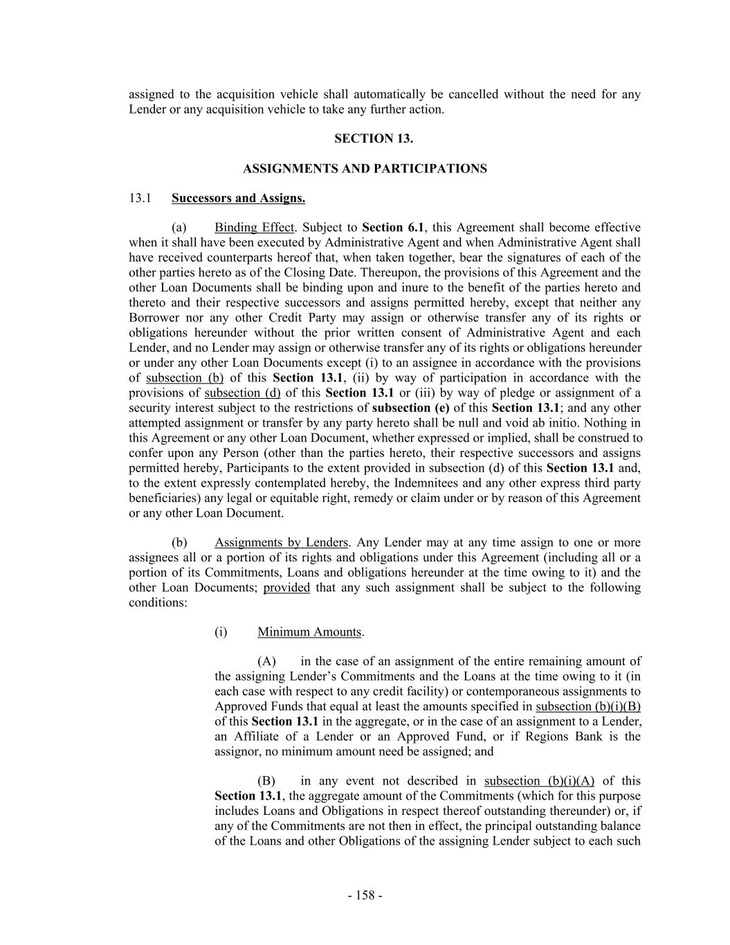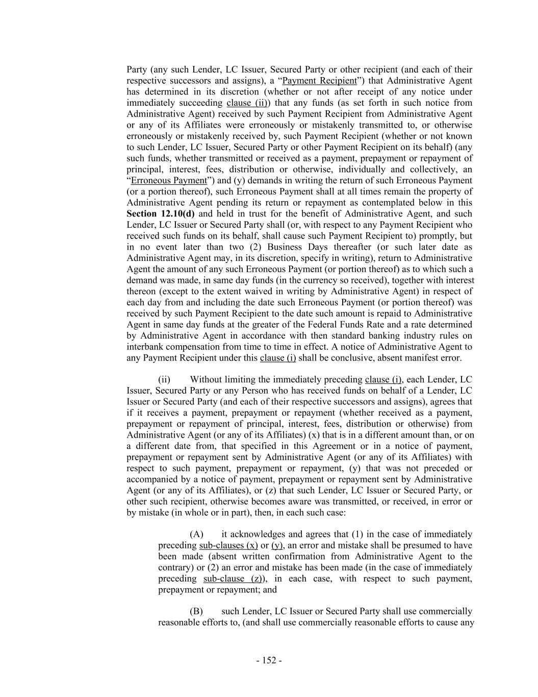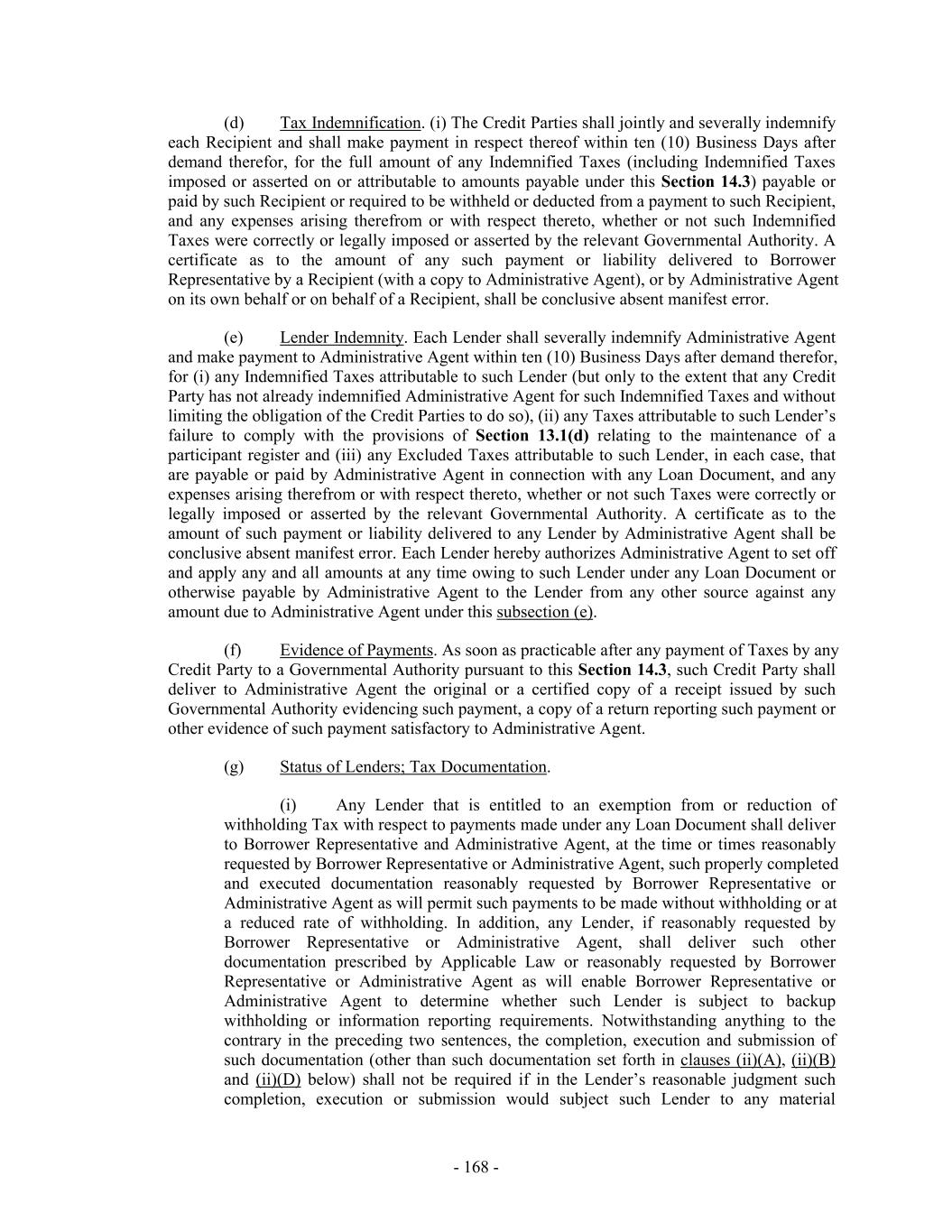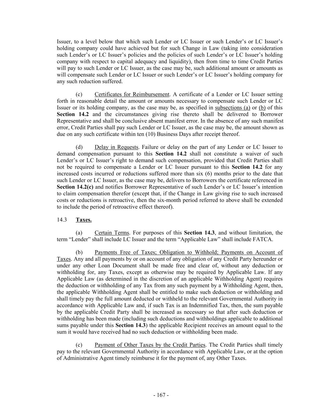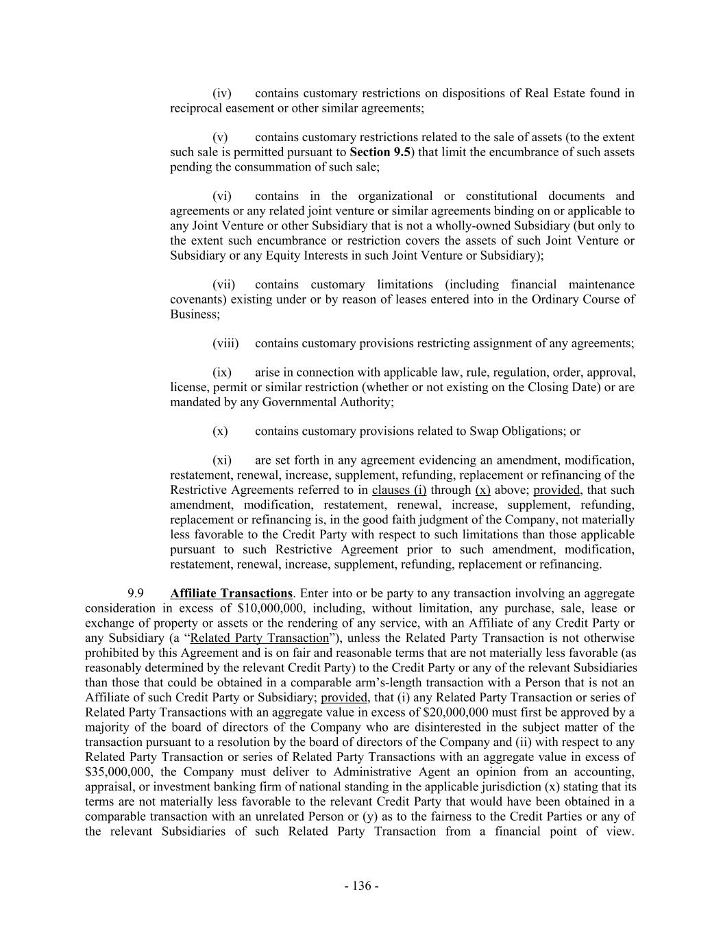 9.9 Affiliate Transactions - 126132 - 9.10 Plans - 127133 - 9.11 Sales and Leasebacks - 127134 - 9.12 Certain Agreements - 128134 - 9.13 Disqualified Equity Interests - 128134 - SECTION 10. FINANCIAL COVENANTS - 128134 - 10.1 Financial Covenants - 128134 - SECTION 11. EVENTS OF DEFAULT; REMEDIES UPON DEFAULT - 128134 - 11.1 Events of Default - 128134 - 11.2 Remedies upon Default. - 131137 - 11.3 License - 132138 - 11.4 Receiver - 132139 - 11.5 Deposits; Insurance - 132139 - 11.6 Remedies Cumulative - 132139 - SECTION 12. ADMINISTRATIVE AGENT - 133139 - 12.1 Appointment, Authority, and Duties of Administrative Agent; Professionals. - 133139 - 12.2 Guarantors and Collateral; Intercreditor AgreementsAgreement; and Field Examination Reports. - 134141 - 12.3 Reliance By Administrative Agent - 136143 - 12.4 Action Upon Default - 136144 - 12.5 Indemnification of Administrative Agent Indemnitees - 136144 - 12.6 Limitation on Responsibilities of Administrative Agent - 137144 - 12.7 Resignation; Successor Administrative Agent - 137145 - 12.8 Separate Collateral Agent - 138146 - 12.9 Due Diligence and Non-Reliance - 138146 - 12.10 Remittance of Payments. - 139146 - 12.11 Administrative Agent in its Individual Capacity - 143150 - 12.12 Administrative Agent Titles - 143151 - 12.13 Bank Product Providers - 143151 - 12.14 No Third Party Beneficiaries - 144152 - 12.15 Certifications From Lenders and Participants; PATRIOT Act; No Reliance. - 144152 - 12.16 Bankruptcy - 145152 - SECTION 13. ASSIGNMENTS AND PARTICIPATIONS - 146153 - 13.1 Successors and Assigns. - 146153 - SECTION 14. YIELD PROTECTION - 150157 - 14.1 Making or Maintaining Term SOFR Loans - 150157 - 14.2 Increased Costs. - 154161 - 14.3 Taxes. - 155162 - 14.4 Mitigation Obligations; Designation of a Different Lending Office. - 158166 - SECTION 15. MISCELLANEOUS - 159167 - 15.1 Notices. - 159167 - 15.2 Amendments. - 161169 - 15.3 Indemnity; Expenses - 164172 - 15.4 Reimbursement Obligations - 165173 - 15.5 Performance of Credit Parties’ Obligations - 165173 - - iii -