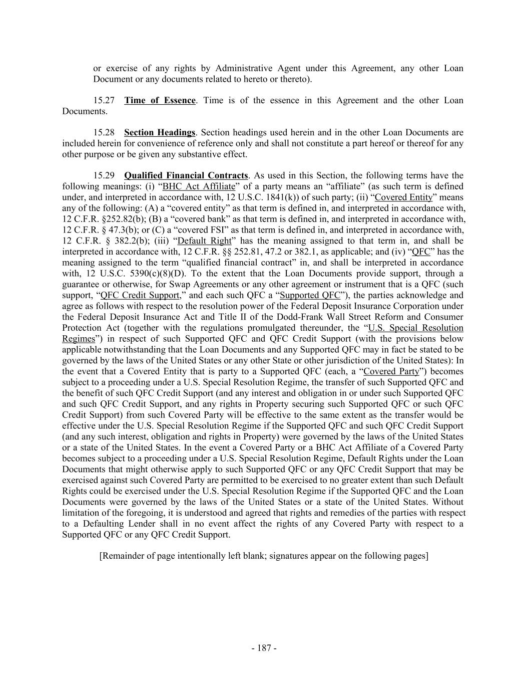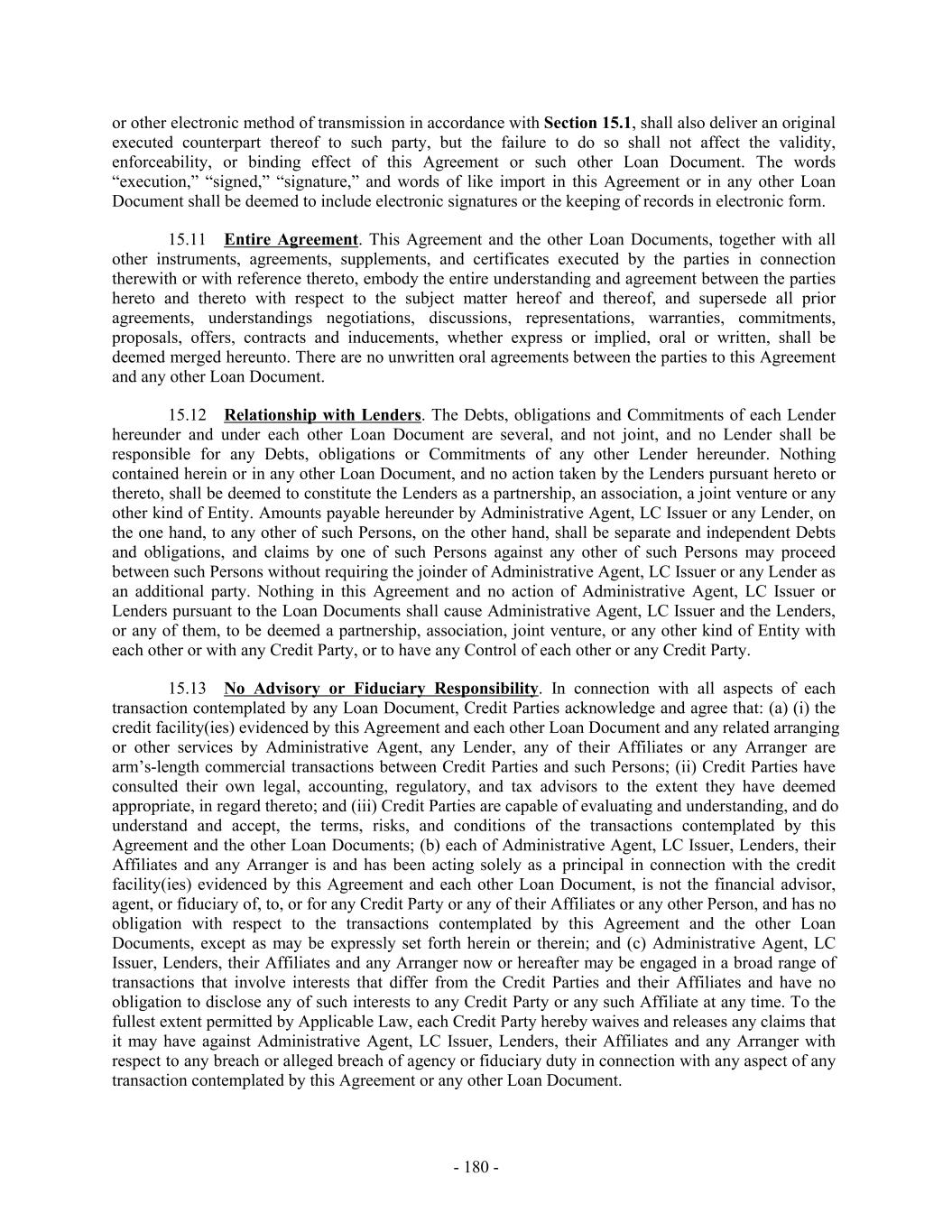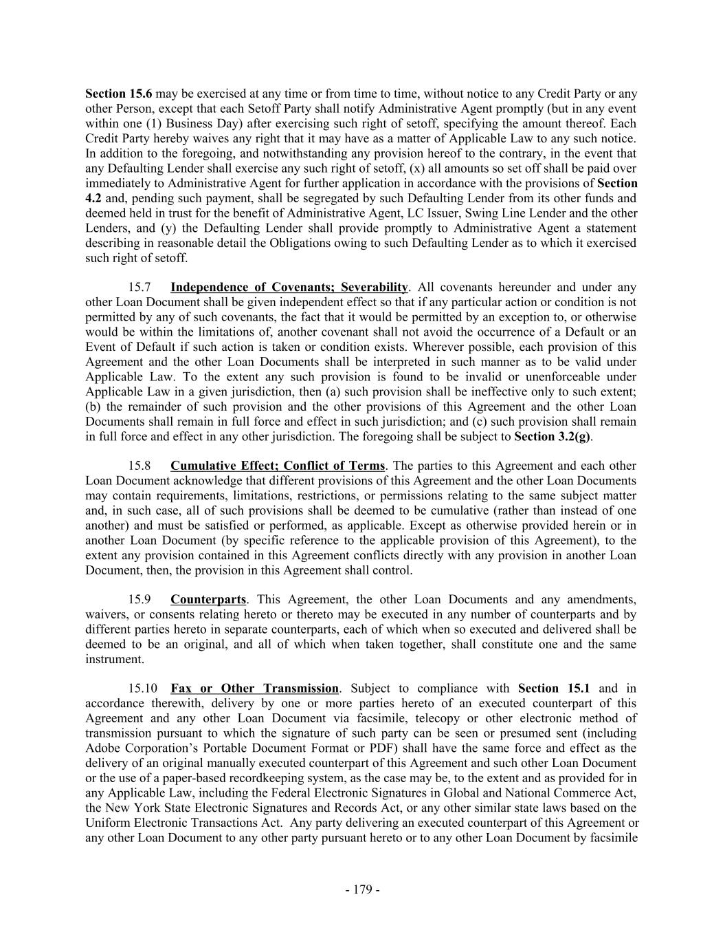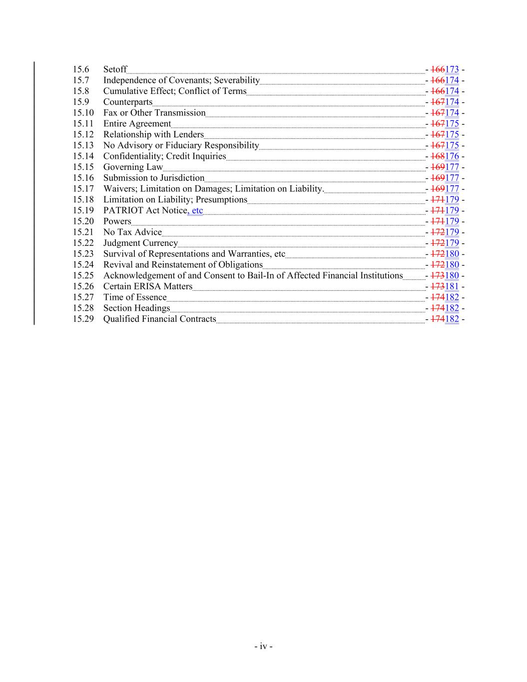 15.6 Setoff - 166173 - 15.7 Independence of Covenants; Severability - 166174 - 15.8 Cumulative Effect; Conflict of Terms - 166174 - 15.9 Counterparts - 167174 - 15.10 Fax or Other Transmission - 167174 - 15.11 Entire Agreement - 167175 - 15.12 Relationship with Lenders - 167175 - 15.13 No Advisory or Fiduciary Responsibility - 167175 - 15.14 Confidentiality; Credit Inquiries - 168176 - 15.15 Governing Law - 169177 - 15.16 Submission to Jurisdiction - 169177 - 15.17 Waivers; Limitation on Damages; Limitation on Liability. - 169177 - 15.18 Limitation on Liability; Presumptions - 171179 - 15.19 PATRIOT Act Notice, etc - 171179 - 15.20 Powers - 171179 - 15.21 No Tax Advice - 172179 - 15.22 Judgment Currency - 172179 - 15.23 Survival of Representations and Warranties, etc - 172180 - 15.24 Revival and Reinstatement of Obligations - 172180 - 15.25 Acknowledgement of and Consent to Bail-In of Affected Financial Institutions - 173180 - 15.26 Certain ERISA Matters - 173181 - 15.27 Time of Essence - 174182 - 15.28 Section Headings - 174182 - 15.29 Qualified Financial Contracts - 174182 - - iv -