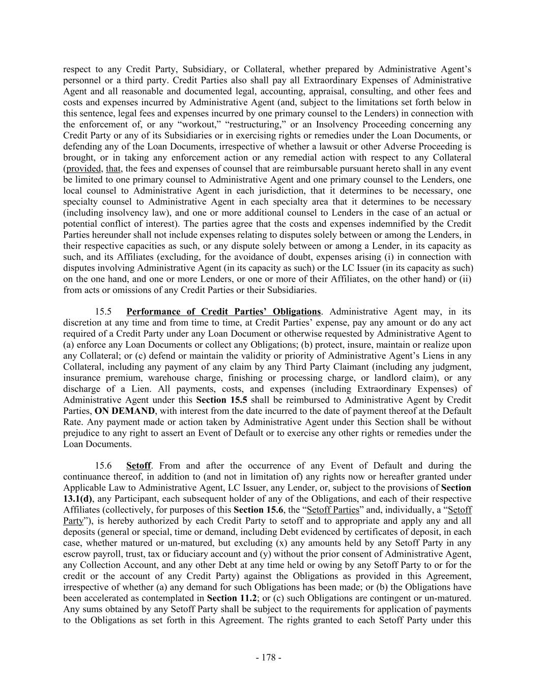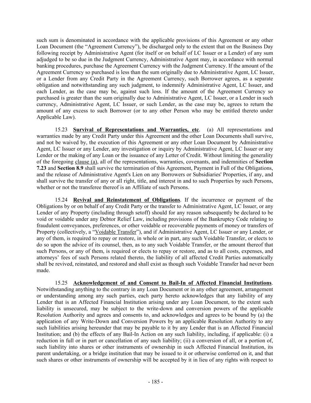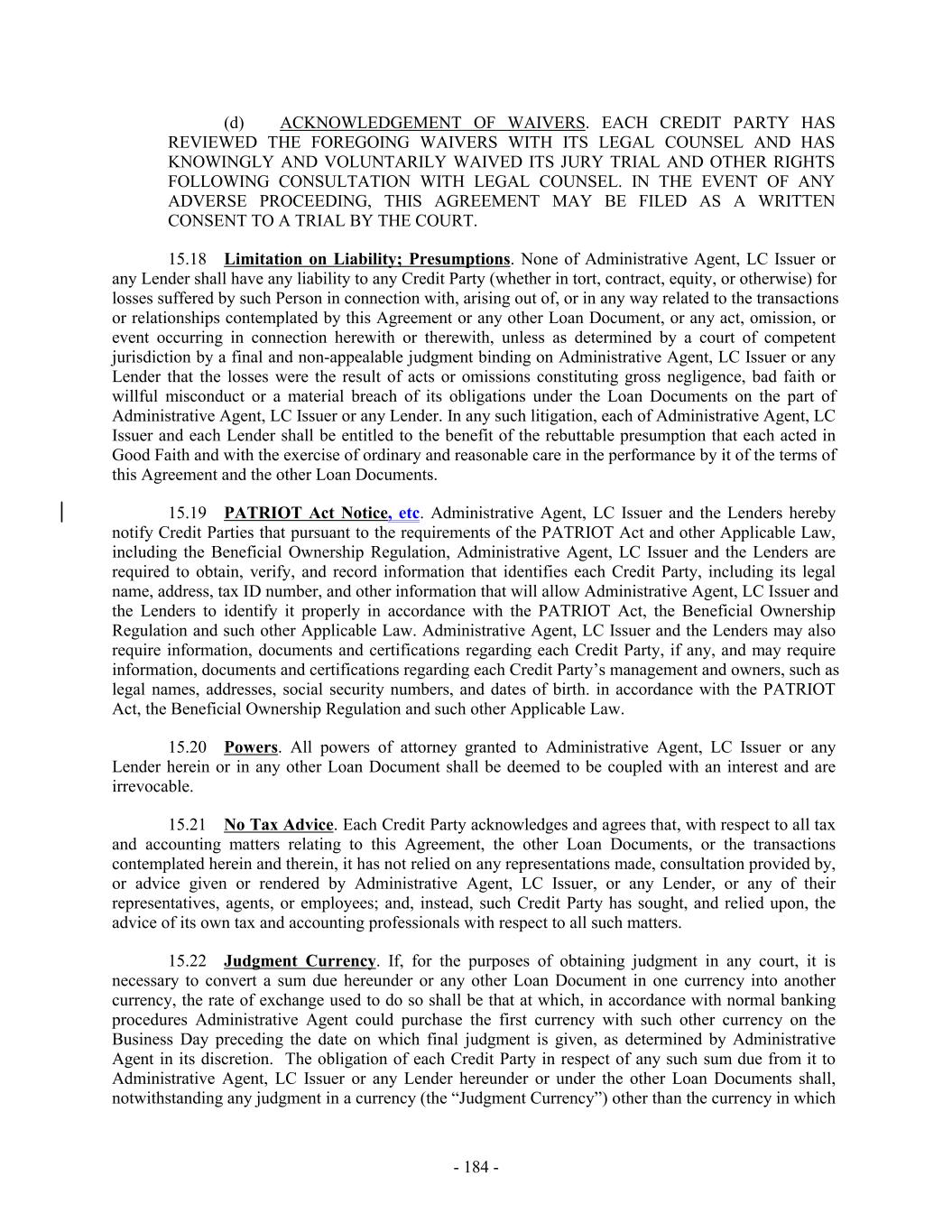 15.6 Setoff - 166173 - 15.7 Independence of Covenants; Severability - 166174 - 15.8 Cumulative Effect; Conflict of Terms - 166174 - 15.9 Counterparts - 167174 - 15.10 Fax or Other Transmission - 167174 - 15.11 Entire Agreement - 167175 - 15.12 Relationship with Lenders - 167175 - 15.13 No Advisory or Fiduciary Responsibility - 167175 - 15.14 Confidentiality; Credit Inquiries - 168176 - 15.15 Governing Law - 169177 - 15.16 Submission to Jurisdiction - 169177 - 15.17 Waivers; Limitation on Damages; Limitation on Liability. - 169177 - 15.18 Limitation on Liability; Presumptions - 171179 - 15.19 PATRIOT Act Notice, etc - 171179 - 15.20 Powers - 171179 - 15.21 No Tax Advice - 172179 - 15.22 Judgment Currency - 172179 - 15.23 Survival of Representations and Warranties, etc - 172180 - 15.24 Revival and Reinstatement of Obligations - 172180 - 15.25 Acknowledgement of and Consent to Bail-In of Affected Financial Institutions - 173180 - 15.26 Certain ERISA Matters - 173181 - 15.27 Time of Essence - 174182 - 15.28 Section Headings - 174182 - 15.29 Qualified Financial Contracts - 174182 - - iv -