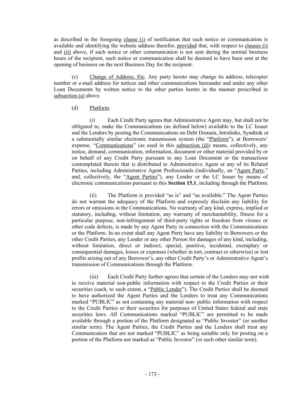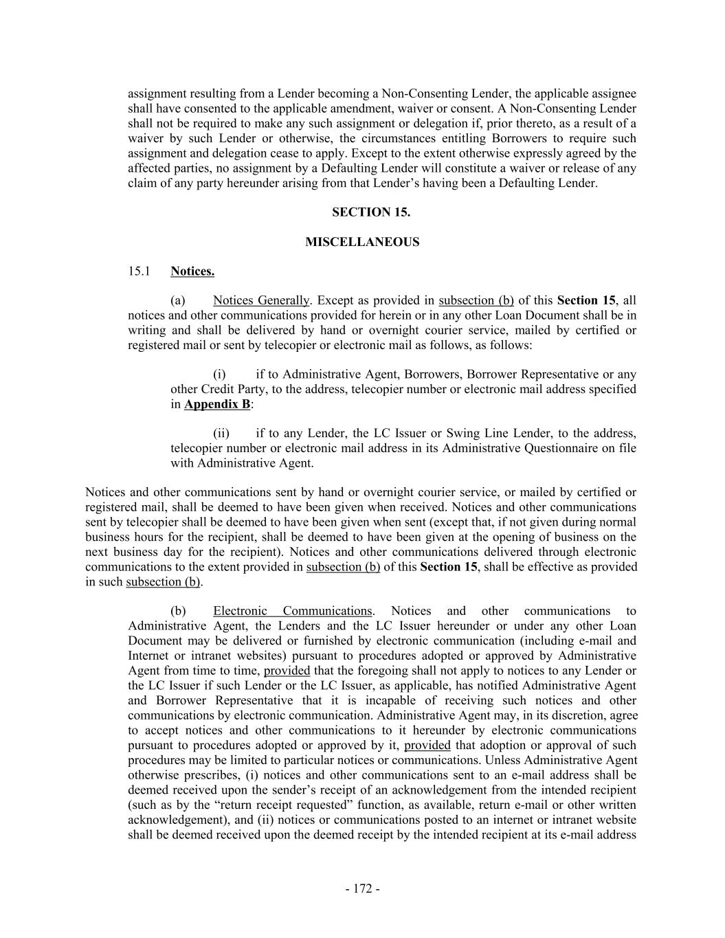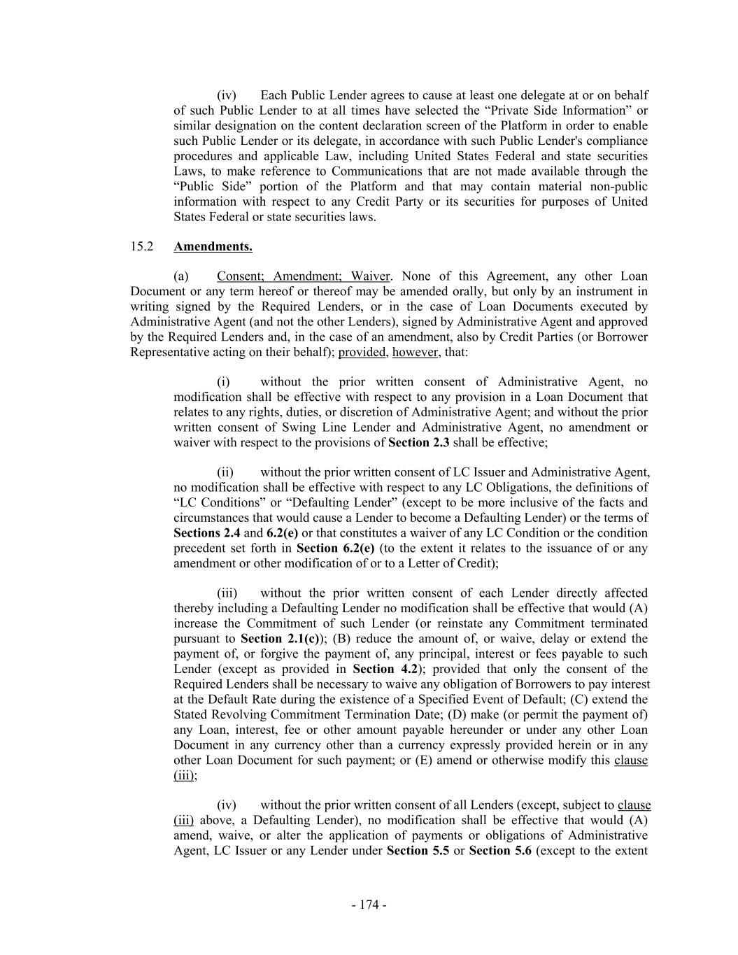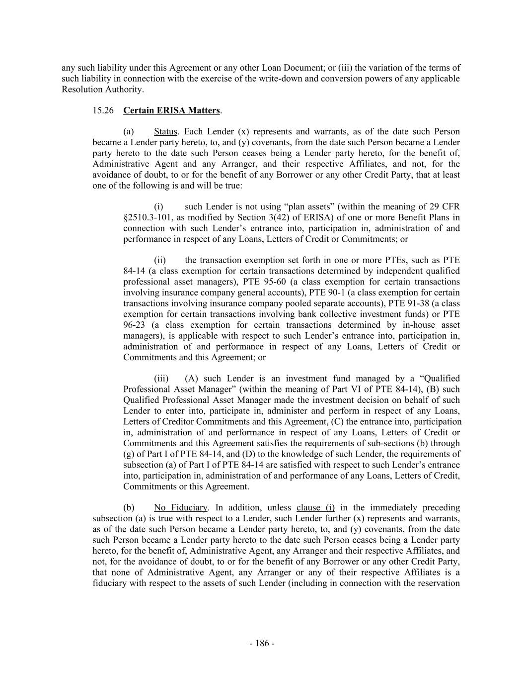 15.6 Setoff - 166173 - 15.7 Independence of Covenants; Severability - 166174 - 15.8 Cumulative Effect; Conflict of Terms - 166174 - 15.9 Counterparts - 167174 - 15.10 Fax or Other Transmission - 167174 - 15.11 Entire Agreement - 167175 - 15.12 Relationship with Lenders - 167175 - 15.13 No Advisory or Fiduciary Responsibility - 167175 - 15.14 Confidentiality; Credit Inquiries - 168176 - 15.15 Governing Law - 169177 - 15.16 Submission to Jurisdiction - 169177 - 15.17 Waivers; Limitation on Damages; Limitation on Liability. - 169177 - 15.18 Limitation on Liability; Presumptions - 171179 - 15.19 PATRIOT Act Notice, etc - 171179 - 15.20 Powers - 171179 - 15.21 No Tax Advice - 172179 - 15.22 Judgment Currency - 172179 - 15.23 Survival of Representations and Warranties, etc - 172180 - 15.24 Revival and Reinstatement of Obligations - 172180 - 15.25 Acknowledgement of and Consent to Bail-In of Affected Financial Institutions - 173180 - 15.26 Certain ERISA Matters - 173181 - 15.27 Time of Essence - 174182 - 15.28 Section Headings - 174182 - 15.29 Qualified Financial Contracts - 174182 - - iv -