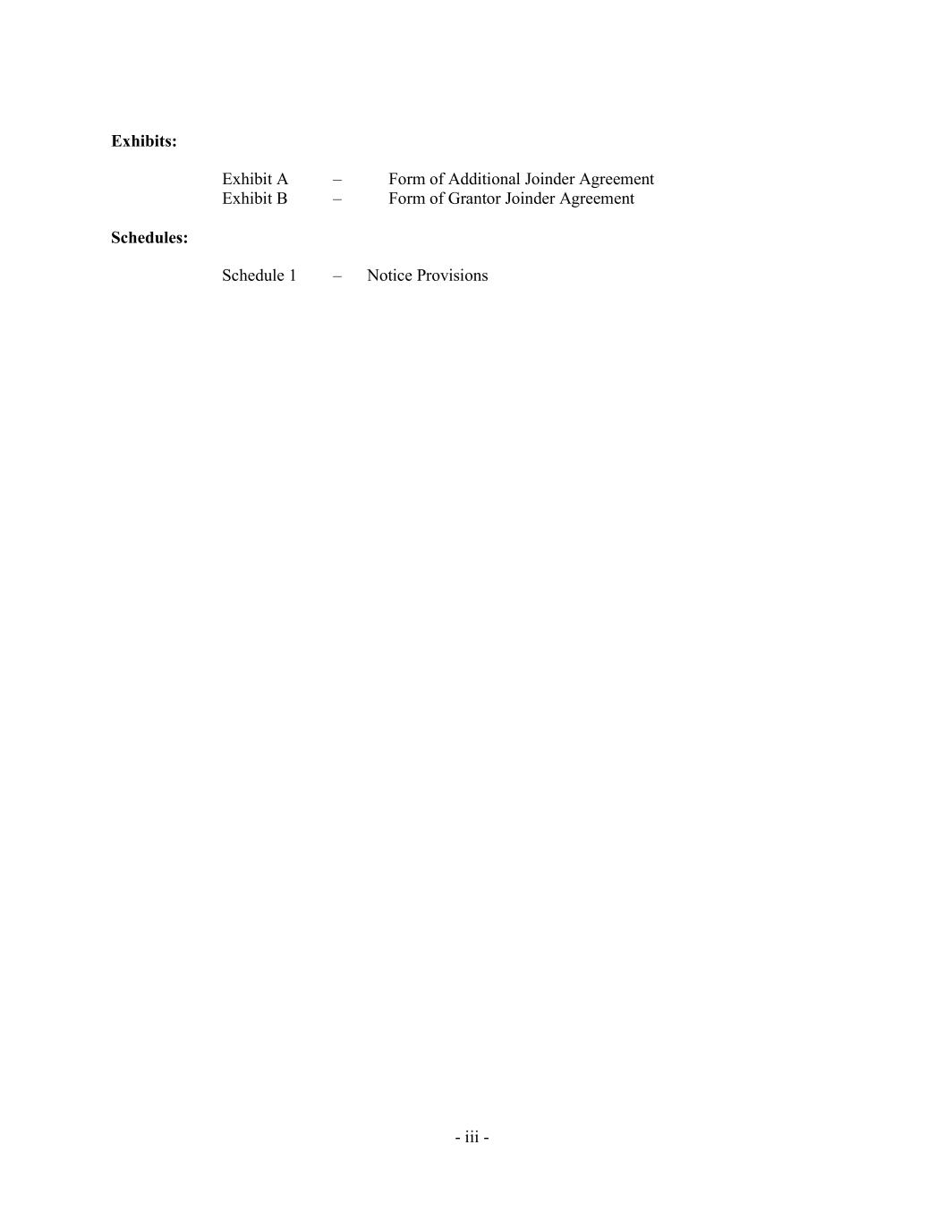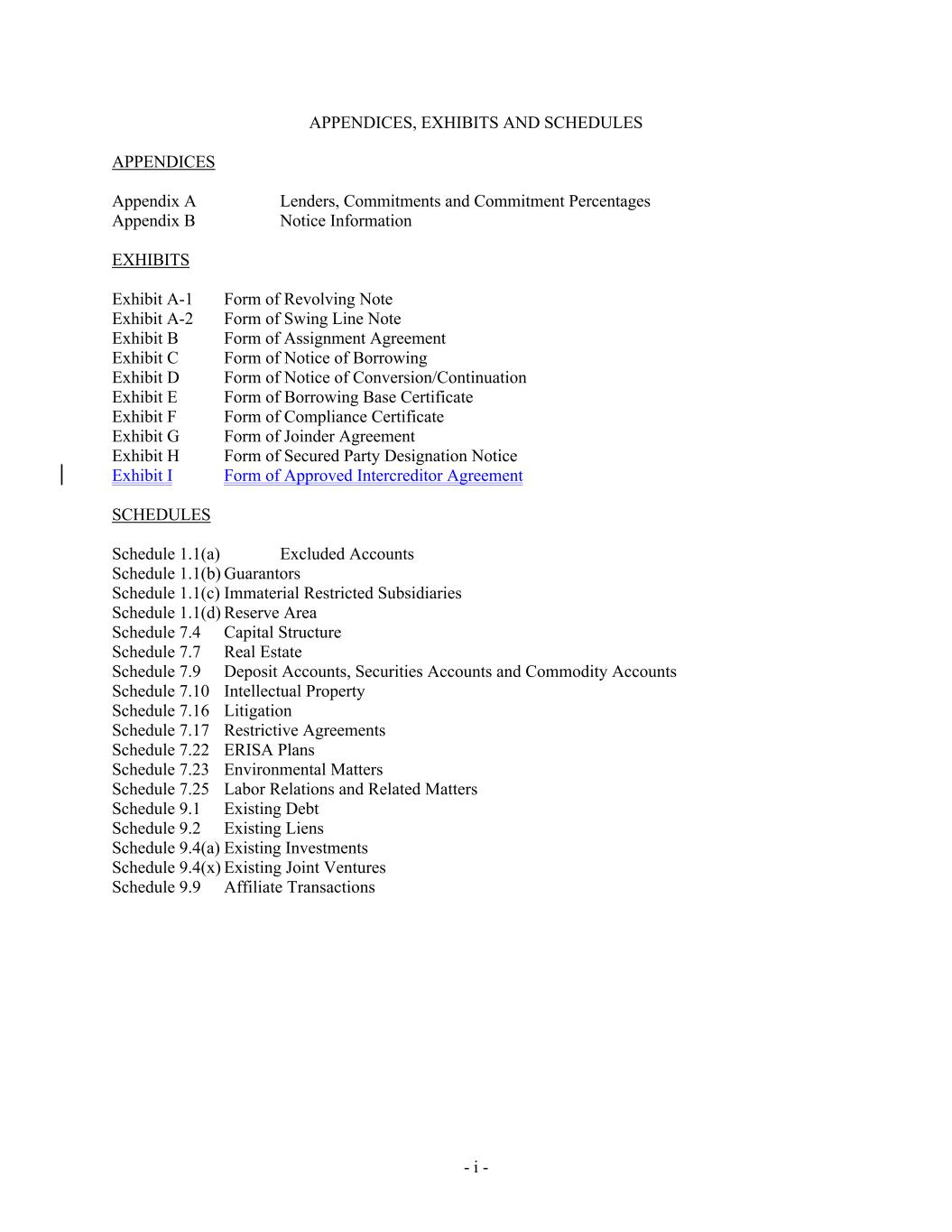 APPENDICES, EXHIBITS AND SCHEDULES APPENDICES Appendix A Lenders, Commitments and Commitment Percentages Appendix B Notice Information EXHIBITS Exhibit A-1 Form of Revolving Note Exhibit A-2 Form of Swing Line Note Exhibit B Form of Assignment Agreement Exhibit C Form of Notice of Borrowing Exhibit D Form of Notice of Conversion/Continuation Exhibit E Form of Borrowing Base Certificate Exhibit F Form of Compliance Certificate Exhibit G Form of Joinder Agreement Exhibit H Form of Secured Party Designation Notice Exhibit I Form of Approved Intercreditor Agreement SCHEDULES Schedule 1.1(a) Excluded Accounts Schedule 1.1(b) Guarantors Schedule 1.1(c) Immaterial Restricted Subsidiaries Schedule 1.1(d) Reserve Area Schedule 7.4 Capital Structure Schedule 7.7 Real Estate Schedule 7.9 Deposit Accounts, Securities Accounts and Commodity Accounts Schedule 7.10 Intellectual Property Schedule 7.16 Litigation Schedule 7.17 Restrictive Agreements Schedule 7.22 ERISA Plans Schedule 7.23 Environmental Matters Schedule 7.25 Labor Relations and Related Matters Schedule 9.1 Existing Debt Schedule 9.2 Existing Liens Schedule 9.4(a) Existing Investments Schedule 9.4(x) Existing Joint Ventures Schedule 9.9 Affiliate Transactions - i -