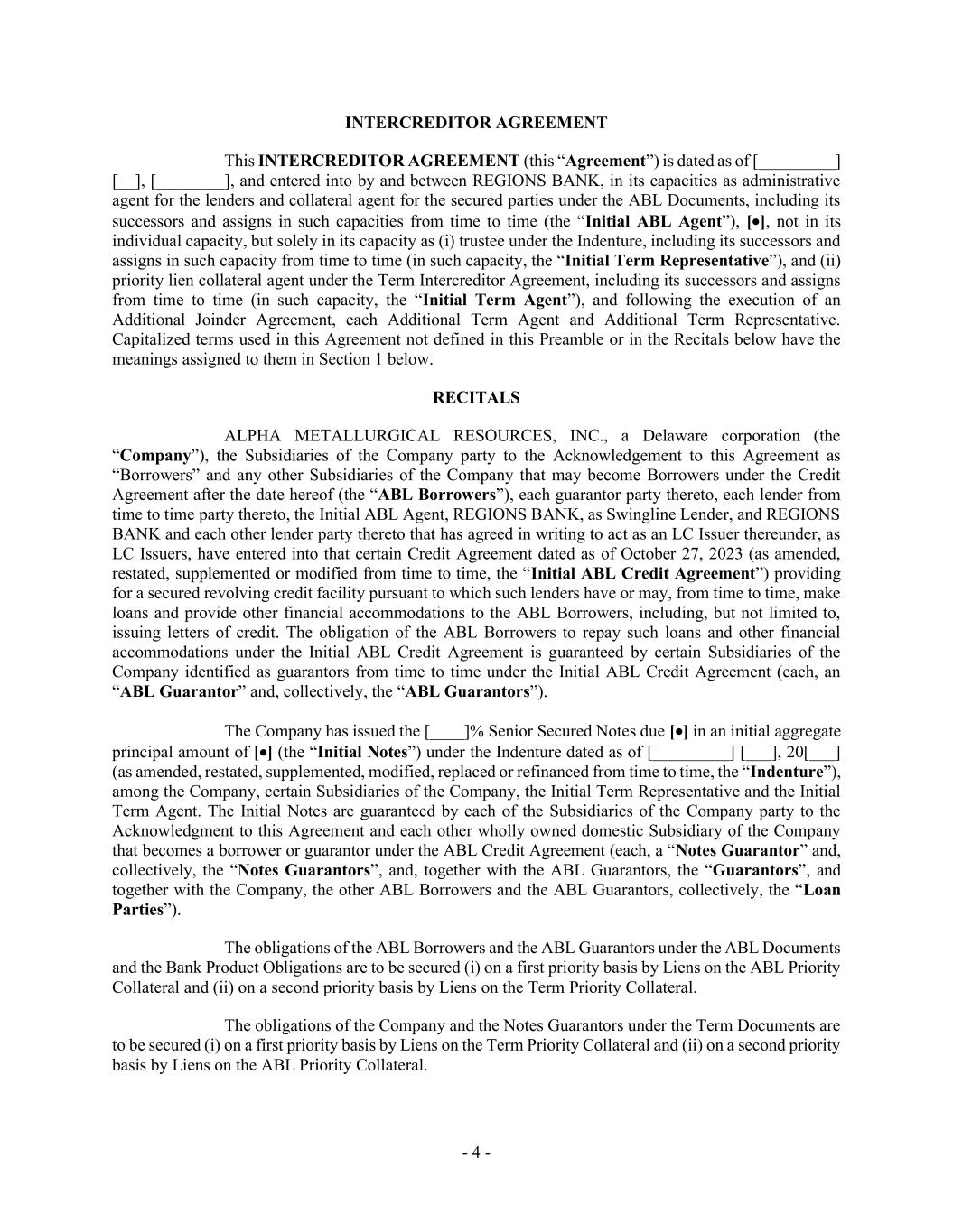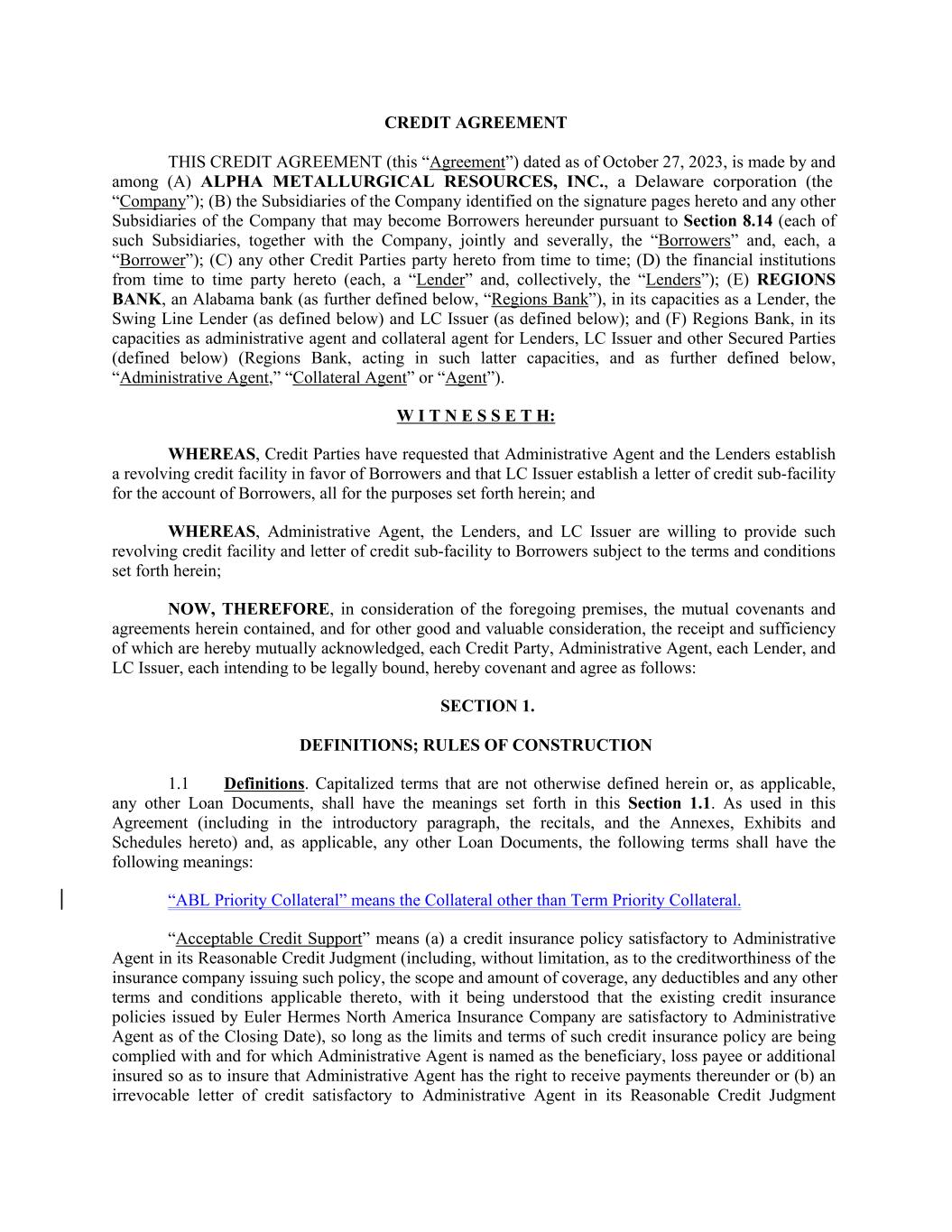 CREDIT AGREEMENT THIS CREDIT AGREEMENT (this “Agreement”) dated as of October 27, 2023, is made by and among (A) ALPHA METALLURGICAL RESOURCES, INC., a Delaware corporation (the “Company”); (B) the Subsidiaries of the Company identified on the signature pages hereto and any other Subsidiaries of the Company that may become Borrowers hereunder pursuant to Section 8.14 (each of such Subsidiaries, together with the Company, jointly and severally, the “Borrowers” and, each, a “Borrower”); (C) any other Credit Parties party hereto from time to time; (D) the financial institutions from time to time party hereto (each, a “Lender” and, collectively, the “Lenders”); (E) REGIONS BANK, an Alabama bank (as further defined below, “Regions Bank”), in its capacities as a Lender, the Swing Line Lender (as defined below) and LC Issuer (as defined below); and (F) Regions Bank, in its capacities as administrative agent and collateral agent for Lenders, LC Issuer and other Secured Parties (defined below) (Regions Bank, acting in such latter capacities, and as further defined below, “Administrative Agent,” “Collateral Agent” or “Agent”). W I T N E S S E T H: WHEREAS, Credit Parties have requested that Administrative Agent and the Lenders establish a revolving credit facility in favor of Borrowers and that LC Issuer establish a letter of credit sub-facility for the account of Borrowers, all for the purposes set forth herein; and WHEREAS, Administrative Agent, the Lenders, and LC Issuer are willing to provide such revolving credit facility and letter of credit sub-facility to Borrowers subject to the terms and conditions set forth herein; NOW, THEREFORE, in consideration of the foregoing premises, the mutual covenants and agreements herein contained, and for other good and valuable consideration, the receipt and sufficiency of which are hereby mutually acknowledged, each Credit Party, Administrative Agent, each Lender, and LC Issuer, each intending to be legally bound, hereby covenant and agree as follows: SECTION 1. DEFINITIONS; RULES OF CONSTRUCTION 1.1 Definitions. Capitalized terms that are not otherwise defined herein or, as applicable, any other Loan Documents, shall have the meanings set forth in this Section 1.1. As used in this Agreement (including in the introductory paragraph, the recitals, and the Annexes, Exhibits and Schedules hereto) and, as applicable, any other Loan Documents, the following terms shall have the following meanings: “ABL Priority Collateral” means the Collateral other than Term Priority Collateral. “Acceptable Credit Support” means (a) a credit insurance policy satisfactory to Administrative Agent in its Reasonable Credit Judgment (including, without limitation, as to the creditworthiness of the insurance company issuing such policy, the scope and amount of coverage, any deductibles and any other terms and conditions applicable thereto, with it being understood that the existing credit insurance policies issued by Euler Hermes North America Insurance Company are satisfactory to Administrative Agent as of the Closing Date), so long as the limits and terms of such credit insurance policy are being complied with and for which Administrative Agent is named as the beneficiary, loss payee or additional insured so as to insure that Administrative Agent has the right to receive payments thereunder or (b) an irrevocable letter of credit satisfactory to Administrative Agent in its Reasonable Credit Judgment