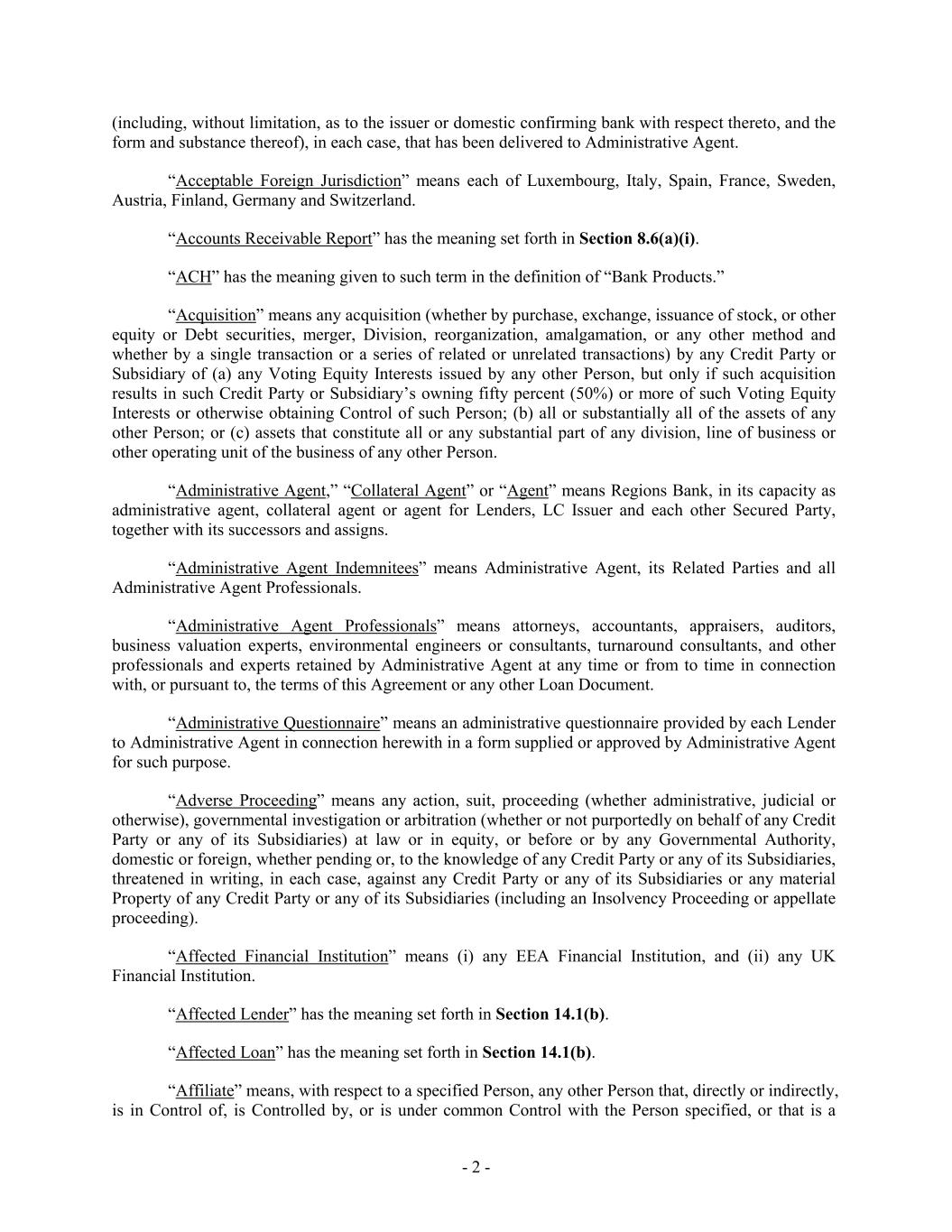 (including, without limitation, as to the issuer or domestic confirming bank with respect thereto, and the form and substance thereof), in each case, that has been delivered to Administrative Agent. “Acceptable Foreign Jurisdiction” means each of Luxembourg, Italy, Spain, France, Sweden, Austria, Finland, Germany and Switzerland. “Accounts Receivable Report” has the meaning set forth in Section 8.6(a)(i). “ACH” has the meaning given to such term in the definition of “Bank Products.” “Acquisition” means any acquisition (whether by purchase, exchange, issuance of stock, or other equity or Debt securities, merger, Division, reorganization, amalgamation, or any other method and whether by a single transaction or a series of related or unrelated transactions) by any Credit Party or Subsidiary of (a) any Voting Equity Interests issued by any other Person, but only if such acquisition results in such Credit Party or Subsidiary’s owning fifty percent (50%) or more of such Voting Equity Interests or otherwise obtaining Control of such Person; (b) all or substantially all of the assets of any other Person; or (c) assets that constitute all or any substantial part of any division, line of business or other operating unit of the business of any other Person. “Administrative Agent,” “Collateral Agent” or “Agent” means Regions Bank, in its capacity as administrative agent, collateral agent or agent for Lenders, LC Issuer and each other Secured Party, together with its successors and assigns. “Administrative Agent Indemnitees” means Administrative Agent, its Related Parties and all Administrative Agent Professionals. “Administrative Agent Professionals” means attorneys, accountants, appraisers, auditors, business valuation experts, environmental engineers or consultants, turnaround consultants, and other professionals and experts retained by Administrative Agent at any time or from to time in connection with, or pursuant to, the terms of this Agreement or any other Loan Document. “Administrative Questionnaire” means an administrative questionnaire provided by each Lender to Administrative Agent in connection herewith in a form supplied or approved by Administrative Agent for such purpose. “Adverse Proceeding” means any action, suit, proceeding (whether administrative, judicial or otherwise), governmental investigation or arbitration (whether or not purportedly on behalf of any Credit Party or any of its Subsidiaries) at law or in equity, or before or by any Governmental Authority, domestic or foreign, whether pending or, to the knowledge of any Credit Party or any of its Subsidiaries, threatened in writing, in each case, against any Credit Party or any of its Subsidiaries or any material Property of any Credit Party or any of its Subsidiaries (including an Insolvency Proceeding or appellate proceeding). “Affected Financial Institution” means (i) any EEA Financial Institution, and (ii) any UK Financial Institution. “Affected Lender” has the meaning set forth in Section 14.1(b). “Affected Loan” has the meaning set forth in Section 14.1(b). “Affiliate” means, with respect to a specified Person, any other Person that, directly or indirectly, is in Control of, is Controlled by, or is under common Control with the Person specified, or that is a - 2 -