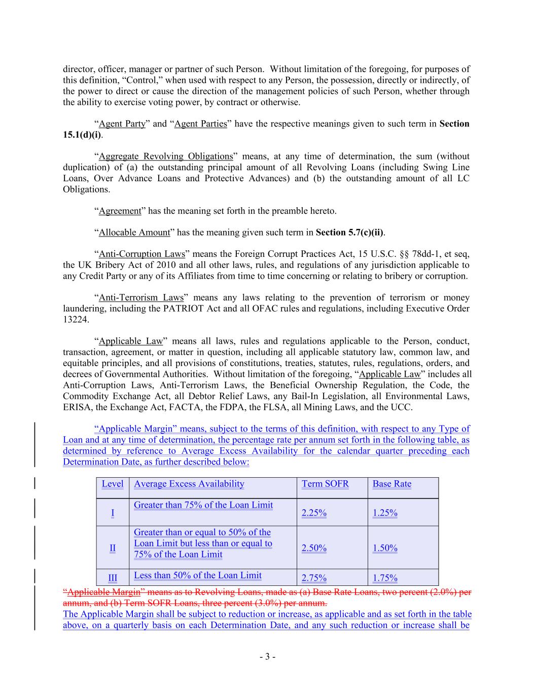- 3 - 1.25% Term SOFR II Base Rate Greater than or equal to 50% of the Loan Limit but less than or equal to 75% of the Loan Limit 2.50% 1.50% Level I III Less than 50% of the Loan Limit Greater than 75% of the Loan Limit 2.75% Average Excess Availability 1.75% 2.25% “Applicable Margin” means as to Revolving Loans, made as (a) Base Rate Loans, two percent (2.0%) per annum, and (b) Term SOFR Loans, three percent (3.0%) per annum. The Applicable Margin shall be subject to reduction or increase, as applicable and as set forth in the table above, on a quarterly basis on each Determination Date, and any such reduction or increase shall be director, officer, manager or partner of such Person. Without limitation of the foregoing, for purposes of this definition, “Control,” when used with respect to any Person, the possession, directly or indirectly, of the power to direct or cause the direction of the management policies of such Person, whether through the ability to exercise voting power, by contract or otherwise. “Agent Party” and “Agent Parties” have the respective meanings given to such term in Section 15.1(d)(i). “Aggregate Revolving Obligations” means, at any time of determination, the sum (without duplication) of (a) the outstanding principal amount of all Revolving Loans (including Swing Line Loans, Over Advance Loans and Protective Advances) and (b) the outstanding amount of all LC Obligations. “Agreement” has the meaning set forth in the preamble hereto. “Allocable Amount” has the meaning given such term in Section 5.7(c)(ii). “Anti-Corruption Laws” means the Foreign Corrupt Practices Act, 15 U.S.C. §§ 78dd-1, et seq, the UK Bribery Act of 2010 and all other laws, rules, and regulations of any jurisdiction applicable to any Credit Party or any of its Affiliates from time to time concerning or relating to bribery or corruption. “Anti-Terrorism Laws” means any laws relating to the prevention of terrorism or money laundering, including the PATRIOT Act and all OFAC rules and regulations, including Executive Order 13224. “Applicable Law” means all laws, rules and regulations applicable to the Person, conduct, transaction, agreement, or matter in question, including all applicable statutory law, common law, and equitable principles, and all provisions of constitutions, treaties, statutes, rules, regulations, orders, and decrees of Governmental Authorities. Without limitation of the foregoing, “Applicable Law” includes all Anti-Corruption Laws, Anti-Terrorism Laws, the Beneficial Ownership Regulation, the Code, the Commodity Exchange Act, all Debtor Relief Laws, any Bail-In Legislation, all Environmental Laws, ERISA, the Exchange Act, FACTA, the FDPA, the FLSA, all Mining Laws, and the UCC. “Applicable Margin” means, subject to the terms of this definition, with respect to any Type of Loan and at any time of determination, the percentage rate per annum set forth in the following table, as determined by reference to Average Excess Availability for the calendar quarter preceding each Determination Date, as further described below:
