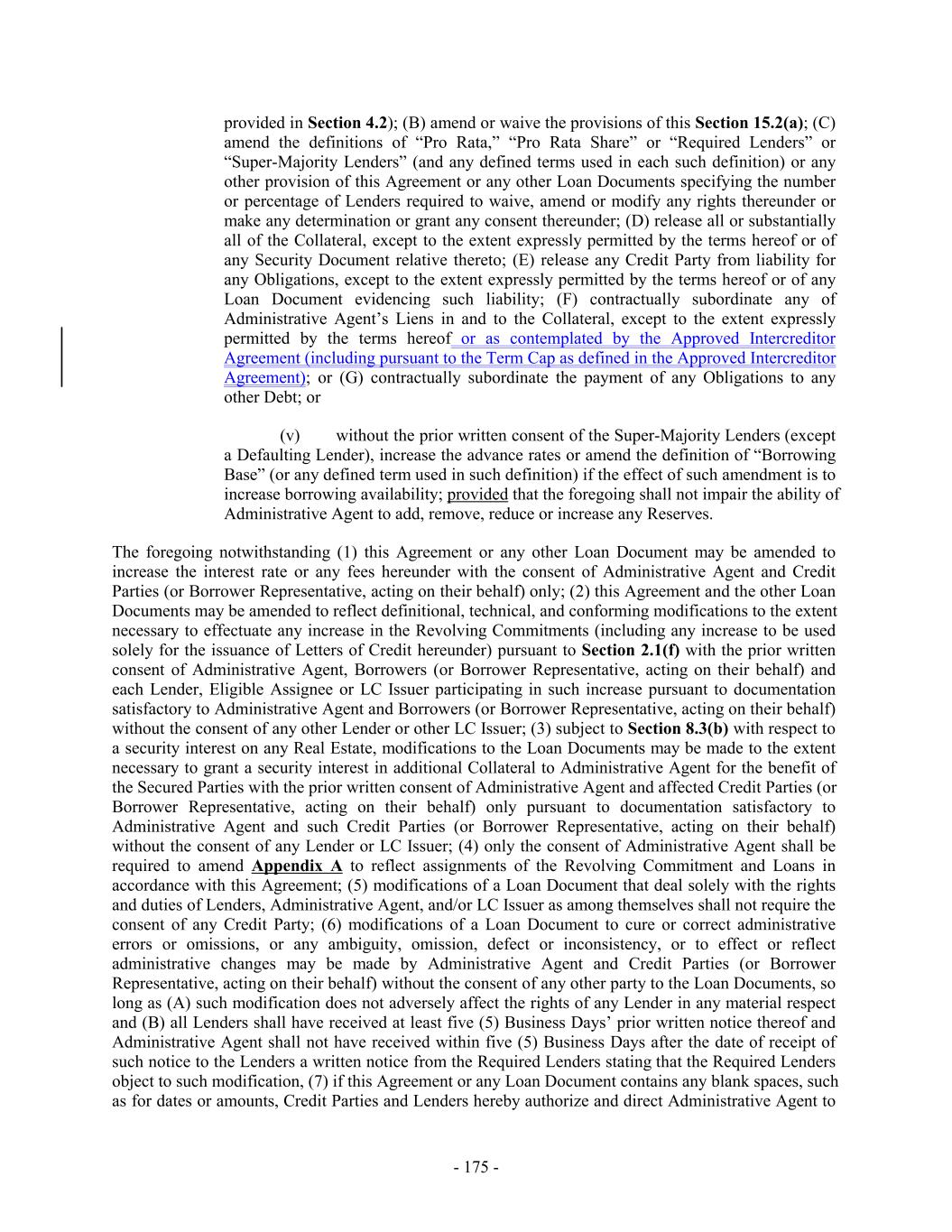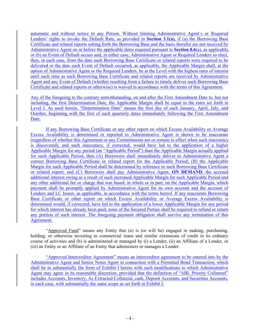 automatic and without notice to any Person. Without limiting Administrative Agent’s or Required Lenders’ rights to invoke the Default Rate, as provided in Section 3.1(a), if (a) the Borrowing Base Certificate and related reports setting forth the Borrowing Base and the basis therefor are not received by Administrative Agent on or before the applicable dates required pursuant to Section 8.6(a), as applicable, or (b) an Event of Default occurs and, in either case, Administrative Agent or Required Lenders so elect, then, in each case, from the date such Borrowing Base Certificate or related reports were required to be delivered or the date such Event of Default occurred, as applicable, the Applicable Margin shall, at the option of Administrative Agent or the Required Lenders, be at the Level with the highest rates of interest until such time as such Borrowing Base Certificate and related reports are received by Administrative Agent and any Event of Default (whether resulting from a failure to timely deliver such Borrowing Base Certificate and related reports or otherwise) is waived in accordance with the terms of this Agreement. Any of the foregoing to the contrary notwithstanding, on and after the First Amendment Date to, but not including, the first Determination Date, the Applicable Margin shall be equal to the rates set forth in Level I. As used herein, “Determination Date” means the first day of each January, April, July, and October, beginning with the first of such quarterly dates immediately following the First Amendment Date. If any Borrowing Base Certificate or any other report on which Excess Availability or Average Excess Availability is determined or reported to Administrative Agent is shown to be inaccurate (regardless of whether this Agreement or any Commitments are or remain in effect when such inaccuracy is discovered), and such inaccuracy, if corrected, would have led to the application of a higher Applicable Margin for any period (an “Applicable Period”) than the Applicable Margin actually applied for such Applicable Period, then (A) Borrowers shall immediately deliver to Administrative Agent a correct Borrowing Base Certificate or related report for the Applicable Period; (B) the Applicable Margin for such Applicable Period shall be determined by reference to such Borrowing Base Certificate or related report; and (C) Borrowers shall pay Administrative Agent, ON DEMAND, the accrued additional interest owing as a result of such increased Applicable Margin for such Applicable Period and any other additional fee or charge that was based, in whole or in part, on the Applicable Margin, which payment shall be promptly applied by Administrative Agent for its own account and the account of Lenders and LC Issuer, as applicable, in accordance with the terms hereof. If any inaccurate Borrowing Base Certificate or other report on which Excess Availability or Average Excess Availability is determined would, if corrected, have led to the application of a lower Applicable Margin for any period for which interest has already been paid, none of the Secured Parties shall be required to refund or return any portion of such interest. The foregoing payment obligation shall survive any termination of this Agreement. “Approved Fund” means any Entity that (a) is (or will be) engaged in making, purchasing, holding, or otherwise investing in commercial loans and similar extensions of credit in its ordinary course of activities and (b) is administered or managed by (i) a Lender, (ii) an Affiliate of a Lender, or (iii) an Entity or an Affiliate of an Entity that administers or manages a Lender. “Approved Intercreditor Agreement” means an intercreditor agreement to be entered into by the Administrative Agent and Senior Notes Agent in connection with a Permitted Bond Transaction, which shall be in substantially the form of Exhibit I hereto with such modifications to which Administrative Agent may agree in its reasonable discretion, provided that the definition of “ABL Priority Collateral” includes Accounts, Inventory, As Extracted Collateral, cash, Deposit Accounts, and Securities Accounts, in each case, with substantially the same scope as set forth in Exhibit I. - 4 -