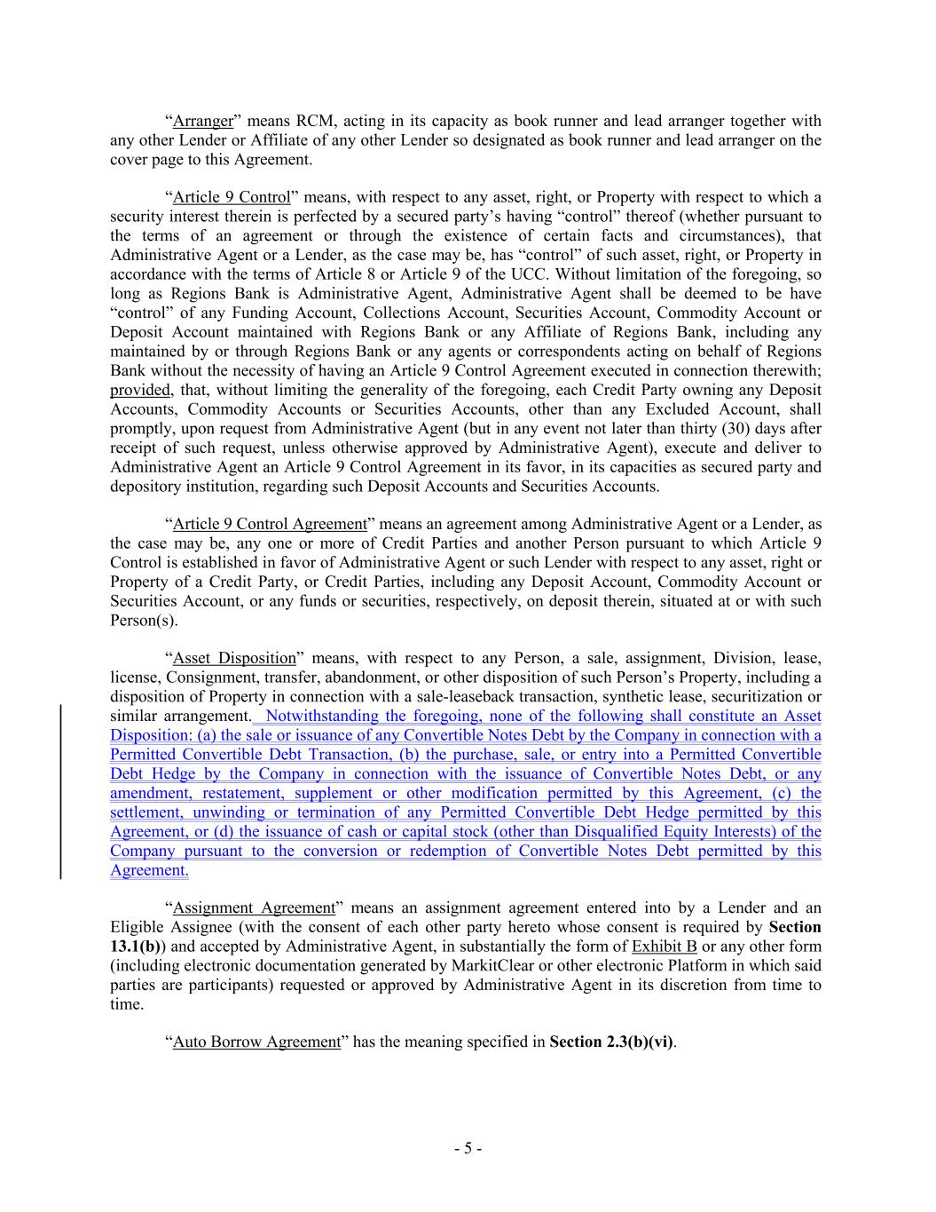 “Arranger” means RCM, acting in its capacity as book runner and lead arranger together with any other Lender or Affiliate of any other Lender so designated as book runner and lead arranger on the cover page to this Agreement. “Article 9 Control” means, with respect to any asset, right, or Property with respect to which a security interest therein is perfected by a secured party’s having “control” thereof (whether pursuant to the terms of an agreement or through the existence of certain facts and circumstances), that Administrative Agent or a Lender, as the case may be, has “control” of such asset, right, or Property in accordance with the terms of Article 8 or Article 9 of the UCC. Without limitation of the foregoing, so long as Regions Bank is Administrative Agent, Administrative Agent shall be deemed to be have “control” of any Funding Account, Collections Account, Securities Account, Commodity Account or Deposit Account maintained with Regions Bank or any Affiliate of Regions Bank, including any maintained by or through Regions Bank or any agents or correspondents acting on behalf of Regions Bank without the necessity of having an Article 9 Control Agreement executed in connection therewith; provided, that, without limiting the generality of the foregoing, each Credit Party owning any Deposit Accounts, Commodity Accounts or Securities Accounts, other than any Excluded Account, shall promptly, upon request from Administrative Agent (but in any event not later than thirty (30) days after receipt of such request, unless otherwise approved by Administrative Agent), execute and deliver to Administrative Agent an Article 9 Control Agreement in its favor, in its capacities as secured party and depository institution, regarding such Deposit Accounts and Securities Accounts. “Article 9 Control Agreement” means an agreement among Administrative Agent or a Lender, as the case may be, any one or more of Credit Parties and another Person pursuant to which Article 9 Control is established in favor of Administrative Agent or such Lender with respect to any asset, right or Property of a Credit Party, or Credit Parties, including any Deposit Account, Commodity Account or Securities Account, or any funds or securities, respectively, on deposit therein, situated at or with such Person(s). “Asset Disposition” means, with respect to any Person, a sale, assignment, Division, lease, license, Consignment, transfer, abandonment, or other disposition of such Person’s Property, including a disposition of Property in connection with a sale-leaseback transaction, synthetic lease, securitization or similar arrangement. Notwithstanding the foregoing, none of the following shall constitute an Asset Disposition: (a) the sale or issuance of any Convertible Notes Debt by the Company in connection with a Permitted Convertible Debt Transaction, (b) the purchase, sale, or entry into a Permitted Convertible Debt Hedge by the Company in connection with the issuance of Convertible Notes Debt, or any amendment, restatement, supplement or other modification permitted by this Agreement, (c) the settlement, unwinding or termination of any Permitted Convertible Debt Hedge permitted by this Agreement, or (d) the issuance of cash or capital stock (other than Disqualified Equity Interests) of the Company pursuant to the conversion or redemption of Convertible Notes Debt permitted by this Agreement. “Assignment Agreement” means an assignment agreement entered into by a Lender and an Eligible Assignee (with the consent of each other party hereto whose consent is required by Section 13.1(b)) and accepted by Administrative Agent, in substantially the form of Exhibit B or any other form (including electronic documentation generated by MarkitClear or other electronic Platform in which said parties are participants) requested or approved by Administrative Agent in its discretion from time to time. “Auto Borrow Agreement” has the meaning specified in Section 2.3(b)(vi). - 5 -