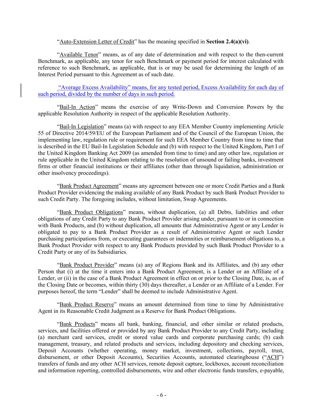 “Auto-Extension Letter of Credit” has the meaning specified in Section 2.4(a)(vi). “Available Tenor” means, as of any date of determination and with respect to the then-current Benchmark, as applicable, any tenor for such Benchmark or payment period for interest calculated with reference to such Benchmark, as applicable, that is or may be used for determining the length of an Interest Period pursuant to this Agreement as of such date. “Average Excess Availability” means, for any tested period, Excess Availability for each day of such period, divided by the number of days in such period. “Bail-In Action” means the exercise of any Write-Down and Conversion Powers by the applicable Resolution Authority in respect of the applicable Resolution Authority. “Bail-In Legislation” means (a) with respect to any EEA Member Country implementing Article 55 of Directive 2014/59/EU of the European Parliament and of the Council of the European Union, the implementing law, regulation rule or requirement for such EEA Member Country from time to time that is described in the EU Bail-In Legislation Schedule and (b) with respect to the United Kingdom, Part I of the United Kingdom Banking Act 2009 (as amended from time to time) and any other law, regulation or rule applicable in the United Kingdom relating to the resolution of unsound or failing banks, investment firms or other financial institutions or their affiliates (other than through liquidation, administration or other insolvency proceedings). “Bank Product Agreement” means any agreement between one or more Credit Parties and a Bank Product Provider evidencing the making available of any Bank Product by such Bank Product Provider to such Credit Party. The foregoing includes, without limitation, Swap Agreements. “Bank Product Obligations” means, without duplication, (a) all Debts, liabilities and other obligations of any Credit Party to any Bank Product Provider arising under, pursuant to or in connection with Bank Products, and (b) without duplication, all amounts that Administrative Agent or any Lender is obligated to pay to a Bank Product Provider as a result of Administrative Agent or such Lender purchasing participations from, or executing guarantees or indemnities or reimbursement obligations to, a Bank Product Provider with respect to any Bank Products provided by such Bank Product Provider to a Credit Party or any of its Subsidiaries. “Bank Product Provider” means (a) any of Regions Bank and its Affiliates, and (b) any other Person that (i) at the time it enters into a Bank Product Agreement, is a Lender or an Affiliate of a Lender, or (ii) in the case of a Bank Product Agreement in effect on or prior to the Closing Date, is, as of the Closing Date or becomes, within thirty (30) days thereafter, a Lender or an Affiliate of a Lender. For purposes hereof, the term “Lender” shall be deemed to include Administrative Agent. “Bank Product Reserve” means an amount determined from time to time by Administrative Agent in its Reasonable Credit Judgment as a Reserve for Bank Product Obligations. “Bank Products” means all bank, banking, financial, and other similar or related products, services, and facilities offered or provided by any Bank Product Provider to any Credit Party, including (a) merchant card services, credit or stored value cards and corporate purchasing cards; (b) cash management, treasury, and related products and services, including depository and checking services, Deposit Accounts (whether operating, money market, investment, collections, payroll, trust, disbursement, or other Deposit Accounts), Securities Accounts, automated clearinghouse (“ACH”) transfers of funds and any other ACH services, remote deposit capture, lockboxes, account reconciliation and information reporting, controlled disbursements, wire and other electronic funds transfers, e-payable, - 6 -