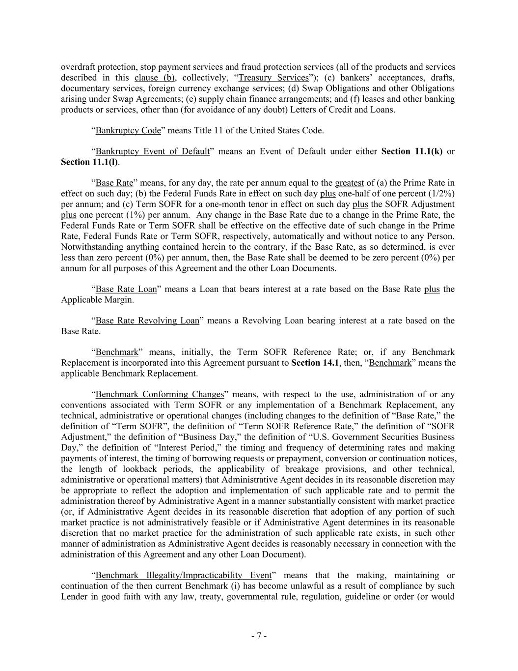 overdraft protection, stop payment services and fraud protection services (all of the products and services described in this clause (b), collectively, “Treasury Services”); (c) bankers’ acceptances, drafts, documentary services, foreign currency exchange services; (d) Swap Obligations and other Obligations arising under Swap Agreements; (e) supply chain finance arrangements; and (f) leases and other banking products or services, other than (for avoidance of any doubt) Letters of Credit and Loans. “Bankruptcy Code” means Title 11 of the United States Code. “Bankruptcy Event of Default” means an Event of Default under either Section 11.1(k) or Section 11.1(l). “Base Rate” means, for any day, the rate per annum equal to the greatest of (a) the Prime Rate in effect on such day; (b) the Federal Funds Rate in effect on such day plus one-half of one percent (1/2%) per annum; and (c) Term SOFR for a one-month tenor in effect on such day plus the SOFR Adjustment plus one percent (1%) per annum. Any change in the Base Rate due to a change in the Prime Rate, the Federal Funds Rate or Term SOFR shall be effective on the effective date of such change in the Prime Rate, Federal Funds Rate or Term SOFR, respectively, automatically and without notice to any Person. Notwithstanding anything contained herein to the contrary, if the Base Rate, as so determined, is ever less than zero percent (0%) per annum, then, the Base Rate shall be deemed to be zero percent (0%) per annum for all purposes of this Agreement and the other Loan Documents. “Base Rate Loan” means a Loan that bears interest at a rate based on the Base Rate plus the Applicable Margin. “Base Rate Revolving Loan” means a Revolving Loan bearing interest at a rate based on the Base Rate. “Benchmark” means, initially, the Term SOFR Reference Rate; or, if any Benchmark Replacement is incorporated into this Agreement pursuant to Section 14.1, then, “Benchmark” means the applicable Benchmark Replacement. “Benchmark Conforming Changes” means, with respect to the use, administration of or any conventions associated with Term SOFR or any implementation of a Benchmark Replacement, any technical, administrative or operational changes (including changes to the definition of “Base Rate,” the definition of “Term SOFR”, the definition of “Term SOFR Reference Rate,” the definition of “SOFR Adjustment,” the definition of “Business Day,” the definition of “U.S. Government Securities Business Day,” the definition of “Interest Period,” the timing and frequency of determining rates and making payments of interest, the timing of borrowing requests or prepayment, conversion or continuation notices, the length of lookback periods, the applicability of breakage provisions, and other technical, administrative or operational matters) that Administrative Agent decides in its reasonable discretion may be appropriate to reflect the adoption and implementation of such applicable rate and to permit the administration thereof by Administrative Agent in a manner substantially consistent with market practice (or, if Administrative Agent decides in its reasonable discretion that adoption of any portion of such market practice is not administratively feasible or if Administrative Agent determines in its reasonable discretion that no market practice for the administration of such applicable rate exists, in such other manner of administration as Administrative Agent decides is reasonably necessary in connection with the administration of this Agreement and any other Loan Document). “Benchmark Illegality/Impracticability Event” means that the making, maintaining or continuation of the then current Benchmark (i) has become unlawful as a result of compliance by such Lender in good faith with any law, treaty, governmental rule, regulation, guideline or order (or would - 7 -