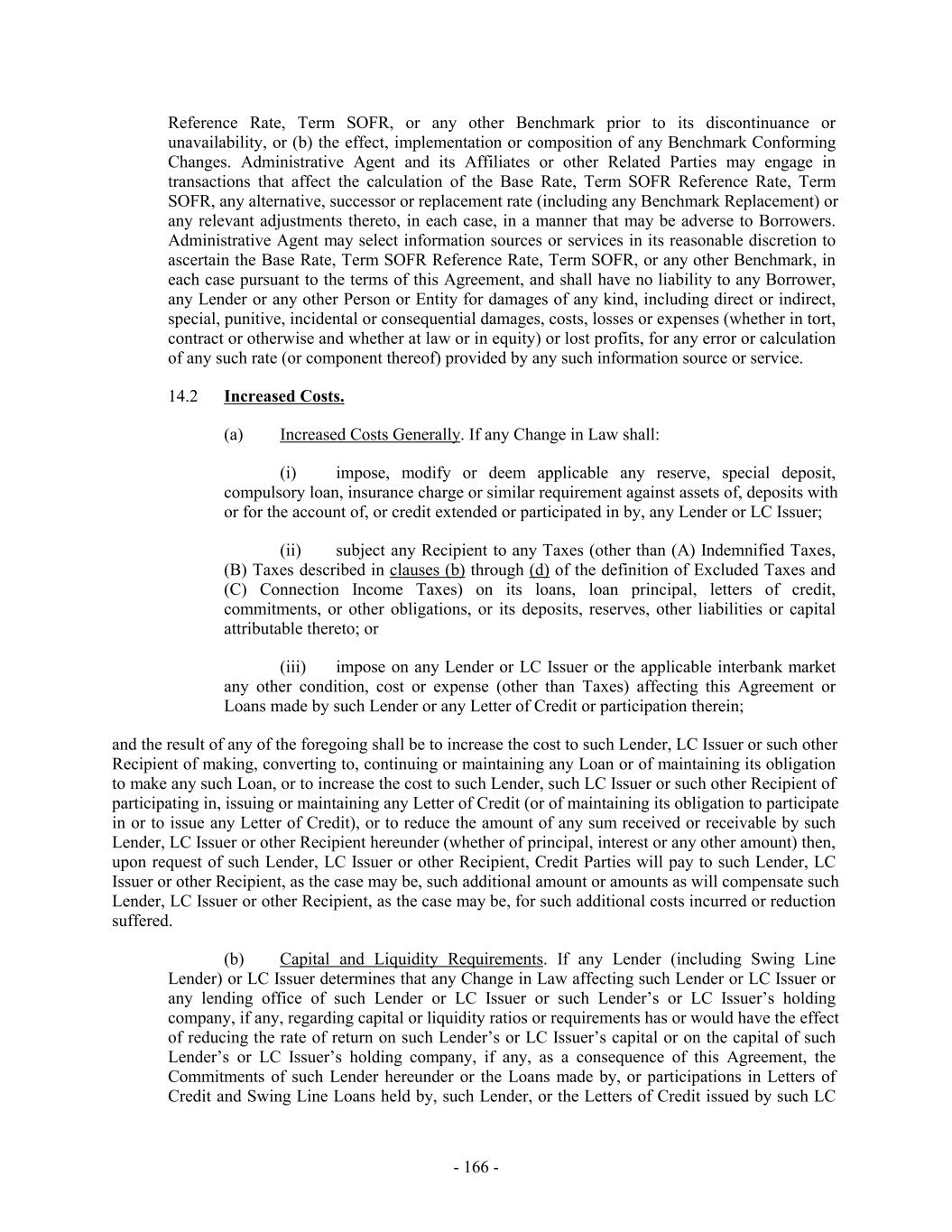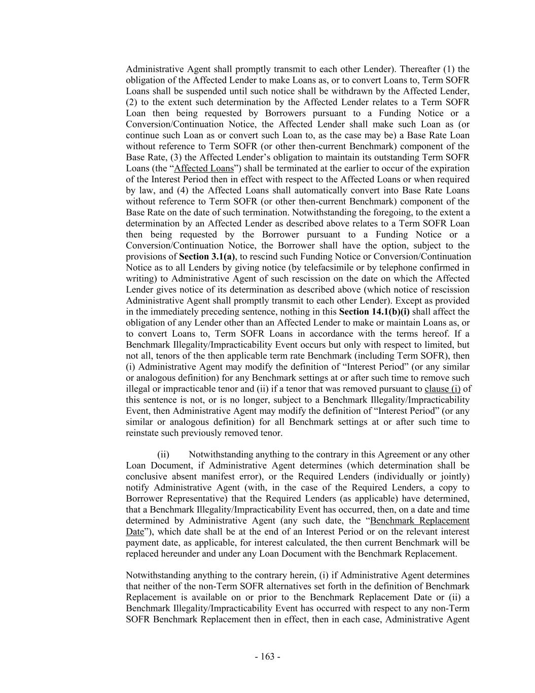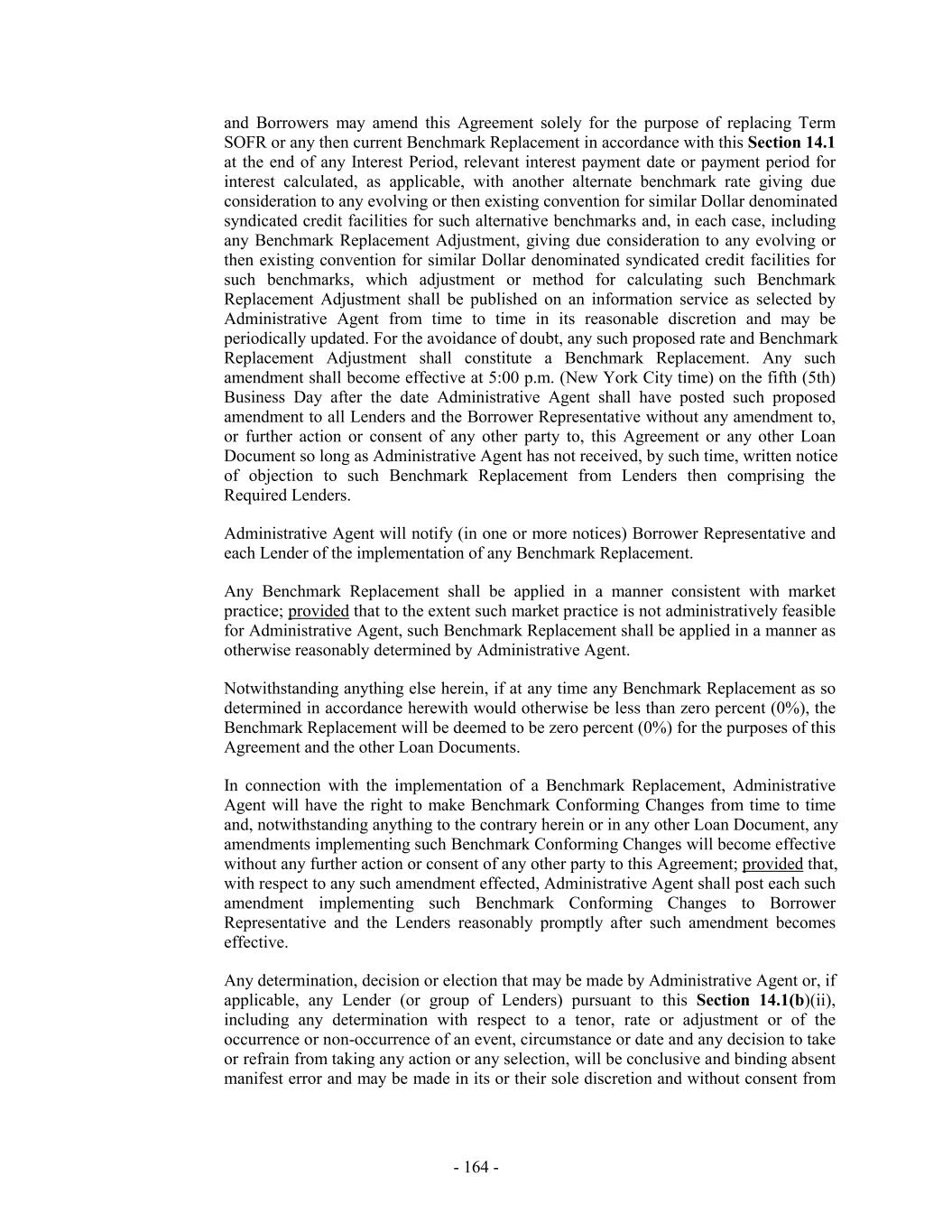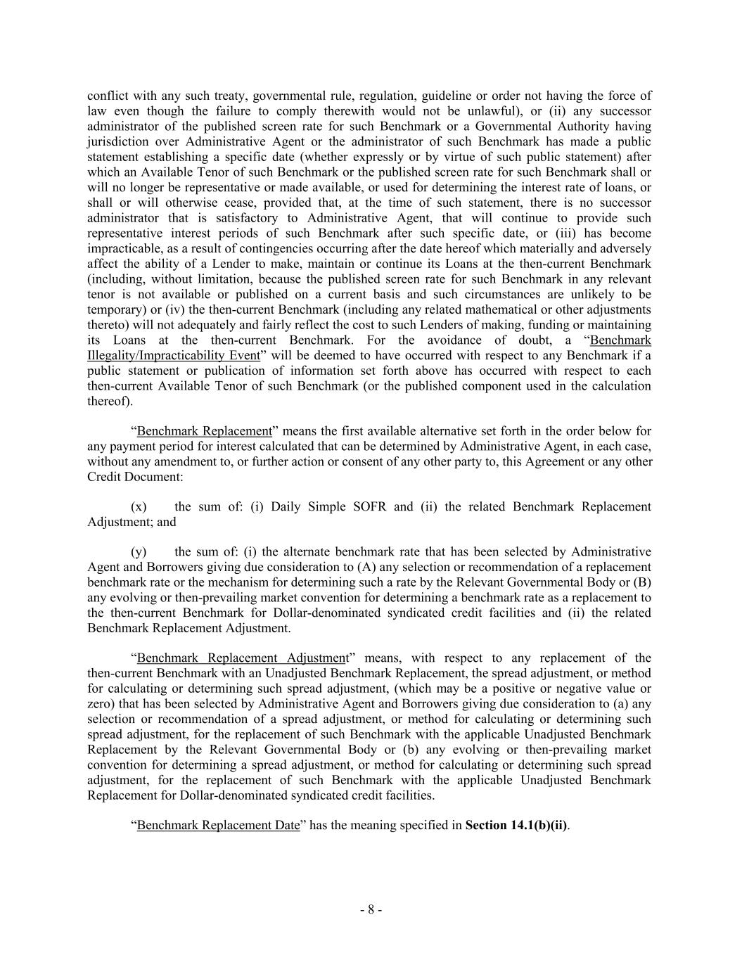 conflict with any such treaty, governmental rule, regulation, guideline or order not having the force of law even though the failure to comply therewith would not be unlawful), or (ii) any successor administrator of the published screen rate for such Benchmark or a Governmental Authority having jurisdiction over Administrative Agent or the administrator of such Benchmark has made a public statement establishing a specific date (whether expressly or by virtue of such public statement) after which an Available Tenor of such Benchmark or the published screen rate for such Benchmark shall or will no longer be representative or made available, or used for determining the interest rate of loans, or shall or will otherwise cease, provided that, at the time of such statement, there is no successor administrator that is satisfactory to Administrative Agent, that will continue to provide such representative interest periods of such Benchmark after such specific date, or (iii) has become impracticable, as a result of contingencies occurring after the date hereof which materially and adversely affect the ability of a Lender to make, maintain or continue its Loans at the then-current Benchmark (including, without limitation, because the published screen rate for such Benchmark in any relevant tenor is not available or published on a current basis and such circumstances are unlikely to be temporary) or (iv) the then-current Benchmark (including any related mathematical or other adjustments thereto) will not adequately and fairly reflect the cost to such Lenders of making, funding or maintaining its Loans at the then-current Benchmark. For the avoidance of doubt, a “Benchmark Illegality/Impracticability Event” will be deemed to have occurred with respect to any Benchmark if a public statement or publication of information set forth above has occurred with respect to each then-current Available Tenor of such Benchmark (or the published component used in the calculation thereof). “Benchmark Replacement” means the first available alternative set forth in the order below for any payment period for interest calculated that can be determined by Administrative Agent, in each case, without any amendment to, or further action or consent of any other party to, this Agreement or any other Credit Document: (x) the sum of: (i) Daily Simple SOFR and (ii) the related Benchmark Replacement Adjustment; and (y) the sum of: (i) the alternate benchmark rate that has been selected by Administrative Agent and Borrowers giving due consideration to (A) any selection or recommendation of a replacement benchmark rate or the mechanism for determining such a rate by the Relevant Governmental Body or (B) any evolving or then-prevailing market convention for determining a benchmark rate as a replacement to the then-current Benchmark for Dollar-denominated syndicated credit facilities and (ii) the related Benchmark Replacement Adjustment. “Benchmark Replacement Adjustment” means, with respect to any replacement of the then-current Benchmark with an Unadjusted Benchmark Replacement, the spread adjustment, or method for calculating or determining such spread adjustment, (which may be a positive or negative value or zero) that has been selected by Administrative Agent and Borrowers giving due consideration to (a) any selection or recommendation of a spread adjustment, or method for calculating or determining such spread adjustment, for the replacement of such Benchmark with the applicable Unadjusted Benchmark Replacement by the Relevant Governmental Body or (b) any evolving or then-prevailing market convention for determining a spread adjustment, or method for calculating or determining such spread adjustment, for the replacement of such Benchmark with the applicable Unadjusted Benchmark Replacement for Dollar-denominated syndicated credit facilities. “Benchmark Replacement Date” has the meaning specified in Section 14.1(b)(ii). - 8 -