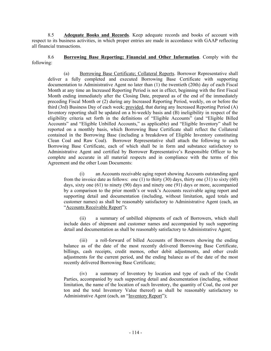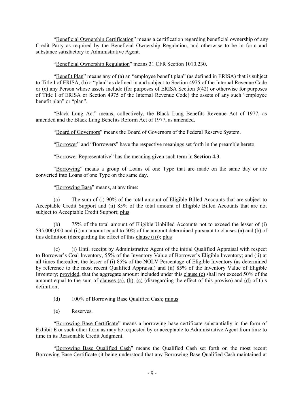 “Beneficial Ownership Certification” means a certification regarding beneficial ownership of any Credit Party as required by the Beneficial Ownership Regulation, and otherwise to be in form and substance satisfactory to Administrative Agent. “Beneficial Ownership Regulation” means 31 CFR Section 1010.230. “Benefit Plan” means any of (a) an “employee benefit plan” (as defined in ERISA) that is subject to Title I of ERISA, (b) a “plan” as defined in and subject to Section 4975 of the Internal Revenue Code or (c) any Person whose assets include (for purposes of ERISA Section 3(42) or otherwise for purposes of Title I of ERISA or Section 4975 of the Internal Revenue Code) the assets of any such “employee benefit plan” or “plan”. “Black Lung Act” means, collectively, the Black Lung Benefits Revenue Act of 1977, as amended and the Black Lung Benefits Reform Act of 1977, as amended. “Board of Governors” means the Board of Governors of the Federal Reserve System. “Borrower” and “Borrowers” have the respective meanings set forth in the preamble hereto. “Borrower Representative” has the meaning given such term in Section 4.3. “Borrowing” means a group of Loans of one Type that are made on the same day or are converted into Loans of one Type on the same day. “Borrowing Base” means, at any time: (a) The sum of (i) 90% of the total amount of Eligible Billed Accounts that are subject to Acceptable Credit Support and (ii) 85% of the total amount of Eligible Billed Accounts that are not subject to Acceptable Credit Support; plus (b) 75% of the total amount of Eligible Unbilled Accounts not to exceed the lesser of (i) $35,000,000 and (ii) an amount equal to 50% of the amount determined pursuant to clauses (a) and (b) of this definition (disregarding the effect of this clause (ii)); plus (c) (i) Until receipt by Administrative Agent of the initial Qualified Appraisal with respect to Borrower’s Coal Inventory, 55% of the Inventory Value of Borrower’s Eligible Inventory; and (ii) at all times thereafter, the lesser of (i) 85% of the NOLV Percentage of Eligible Inventory (as determined by reference to the most recent Qualified Appraisal) and (ii) 85% of the Inventory Value of Eligible Inventory; provided, that the aggregate amount included under this clause (c) shall not exceed 50% of the amount equal to the sum of clauses (a), (b), (c) (disregarding the effect of this proviso) and (d) of this definition; (d) 100% of Borrowing Base Qualified Cash; minus (e) Reserves. “Borrowing Base Certificate” means a borrowing base certificate substantially in the form of Exhibit E or such other form as may be requested by or acceptable to Administrative Agent from time to time in its Reasonable Credit Judgment. “Borrowing Base Qualified Cash” means the Qualified Cash set forth on the most recent Borrowing Base Certificate (it being understood that any Borrowing Base Qualified Cash maintained at - 9 -