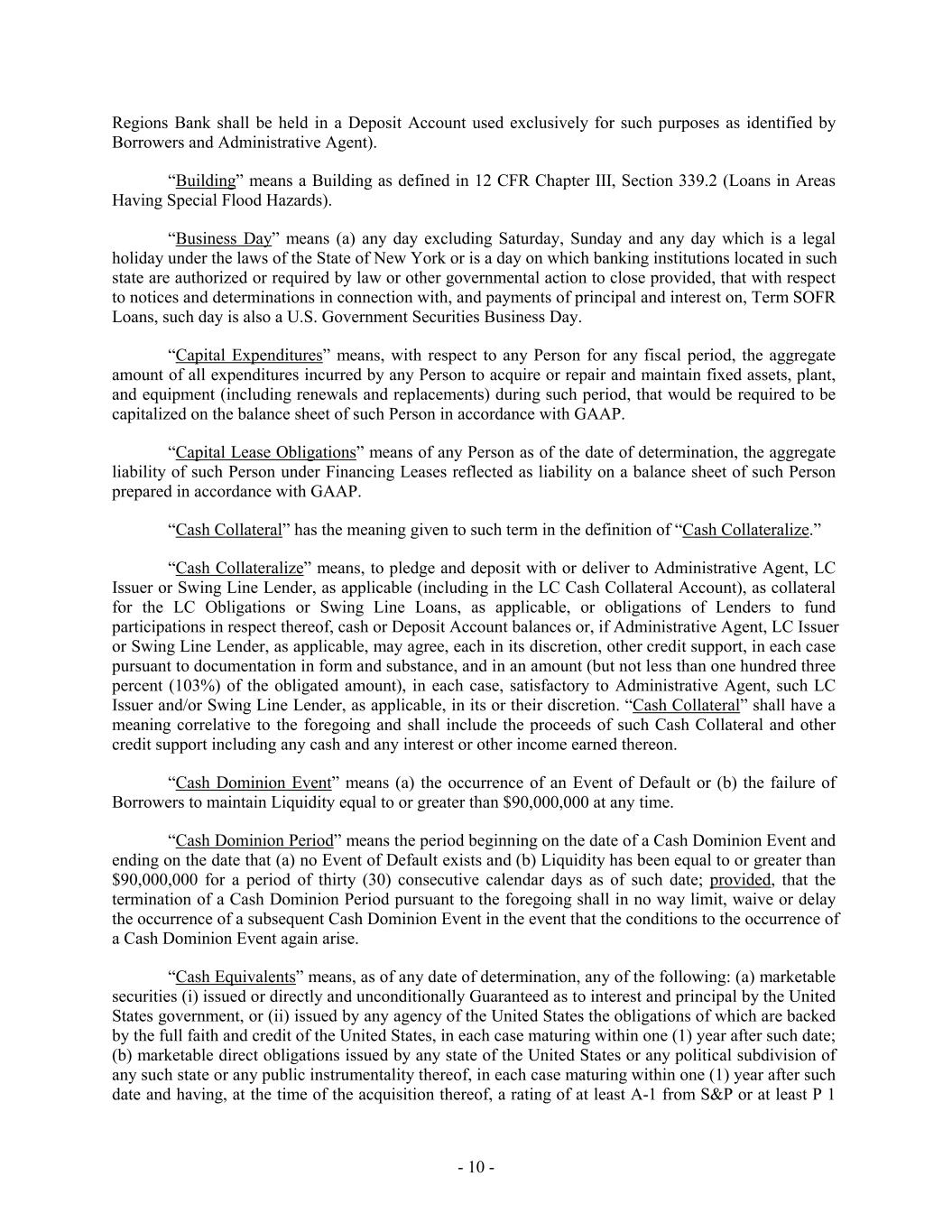 Regions Bank shall be held in a Deposit Account used exclusively for such purposes as identified by Borrowers and Administrative Agent). “Building” means a Building as defined in 12 CFR Chapter III, Section 339.2 (Loans in Areas Having Special Flood Hazards). “Business Day” means (a) any day excluding Saturday, Sunday and any day which is a legal holiday under the laws of the State of New York or is a day on which banking institutions located in such state are authorized or required by law or other governmental action to close provided, that with respect to notices and determinations in connection with, and payments of principal and interest on, Term SOFR Loans, such day is also a U.S. Government Securities Business Day. “Capital Expenditures” means, with respect to any Person for any fiscal period, the aggregate amount of all expenditures incurred by any Person to acquire or repair and maintain fixed assets, plant, and equipment (including renewals and replacements) during such period, that would be required to be capitalized on the balance sheet of such Person in accordance with GAAP. “Capital Lease Obligations” means of any Person as of the date of determination, the aggregate liability of such Person under Financing Leases reflected as liability on a balance sheet of such Person prepared in accordance with GAAP. “Cash Collateral” has the meaning given to such term in the definition of “Cash Collateralize.” “Cash Collateralize” means, to pledge and deposit with or deliver to Administrative Agent, LC Issuer or Swing Line Lender, as applicable (including in the LC Cash Collateral Account), as collateral for the LC Obligations or Swing Line Loans, as applicable, or obligations of Lenders to fund participations in respect thereof, cash or Deposit Account balances or, if Administrative Agent, LC Issuer or Swing Line Lender, as applicable, may agree, each in its discretion, other credit support, in each case pursuant to documentation in form and substance, and in an amount (but not less than one hundred three percent (103%) of the obligated amount), in each case, satisfactory to Administrative Agent, such LC Issuer and/or Swing Line Lender, as applicable, in its or their discretion. “Cash Collateral” shall have a meaning correlative to the foregoing and shall include the proceeds of such Cash Collateral and other credit support including any cash and any interest or other income earned thereon. “Cash Dominion Event” means (a) the occurrence of an Event of Default or (b) the failure of Borrowers to maintain Liquidity equal to or greater than $90,000,000 at any time. “Cash Dominion Period” means the period beginning on the date of a Cash Dominion Event and ending on the date that (a) no Event of Default exists and (b) Liquidity has been equal to or greater than $90,000,000 for a period of thirty (30) consecutive calendar days as of such date; provided, that the termination of a Cash Dominion Period pursuant to the foregoing shall in no way limit, waive or delay the occurrence of a subsequent Cash Dominion Event in the event that the conditions to the occurrence of a Cash Dominion Event again arise. “Cash Equivalents” means, as of any date of determination, any of the following: (a) marketable securities (i) issued or directly and unconditionally Guaranteed as to interest and principal by the United States government, or (ii) issued by any agency of the United States the obligations of which are backed by the full faith and credit of the United States, in each case maturing within one (1) year after such date; (b) marketable direct obligations issued by any state of the United States or any political subdivision of any such state or any public instrumentality thereof, in each case maturing within one (1) year after such date and having, at the time of the acquisition thereof, a rating of at least A-1 from S&P or at least P 1 - 10 -