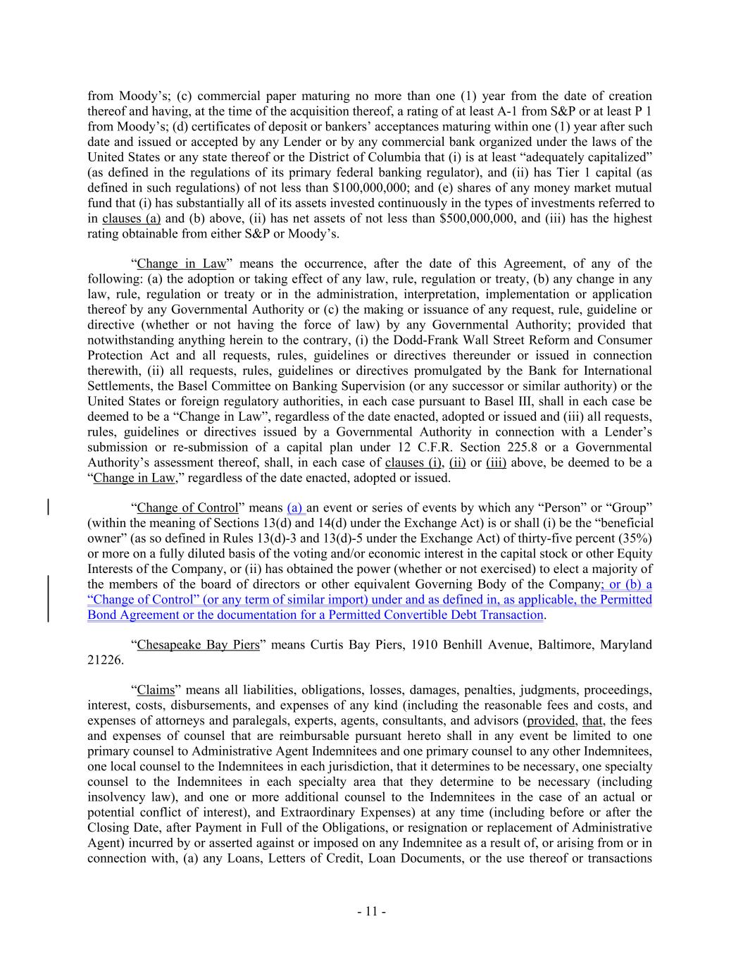 from Moody’s; (c) commercial paper maturing no more than one (1) year from the date of creation thereof and having, at the time of the acquisition thereof, a rating of at least A-1 from S&P or at least P 1 from Moody’s; (d) certificates of deposit or bankers’ acceptances maturing within one (1) year after such date and issued or accepted by any Lender or by any commercial bank organized under the laws of the United States or any state thereof or the District of Columbia that (i) is at least “adequately capitalized” (as defined in the regulations of its primary federal banking regulator), and (ii) has Tier 1 capital (as defined in such regulations) of not less than $100,000,000; and (e) shares of any money market mutual fund that (i) has substantially all of its assets invested continuously in the types of investments referred to in clauses (a) and (b) above, (ii) has net assets of not less than $500,000,000, and (iii) has the highest rating obtainable from either S&P or Moody’s. “Change in Law” means the occurrence, after the date of this Agreement, of any of the following: (a) the adoption or taking effect of any law, rule, regulation or treaty, (b) any change in any law, rule, regulation or treaty or in the administration, interpretation, implementation or application thereof by any Governmental Authority or (c) the making or issuance of any request, rule, guideline or directive (whether or not having the force of law) by any Governmental Authority; provided that notwithstanding anything herein to the contrary, (i) the Dodd-Frank Wall Street Reform and Consumer Protection Act and all requests, rules, guidelines or directives thereunder or issued in connection therewith, (ii) all requests, rules, guidelines or directives promulgated by the Bank for International Settlements, the Basel Committee on Banking Supervision (or any successor or similar authority) or the United States or foreign regulatory authorities, in each case pursuant to Basel III, shall in each case be deemed to be a “Change in Law”, regardless of the date enacted, adopted or issued and (iii) all requests, rules, guidelines or directives issued by a Governmental Authority in connection with a Lender’s submission or re-submission of a capital plan under 12 C.F.R. Section 225.8 or a Governmental Authority’s assessment thereof, shall, in each case of clauses (i), (ii) or (iii) above, be deemed to be a “Change in Law,” regardless of the date enacted, adopted or issued. “Change of Control” means (a) an event or series of events by which any “Person” or “Group” (within the meaning of Sections 13(d) and 14(d) under the Exchange Act) is or shall (i) be the “beneficial owner” (as so defined in Rules 13(d)-3 and 13(d)-5 under the Exchange Act) of thirty-five percent (35%) or more on a fully diluted basis of the voting and/or economic interest in the capital stock or other Equity Interests of the Company, or (ii) has obtained the power (whether or not exercised) to elect a majority of the members of the board of directors or other equivalent Governing Body of the Company; or (b) a “Change of Control” (or any term of similar import) under and as defined in, as applicable, the Permitted Bond Agreement or the documentation for a Permitted Convertible Debt Transaction. “Chesapeake Bay Piers” means Curtis Bay Piers, 1910 Benhill Avenue, Baltimore, Maryland 21226. “Claims” means all liabilities, obligations, losses, damages, penalties, judgments, proceedings, interest, costs, disbursements, and expenses of any kind (including the reasonable fees and costs, and expenses of attorneys and paralegals, experts, agents, consultants, and advisors (provided, that, the fees and expenses of counsel that are reimbursable pursuant hereto shall in any event be limited to one primary counsel to Administrative Agent Indemnitees and one primary counsel to any other Indemnitees, one local counsel to the Indemnitees in each jurisdiction, that it determines to be necessary, one specialty counsel to the Indemnitees in each specialty area that they determine to be necessary (including insolvency law), and one or more additional counsel to the Indemnitees in the case of an actual or potential conflict of interest), and Extraordinary Expenses) at any time (including before or after the Closing Date, after Payment in Full of the Obligations, or resignation or replacement of Administrative Agent) incurred by or asserted against or imposed on any Indemnitee as a result of, or arising from or in connection with, (a) any Loans, Letters of Credit, Loan Documents, or the use thereof or transactions - 11 -
