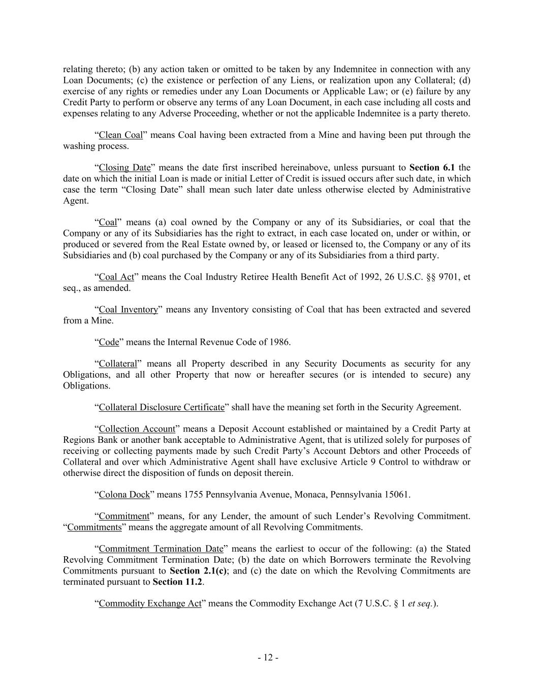 relating thereto; (b) any action taken or omitted to be taken by any Indemnitee in connection with any Loan Documents; (c) the existence or perfection of any Liens, or realization upon any Collateral; (d) exercise of any rights or remedies under any Loan Documents or Applicable Law; or (e) failure by any Credit Party to perform or observe any terms of any Loan Document, in each case including all costs and expenses relating to any Adverse Proceeding, whether or not the applicable Indemnitee is a party thereto. “Clean Coal” means Coal having been extracted from a Mine and having been put through the washing process. “Closing Date” means the date first inscribed hereinabove, unless pursuant to Section 6.1 the date on which the initial Loan is made or initial Letter of Credit is issued occurs after such date, in which case the term “Closing Date” shall mean such later date unless otherwise elected by Administrative Agent. “Coal” means (a) coal owned by the Company or any of its Subsidiaries, or coal that the Company or any of its Subsidiaries has the right to extract, in each case located on, under or within, or produced or severed from the Real Estate owned by, or leased or licensed to, the Company or any of its Subsidiaries and (b) coal purchased by the Company or any of its Subsidiaries from a third party. “Coal Act” means the Coal Industry Retiree Health Benefit Act of 1992, 26 U.S.C. §§ 9701, et seq., as amended. “Coal Inventory” means any Inventory consisting of Coal that has been extracted and severed from a Mine. “Code” means the Internal Revenue Code of 1986. “Collateral” means all Property described in any Security Documents as security for any Obligations, and all other Property that now or hereafter secures (or is intended to secure) any Obligations. “Collateral Disclosure Certificate” shall have the meaning set forth in the Security Agreement. “Collection Account” means a Deposit Account established or maintained by a Credit Party at Regions Bank or another bank acceptable to Administrative Agent, that is utilized solely for purposes of receiving or collecting payments made by such Credit Party’s Account Debtors and other Proceeds of Collateral and over which Administrative Agent shall have exclusive Article 9 Control to withdraw or otherwise direct the disposition of funds on deposit therein. “Colona Dock” means 1755 Pennsylvania Avenue, Monaca, Pennsylvania 15061. “Commitment” means, for any Lender, the amount of such Lender’s Revolving Commitment. “Commitments” means the aggregate amount of all Revolving Commitments. “Commitment Termination Date” means the earliest to occur of the following: (a) the Stated Revolving Commitment Termination Date; (b) the date on which Borrowers terminate the Revolving Commitments pursuant to Section 2.1(c); and (c) the date on which the Revolving Commitments are terminated pursuant to Section 11.2. “Commodity Exchange Act” means the Commodity Exchange Act (7 U.S.C. § 1 et seq.). - 12 -