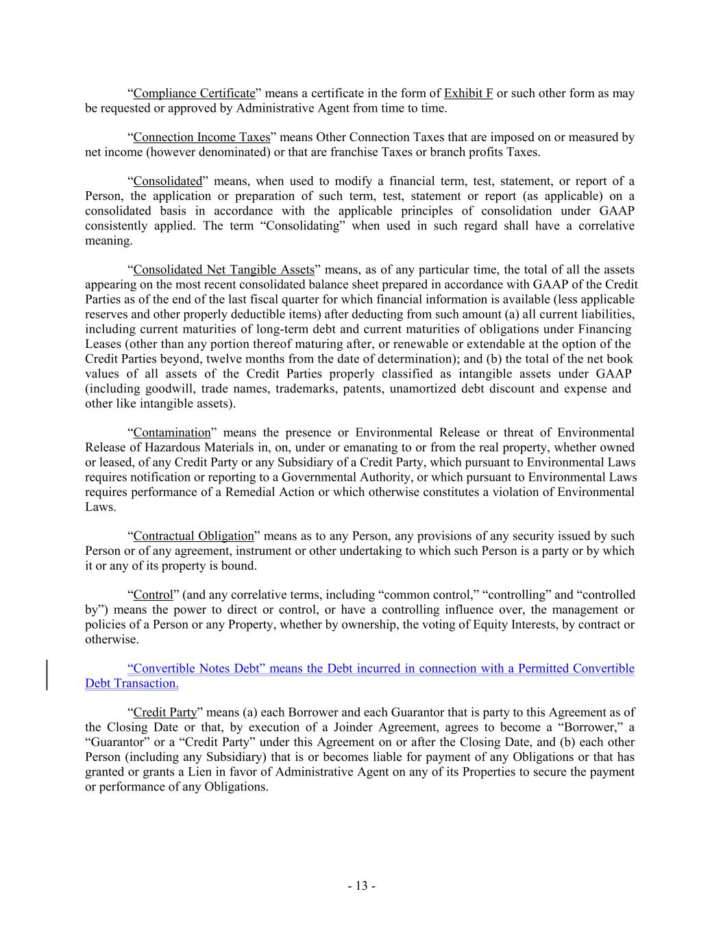 “Compliance Certificate” means a certificate in the form of Exhibit F or such other form as may be requested or approved by Administrative Agent from time to time. “Connection Income Taxes” means Other Connection Taxes that are imposed on or measured by net income (however denominated) or that are franchise Taxes or branch profits Taxes. “Consolidated” means, when used to modify a financial term, test, statement, or report of a Person, the application or preparation of such term, test, statement or report (as applicable) on a consolidated basis in accordance with the applicable principles of consolidation under GAAP consistently applied. The term “Consolidating” when used in such regard shall have a correlative meaning. “Consolidated Net Tangible Assets” means, as of any particular time, the total of all the assets appearing on the most recent consolidated balance sheet prepared in accordance with GAAP of the Credit Parties as of the end of the last fiscal quarter for which financial information is available (less applicable reserves and other properly deductible items) after deducting from such amount (a) all current liabilities, including current maturities of long-term debt and current maturities of obligations under Financing Leases (other than any portion thereof maturing after, or renewable or extendable at the option of the Credit Parties beyond, twelve months from the date of determination); and (b) the total of the net book values of all assets of the Credit Parties properly classified as intangible assets under GAAP (including goodwill, trade names, trademarks, patents, unamortized debt discount and expense and other like intangible assets). “Contamination” means the presence or Environmental Release or threat of Environmental Release of Hazardous Materials in, on, under or emanating to or from the real property, whether owned or leased, of any Credit Party or any Subsidiary of a Credit Party, which pursuant to Environmental Laws requires notification or reporting to a Governmental Authority, or which pursuant to Environmental Laws requires performance of a Remedial Action or which otherwise constitutes a violation of Environmental Laws. “Contractual Obligation” means as to any Person, any provisions of any security issued by such Person or of any agreement, instrument or other undertaking to which such Person is a party or by which it or any of its property is bound. “Control” (and any correlative terms, including “common control,” “controlling” and “controlled by”) means the power to direct or control, or have a controlling influence over, the management or policies of a Person or any Property, whether by ownership, the voting of Equity Interests, by contract or otherwise. “Convertible Notes Debt” means the Debt incurred in connection with a Permitted Convertible Debt Transaction. “Credit Party” means (a) each Borrower and each Guarantor that is party to this Agreement as of the Closing Date or that, by execution of a Joinder Agreement, agrees to become a “Borrower,” a “Guarantor” or a “Credit Party” under this Agreement on or after the Closing Date, and (b) each other Person (including any Subsidiary) that is or becomes liable for payment of any Obligations or that has granted or grants a Lien in favor of Administrative Agent on any of its Properties to secure the payment or performance of any Obligations. - 13 -
