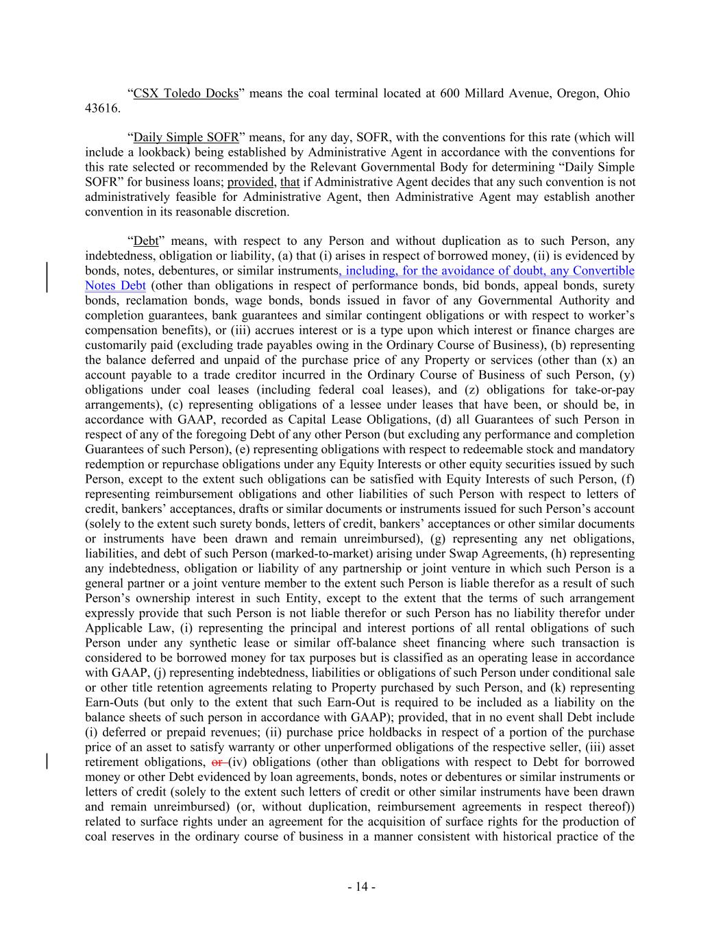 “CSX Toledo Docks” means the coal terminal located at 600 Millard Avenue, Oregon, Ohio 43616. “Daily Simple SOFR” means, for any day, SOFR, with the conventions for this rate (which will include a lookback) being established by Administrative Agent in accordance with the conventions for this rate selected or recommended by the Relevant Governmental Body for determining “Daily Simple SOFR” for business loans; provided, that if Administrative Agent decides that any such convention is not administratively feasible for Administrative Agent, then Administrative Agent may establish another convention in its reasonable discretion. “Debt” means, with respect to any Person and without duplication as to such Person, any indebtedness, obligation or liability, (a) that (i) arises in respect of borrowed money, (ii) is evidenced by bonds, notes, debentures, or similar instruments, including, for the avoidance of doubt, any Convertible Notes Debt (other than obligations in respect of performance bonds, bid bonds, appeal bonds, surety bonds, reclamation bonds, wage bonds, bonds issued in favor of any Governmental Authority and completion guarantees, bank guarantees and similar contingent obligations or with respect to worker’s compensation benefits), or (iii) accrues interest or is a type upon which interest or finance charges are customarily paid (excluding trade payables owing in the Ordinary Course of Business), (b) representing the balance deferred and unpaid of the purchase price of any Property or services (other than (x) an account payable to a trade creditor incurred in the Ordinary Course of Business of such Person, (y) obligations under coal leases (including federal coal leases), and (z) obligations for take-or-pay arrangements), (c) representing obligations of a lessee under leases that have been, or should be, in accordance with GAAP, recorded as Capital Lease Obligations, (d) all Guarantees of such Person in respect of any of the foregoing Debt of any other Person (but excluding any performance and completion Guarantees of such Person), (e) representing obligations with respect to redeemable stock and mandatory redemption or repurchase obligations under any Equity Interests or other equity securities issued by such Person, except to the extent such obligations can be satisfied with Equity Interests of such Person, (f) representing reimbursement obligations and other liabilities of such Person with respect to letters of credit, bankers’ acceptances, drafts or similar documents or instruments issued for such Person’s account (solely to the extent such surety bonds, letters of credit, bankers’ acceptances or other similar documents or instruments have been drawn and remain unreimbursed), (g) representing any net obligations, liabilities, and debt of such Person (marked-to-market) arising under Swap Agreements, (h) representing any indebtedness, obligation or liability of any partnership or joint venture in which such Person is a general partner or a joint venture member to the extent such Person is liable therefor as a result of such Person’s ownership interest in such Entity, except to the extent that the terms of such arrangement expressly provide that such Person is not liable therefor or such Person has no liability therefor under Applicable Law, (i) representing the principal and interest portions of all rental obligations of such Person under any synthetic lease or similar off-balance sheet financing where such transaction is considered to be borrowed money for tax purposes but is classified as an operating lease in accordance with GAAP, (j) representing indebtedness, liabilities or obligations of such Person under conditional sale or other title retention agreements relating to Property purchased by such Person, and (k) representing Earn-Outs (but only to the extent that such Earn-Out is required to be included as a liability on the balance sheets of such person in accordance with GAAP); provided, that in no event shall Debt include (i) deferred or prepaid revenues; (ii) purchase price holdbacks in respect of a portion of the purchase price of an asset to satisfy warranty or other unperformed obligations of the respective seller, (iii) asset retirement obligations, or (iv) obligations (other than obligations with respect to Debt for borrowed money or other Debt evidenced by loan agreements, bonds, notes or debentures or similar instruments or letters of credit (solely to the extent such letters of credit or other similar instruments have been drawn and remain unreimbursed) (or, without duplication, reimbursement agreements in respect thereof)) related to surface rights under an agreement for the acquisition of surface rights for the production of coal reserves in the ordinary course of business in a manner consistent with historical practice of the - 14 -