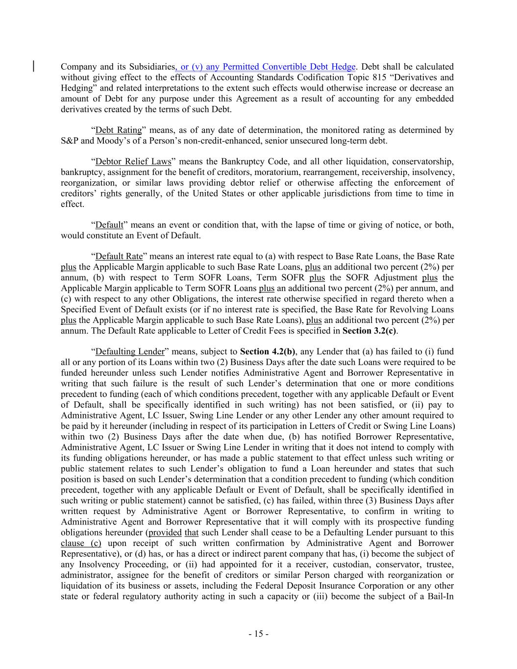 Company and its Subsidiaries, or (v) any Permitted Convertible Debt Hedge. Debt shall be calculated without giving effect to the effects of Accounting Standards Codification Topic 815 “Derivatives and Hedging” and related interpretations to the extent such effects would otherwise increase or decrease an amount of Debt for any purpose under this Agreement as a result of accounting for any embedded derivatives created by the terms of such Debt. “Debt Rating” means, as of any date of determination, the monitored rating as determined by S&P and Moody’s of a Person’s non-credit-enhanced, senior unsecured long-term debt. “Debtor Relief Laws” means the Bankruptcy Code, and all other liquidation, conservatorship, bankruptcy, assignment for the benefit of creditors, moratorium, rearrangement, receivership, insolvency, reorganization, or similar laws providing debtor relief or otherwise affecting the enforcement of creditors’ rights generally, of the United States or other applicable jurisdictions from time to time in effect. “Default” means an event or condition that, with the lapse of time or giving of notice, or both, would constitute an Event of Default. “Default Rate” means an interest rate equal to (a) with respect to Base Rate Loans, the Base Rate plus the Applicable Margin applicable to such Base Rate Loans, plus an additional two percent (2%) per annum, (b) with respect to Term SOFR Loans, Term SOFR plus the SOFR Adjustment plus the Applicable Margin applicable to Term SOFR Loans plus an additional two percent (2%) per annum, and (c) with respect to any other Obligations, the interest rate otherwise specified in regard thereto when a Specified Event of Default exists (or if no interest rate is specified, the Base Rate for Revolving Loans plus the Applicable Margin applicable to such Base Rate Loans), plus an additional two percent (2%) per annum. The Default Rate applicable to Letter of Credit Fees is specified in Section 3.2(c). “Defaulting Lender” means, subject to Section 4.2(b), any Lender that (a) has failed to (i) fund all or any portion of its Loans within two (2) Business Days after the date such Loans were required to be funded hereunder unless such Lender notifies Administrative Agent and Borrower Representative in writing that such failure is the result of such Lender’s determination that one or more conditions precedent to funding (each of which conditions precedent, together with any applicable Default or Event of Default, shall be specifically identified in such writing) has not been satisfied, or (ii) pay to Administrative Agent, LC Issuer, Swing Line Lender or any other Lender any other amount required to be paid by it hereunder (including in respect of its participation in Letters of Credit or Swing Line Loans) within two (2) Business Days after the date when due, (b) has notified Borrower Representative, Administrative Agent, LC Issuer or Swing Line Lender in writing that it does not intend to comply with its funding obligations hereunder, or has made a public statement to that effect unless such writing or public statement relates to such Lender’s obligation to fund a Loan hereunder and states that such position is based on such Lender’s determination that a condition precedent to funding (which condition precedent, together with any applicable Default or Event of Default, shall be specifically identified in such writing or public statement) cannot be satisfied, (c) has failed, within three (3) Business Days after written request by Administrative Agent or Borrower Representative, to confirm in writing to Administrative Agent and Borrower Representative that it will comply with its prospective funding obligations hereunder (provided that such Lender shall cease to be a Defaulting Lender pursuant to this clause (c) upon receipt of such written confirmation by Administrative Agent and Borrower Representative), or (d) has, or has a direct or indirect parent company that has, (i) become the subject of any Insolvency Proceeding, or (ii) had appointed for it a receiver, custodian, conservator, trustee, administrator, assignee for the benefit of creditors or similar Person charged with reorganization or liquidation of its business or assets, including the Federal Deposit Insurance Corporation or any other state or federal regulatory authority acting in such a capacity or (iii) become the subject of a Bail-In - 15 -