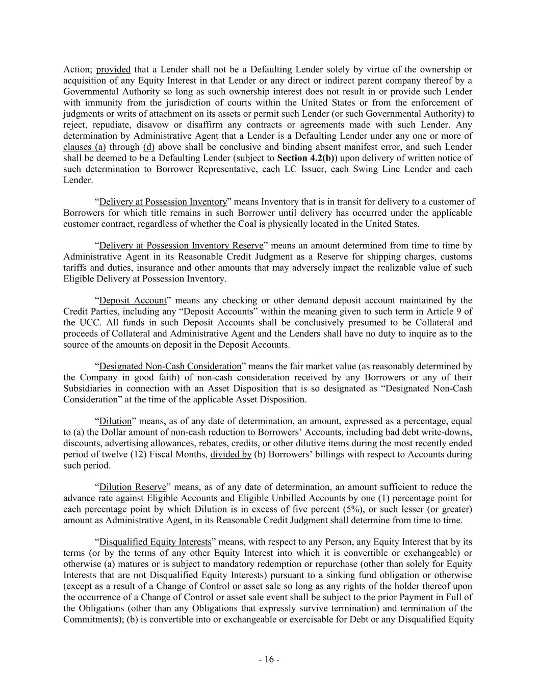 Action; provided that a Lender shall not be a Defaulting Lender solely by virtue of the ownership or acquisition of any Equity Interest in that Lender or any direct or indirect parent company thereof by a Governmental Authority so long as such ownership interest does not result in or provide such Lender with immunity from the jurisdiction of courts within the United States or from the enforcement of judgments or writs of attachment on its assets or permit such Lender (or such Governmental Authority) to reject, repudiate, disavow or disaffirm any contracts or agreements made with such Lender. Any determination by Administrative Agent that a Lender is a Defaulting Lender under any one or more of clauses (a) through (d) above shall be conclusive and binding absent manifest error, and such Lender shall be deemed to be a Defaulting Lender (subject to Section 4.2(b)) upon delivery of written notice of such determination to Borrower Representative, each LC Issuer, each Swing Line Lender and each Lender. “Delivery at Possession Inventory” means Inventory that is in transit for delivery to a customer of Borrowers for which title remains in such Borrower until delivery has occurred under the applicable customer contract, regardless of whether the Coal is physically located in the United States. “Delivery at Possession Inventory Reserve” means an amount determined from time to time by Administrative Agent in its Reasonable Credit Judgment as a Reserve for shipping charges, customs tariffs and duties, insurance and other amounts that may adversely impact the realizable value of such Eligible Delivery at Possession Inventory. “Deposit Account” means any checking or other demand deposit account maintained by the Credit Parties, including any “Deposit Accounts” within the meaning given to such term in Article 9 of the UCC. All funds in such Deposit Accounts shall be conclusively presumed to be Collateral and proceeds of Collateral and Administrative Agent and the Lenders shall have no duty to inquire as to the source of the amounts on deposit in the Deposit Accounts. “Designated Non-Cash Consideration” means the fair market value (as reasonably determined by the Company in good faith) of non-cash consideration received by any Borrowers or any of their Subsidiaries in connection with an Asset Disposition that is so designated as “Designated Non-Cash Consideration” at the time of the applicable Asset Disposition. “Dilution” means, as of any date of determination, an amount, expressed as a percentage, equal to (a) the Dollar amount of non-cash reduction to Borrowers’ Accounts, including bad debt write-downs, discounts, advertising allowances, rebates, credits, or other dilutive items during the most recently ended period of twelve (12) Fiscal Months, divided by (b) Borrowers’ billings with respect to Accounts during such period. “Dilution Reserve” means, as of any date of determination, an amount sufficient to reduce the advance rate against Eligible Accounts and Eligible Unbilled Accounts by one (1) percentage point for each percentage point by which Dilution is in excess of five percent (5%), or such lesser (or greater) amount as Administrative Agent, in its Reasonable Credit Judgment shall determine from time to time. “Disqualified Equity Interests” means, with respect to any Person, any Equity Interest that by its terms (or by the terms of any other Equity Interest into which it is convertible or exchangeable) or otherwise (a) matures or is subject to mandatory redemption or repurchase (other than solely for Equity Interests that are not Disqualified Equity Interests) pursuant to a sinking fund obligation or otherwise (except as a result of a Change of Control or asset sale so long as any rights of the holder thereof upon the occurrence of a Change of Control or asset sale event shall be subject to the prior Payment in Full of the Obligations (other than any Obligations that expressly survive termination) and termination of the Commitments); (b) is convertible into or exchangeable or exercisable for Debt or any Disqualified Equity - 16 -