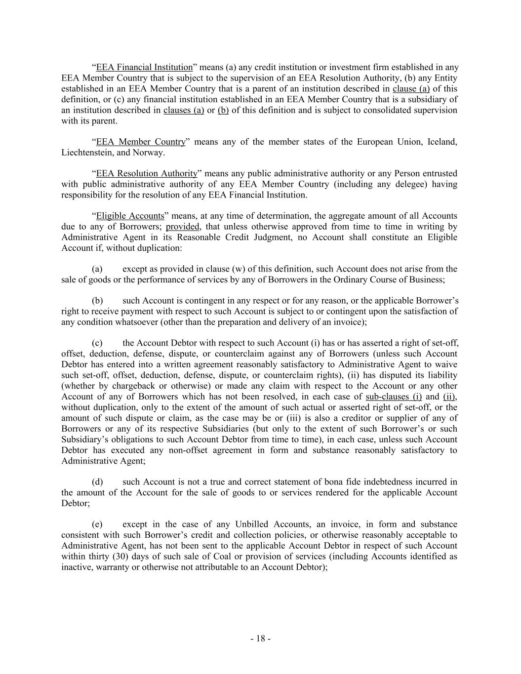 “EEA Financial Institution” means (a) any credit institution or investment firm established in any EEA Member Country that is subject to the supervision of an EEA Resolution Authority, (b) any Entity established in an EEA Member Country that is a parent of an institution described in clause (a) of this definition, or (c) any financial institution established in an EEA Member Country that is a subsidiary of an institution described in clauses (a) or (b) of this definition and is subject to consolidated supervision with its parent. “EEA Member Country” means any of the member states of the European Union, Iceland, Liechtenstein, and Norway. “EEA Resolution Authority” means any public administrative authority or any Person entrusted with public administrative authority of any EEA Member Country (including any delegee) having responsibility for the resolution of any EEA Financial Institution. “Eligible Accounts” means, at any time of determination, the aggregate amount of all Accounts due to any of Borrowers; provided, that unless otherwise approved from time to time in writing by Administrative Agent in its Reasonable Credit Judgment, no Account shall constitute an Eligible Account if, without duplication: (a) except as provided in clause (w) of this definition, such Account does not arise from the sale of goods or the performance of services by any of Borrowers in the Ordinary Course of Business; (b) such Account is contingent in any respect or for any reason, or the applicable Borrower’s right to receive payment with respect to such Account is subject to or contingent upon the satisfaction of any condition whatsoever (other than the preparation and delivery of an invoice); (c) the Account Debtor with respect to such Account (i) has or has asserted a right of set-off, offset, deduction, defense, dispute, or counterclaim against any of Borrowers (unless such Account Debtor has entered into a written agreement reasonably satisfactory to Administrative Agent to waive such set-off, offset, deduction, defense, dispute, or counterclaim rights), (ii) has disputed its liability (whether by chargeback or otherwise) or made any claim with respect to the Account or any other Account of any of Borrowers which has not been resolved, in each case of sub-clauses (i) and (ii), without duplication, only to the extent of the amount of such actual or asserted right of set-off, or the amount of such dispute or claim, as the case may be or (iii) is also a creditor or supplier of any of Borrowers or any of its respective Subsidiaries (but only to the extent of such Borrower’s or such Subsidiary’s obligations to such Account Debtor from time to time), in each case, unless such Account Debtor has executed any non-offset agreement in form and substance reasonably satisfactory to Administrative Agent; (d) such Account is not a true and correct statement of bona fide indebtedness incurred in the amount of the Account for the sale of goods to or services rendered for the applicable Account Debtor; (e) except in the case of any Unbilled Accounts, an invoice, in form and substance consistent with such Borrower’s credit and collection policies, or otherwise reasonably acceptable to Administrative Agent, has not been sent to the applicable Account Debtor in respect of such Account within thirty (30) days of such sale of Coal or provision of services (including Accounts identified as inactive, warranty or otherwise not attributable to an Account Debtor); - 18 -