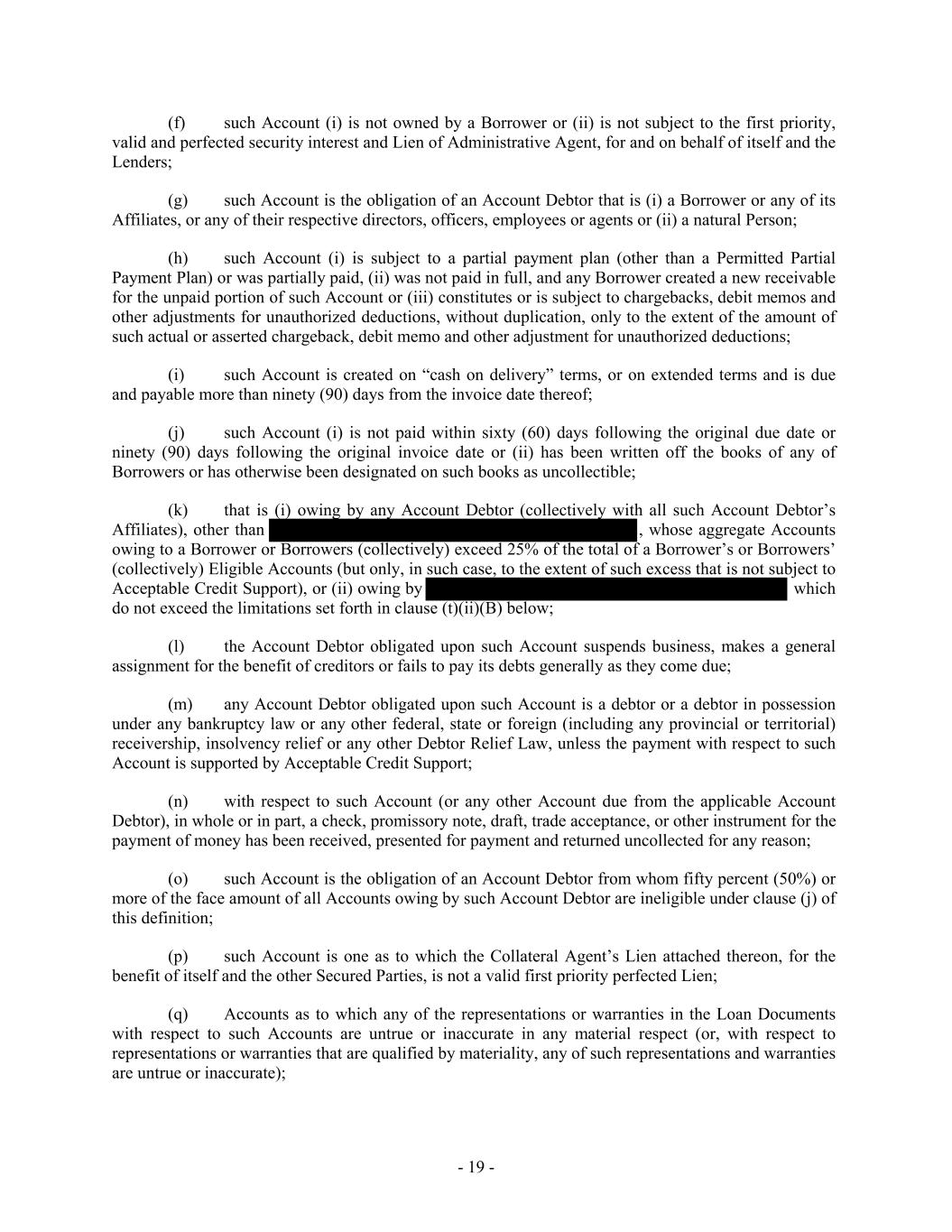 (f) such Account (i) is not owned by a Borrower or (ii) is not subject to the first priority, valid and perfected security interest and Lien of Administrative Agent, for and on behalf of itself and the Lenders; (g) such Account is the obligation of an Account Debtor that is (i) a Borrower or any of its Affiliates, or any of their respective directors, officers, employees or agents or (ii) a natural Person; (h) such Account (i) is subject to a partial payment plan (other than a Permitted Partial Payment Plan) or was partially paid, (ii) was not paid in full, and any Borrower created a new receivable for the unpaid portion of such Account or (iii) constitutes or is subject to chargebacks, debit memos and other adjustments for unauthorized deductions, without duplication, only to the extent of the amount of such actual or asserted chargeback, debit memo and other adjustment for unauthorized deductions; (i) such Account is created on “cash on delivery” terms, or on extended terms and is due and payable more than ninety (90) days from the invoice date thereof; (j) such Account (i) is not paid within sixty (60) days following the original due date or ninety (90) days following the original invoice date or (ii) has been written off the books of any of Borrowers or has otherwise been designated on such books as uncollectible; (k) that is (i) owing by any Account Debtor (collectively with all such Account Debtor’s Affiliates), other than , whose aggregate Accounts owing to a Borrower or Borrowers (collectively) exceed 25% of the total of a Borrower’s or Borrowers’ (collectively) Eligible Accounts (but only, in such case, to the extent of such excess that is not subject to Acceptable Credit Support), or (ii) owing by which do not exceed the limitations set forth in clause (t)(ii)(B) below; (l) the Account Debtor obligated upon such Account suspends business, makes a general assignment for the benefit of creditors or fails to pay its debts generally as they come due; (m) any Account Debtor obligated upon such Account is a debtor or a debtor in possession under any bankruptcy law or any other federal, state or foreign (including any provincial or territorial) receivership, insolvency relief or any other Debtor Relief Law, unless the payment with respect to such Account is supported by Acceptable Credit Support; (n) with respect to such Account (or any other Account due from the applicable Account Debtor), in whole or in part, a check, promissory note, draft, trade acceptance, or other instrument for the payment of money has been received, presented for payment and returned uncollected for any reason; (o) such Account is the obligation of an Account Debtor from whom fifty percent (50%) or more of the face amount of all Accounts owing by such Account Debtor are ineligible under clause (j) of this definition; (p) such Account is one as to which the Collateral Agent’s Lien attached thereon, for the benefit of itself and the other Secured Parties, is not a valid first priority perfected Lien; (q) Accounts as to which any of the representations or warranties in the Loan Documents with respect to such Accounts are untrue or inaccurate in any material respect (or, with respect to representations or warranties that are qualified by materiality, any of such representations and warranties are untrue or inaccurate); - 19 -