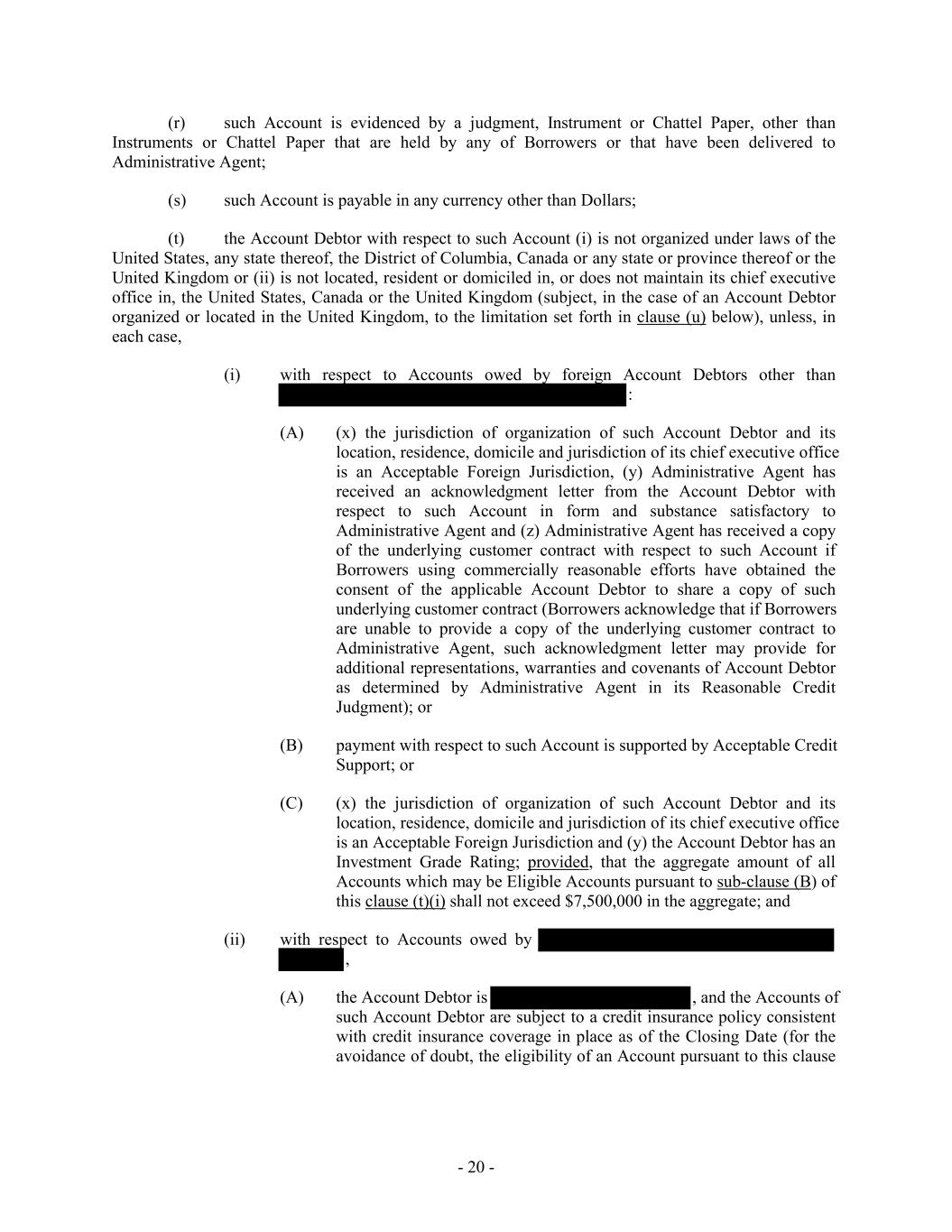 (r) such Account is evidenced by a judgment, Instrument or Chattel Paper, other than Instruments or Chattel Paper that are held by any of Borrowers or that have been delivered to Administrative Agent; (s) such Account is payable in any currency other than Dollars; (t) the Account Debtor with respect to such Account (i) is not organized under laws of the United States, any state thereof, the District of Columbia, Canada or any state or province thereof or the United Kingdom or (ii) is not located, resident or domiciled in, or does not maintain its chief executive office in, the United States, Canada or the United Kingdom (subject, in the case of an Account Debtor organized or located in the United Kingdom, to the limitation set forth in clause (u) below), unless, in each case, (i) with respect to Accounts owed by foreign Account Debtors other than : (A) (x) the jurisdiction of organization of such Account Debtor and its location, residence, domicile and jurisdiction of its chief executive office is an Acceptable Foreign Jurisdiction, (y) Administrative Agent has received an acknowledgment letter from the Account Debtor with respect to such Account in form and substance satisfactory to Administrative Agent and (z) Administrative Agent has received a copy of the underlying customer contract with respect to such Account if Borrowers using commercially reasonable efforts have obtained the consent of the applicable Account Debtor to share a copy of such underlying customer contract (Borrowers acknowledge that if Borrowers are unable to provide a copy of the underlying customer contract to Administrative Agent, such acknowledgment letter may provide for additional representations, warranties and covenants of Account Debtor as determined by Administrative Agent in its Reasonable Credit Judgment); or (B) payment with respect to such Account is supported by Acceptable Credit Support; or (C) (x) the jurisdiction of organization of such Account Debtor and its location, residence, domicile and jurisdiction of its chief executive office is an Acceptable Foreign Jurisdiction and (y) the Account Debtor has an Investment Grade Rating; provided, that the aggregate amount of all Accounts which may be Eligible Accounts pursuant to sub-clause (B) of this clause (t)(i) shall not exceed $7,500,000 in the aggregate; and (ii) with respect to Accounts owed by , (A) the Account Debtor is , and the Accounts of such Account Debtor are subject to a credit insurance policy consistent with credit insurance coverage in place as of the Closing Date (for the avoidance of doubt, the eligibility of an Account pursuant to this clause - 20 -