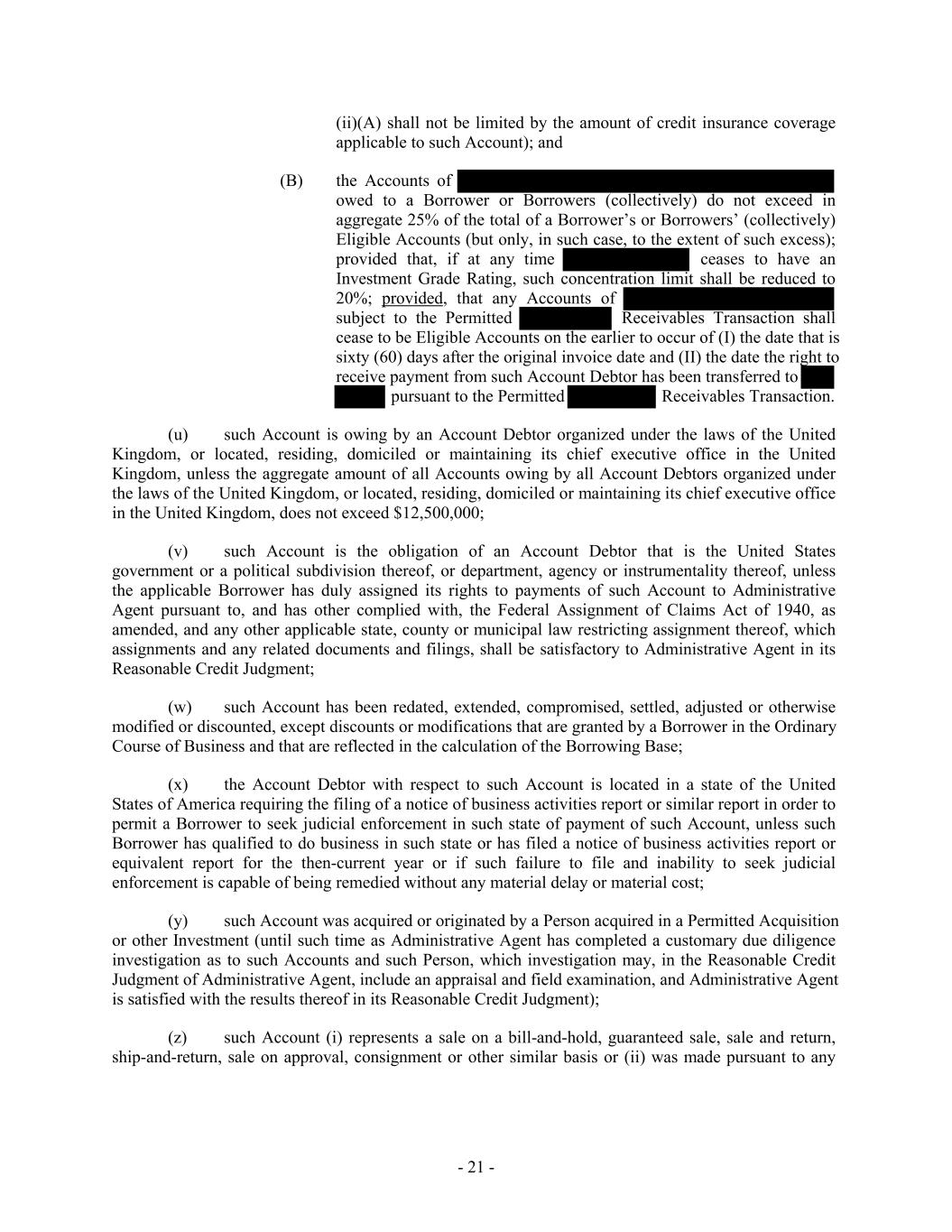 (ii)(A) shall not be limited by the amount of credit insurance coverage applicable to such Account); and (B) the Accounts of owed to a Borrower or Borrowers (collectively) do not exceed in aggregate 25% of the total of a Borrower’s or Borrowers’ (collectively) Eligible Accounts (but only, in such case, to the extent of such excess); provided that, if at any time ceases to have an Investment Grade Rating, such concentration limit shall be reduced to 20%; provided, that any Accounts of subject to the Permitted Receivables Transaction shall cease to be Eligible Accounts on the earlier to occur of (I) the date that is sixty (60) days after the original invoice date and (II) the date the right to receive payment from such Account Debtor has been transferred to pursuant to the Permitted Receivables Transaction. (u) such Account is owing by an Account Debtor organized under the laws of the United Kingdom, or located, residing, domiciled or maintaining its chief executive office in the United Kingdom, unless the aggregate amount of all Accounts owing by all Account Debtors organized under the laws of the United Kingdom, or located, residing, domiciled or maintaining its chief executive office in the United Kingdom, does not exceed $12,500,000; (v) such Account is the obligation of an Account Debtor that is the United States government or a political subdivision thereof, or department, agency or instrumentality thereof, unless the applicable Borrower has duly assigned its rights to payments of such Account to Administrative Agent pursuant to, and has other complied with, the Federal Assignment of Claims Act of 1940, as amended, and any other applicable state, county or municipal law restricting assignment thereof, which assignments and any related documents and filings, shall be satisfactory to Administrative Agent in its Reasonable Credit Judgment; (w) such Account has been redated, extended, compromised, settled, adjusted or otherwise modified or discounted, except discounts or modifications that are granted by a Borrower in the Ordinary Course of Business and that are reflected in the calculation of the Borrowing Base; (x) the Account Debtor with respect to such Account is located in a state of the United States of America requiring the filing of a notice of business activities report or similar report in order to permit a Borrower to seek judicial enforcement in such state of payment of such Account, unless such Borrower has qualified to do business in such state or has filed a notice of business activities report or equivalent report for the then-current year or if such failure to file and inability to seek judicial enforcement is capable of being remedied without any material delay or material cost; (y) such Account was acquired or originated by a Person acquired in a Permitted Acquisition or other Investment (until such time as Administrative Agent has completed a customary due diligence investigation as to such Accounts and such Person, which investigation may, in the Reasonable Credit Judgment of Administrative Agent, include an appraisal and field examination, and Administrative Agent is satisfied with the results thereof in its Reasonable Credit Judgment); (z) such Account (i) represents a sale on a bill-and-hold, guaranteed sale, sale and return, ship-and-return, sale on approval, consignment or other similar basis or (ii) was made pursuant to any - 21 -