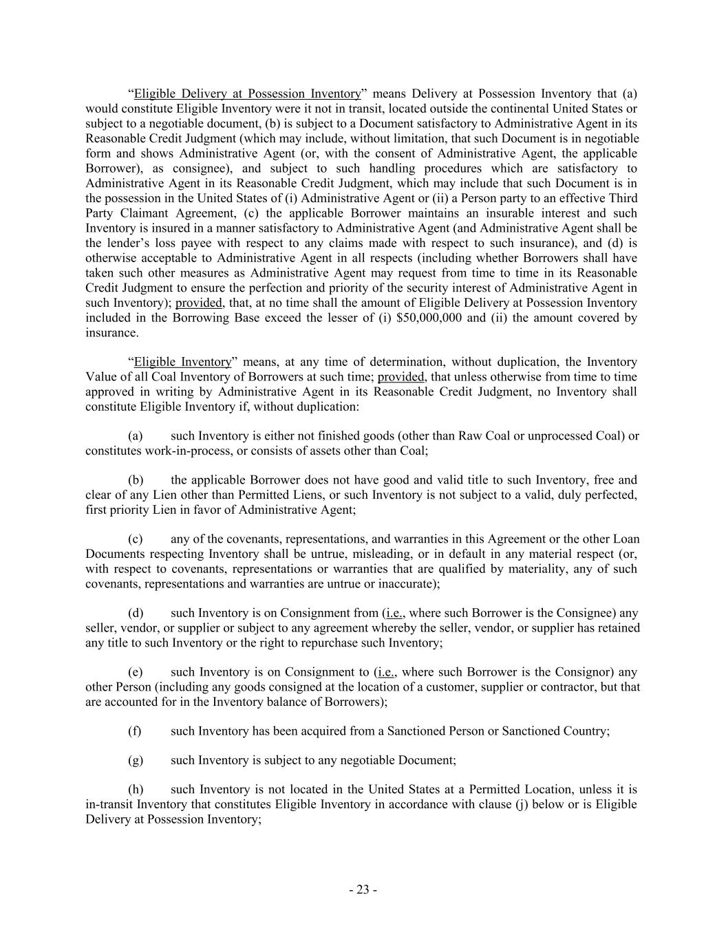 “Eligible Delivery at Possession Inventory” means Delivery at Possession Inventory that (a) would constitute Eligible Inventory were it not in transit, located outside the continental United States or subject to a negotiable document, (b) is subject to a Document satisfactory to Administrative Agent in its Reasonable Credit Judgment (which may include, without limitation, that such Document is in negotiable form and shows Administrative Agent (or, with the consent of Administrative Agent, the applicable Borrower), as consignee), and subject to such handling procedures which are satisfactory to Administrative Agent in its Reasonable Credit Judgment, which may include that such Document is in the possession in the United States of (i) Administrative Agent or (ii) a Person party to an effective Third Party Claimant Agreement, (c) the applicable Borrower maintains an insurable interest and such Inventory is insured in a manner satisfactory to Administrative Agent (and Administrative Agent shall be the lender’s loss payee with respect to any claims made with respect to such insurance), and (d) is otherwise acceptable to Administrative Agent in all respects (including whether Borrowers shall have taken such other measures as Administrative Agent may request from time to time in its Reasonable Credit Judgment to ensure the perfection and priority of the security interest of Administrative Agent in such Inventory); provided, that, at no time shall the amount of Eligible Delivery at Possession Inventory included in the Borrowing Base exceed the lesser of (i) $50,000,000 and (ii) the amount covered by insurance. “Eligible Inventory” means, at any time of determination, without duplication, the Inventory Value of all Coal Inventory of Borrowers at such time; provided, that unless otherwise from time to time approved in writing by Administrative Agent in its Reasonable Credit Judgment, no Inventory shall constitute Eligible Inventory if, without duplication: (a) such Inventory is either not finished goods (other than Raw Coal or unprocessed Coal) or constitutes work-in-process, or consists of assets other than Coal; (b) the applicable Borrower does not have good and valid title to such Inventory, free and clear of any Lien other than Permitted Liens, or such Inventory is not subject to a valid, duly perfected, first priority Lien in favor of Administrative Agent; (c) any of the covenants, representations, and warranties in this Agreement or the other Loan Documents respecting Inventory shall be untrue, misleading, or in default in any material respect (or, with respect to covenants, representations or warranties that are qualified by materiality, any of such covenants, representations and warranties are untrue or inaccurate); (d) such Inventory is on Consignment from (i.e., where such Borrower is the Consignee) any seller, vendor, or supplier or subject to any agreement whereby the seller, vendor, or supplier has retained any title to such Inventory or the right to repurchase such Inventory; (e) such Inventory is on Consignment to (i.e., where such Borrower is the Consignor) any other Person (including any goods consigned at the location of a customer, supplier or contractor, but that are accounted for in the Inventory balance of Borrowers); (f) such Inventory has been acquired from a Sanctioned Person or Sanctioned Country; (g) such Inventory is subject to any negotiable Document; (h) such Inventory is not located in the United States at a Permitted Location, unless it is in-transit Inventory that constitutes Eligible Inventory in accordance with clause (j) below or is Eligible Delivery at Possession Inventory; - 23 -