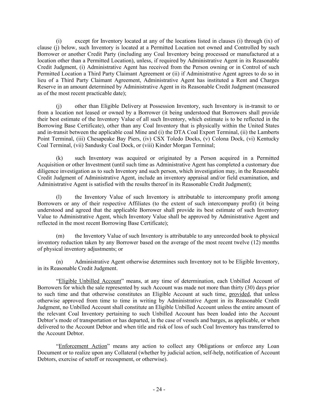 (i) except for Inventory located at any of the locations listed in clauses (i) through (ix) of clause (j) below, such Inventory is located at a Permitted Location not owned and Controlled by such Borrower or another Credit Party (including any Coal Inventory being processed or manufactured at a location other than a Permitted Location), unless, if required by Administrative Agent in its Reasonable Credit Judgment, (i) Administrative Agent has received from the Person owning or in Control of such Permitted Location a Third Party Claimant Agreement or (ii) if Administrative Agent agrees to do so in lieu of a Third Party Claimant Agreement, Administrative Agent has instituted a Rent and Charges Reserve in an amount determined by Administrative Agent in its Reasonable Credit Judgment (measured as of the most recent practicable date); (j) other than Eligible Delivery at Possession Inventory, such Inventory is in-transit to or from a location not leased or owned by a Borrower (it being understood that Borrowers shall provide their best estimate of the Inventory Value of all such Inventory, which estimate is to be reflected in the Borrowing Base Certificate), other than any Coal Inventory that is physically within the United States and in-transit between the applicable coal Mine and (i) the DTA Coal Export Terminal, (ii) the Lamberts Point Terminal, (iii) Chesapeake Bay Piers, (iv) CSX Toledo Docks, (v) Colona Dock, (vi) Kentucky Coal Terminal, (vii) Sandusky Coal Dock, or (viii) Kinder Morgan Terminal; (k) such Inventory was acquired or originated by a Person acquired in a Permitted Acquisition or other Investment (until such time as Administrative Agent has completed a customary due diligence investigation as to such Inventory and such person, which investigation may, in the Reasonable Credit Judgment of Administrative Agent, include an inventory appraisal and/or field examination, and Administrative Agent is satisfied with the results thereof in its Reasonable Credit Judgment); (l) the Inventory Value of such Inventory is attributable to intercompany profit among Borrowers or any of their respective Affiliates (to the extent of such intercompany profit) (it being understood and agreed that the applicable Borrower shall provide its best estimate of such Inventory Value to Administrative Agent, which Inventory Value shall be approved by Administrative Agent and reflected in the most recent Borrowing Base Certificate); (m) the Inventory Value of such Inventory is attributable to any unrecorded book to physical inventory reduction taken by any Borrower based on the average of the most recent twelve (12) months of physical inventory adjustments; or (n) Administrative Agent otherwise determines such Inventory not to be Eligible Inventory, in its Reasonable Credit Judgment. “Eligible Unbilled Account” means, at any time of determination, each Unbilled Account of Borrowers for which the sale represented by such Account was made not more than thirty (30) days prior to such time and that otherwise constitutes an Eligible Account at such time, provided, that unless otherwise approved from time to time in writing by Administrative Agent in its Reasonable Credit Judgment, no Unbilled Account shall constitute an Eligible Unbilled Account unless the entire amount of the relevant Coal Inventory pertaining to such Unbilled Account has been loaded into the Account Debtor’s mode of transportation or has departed, in the case of vessels and barges, as applicable, or when delivered to the Account Debtor and when title and risk of loss of such Coal Inventory has transferred to the Account Debtor. “Enforcement Action” means any action to collect any Obligations or enforce any Loan Document or to realize upon any Collateral (whether by judicial action, self-help, notification of Account Debtors, exercise of setoff or recoupment, or otherwise). - 24 -