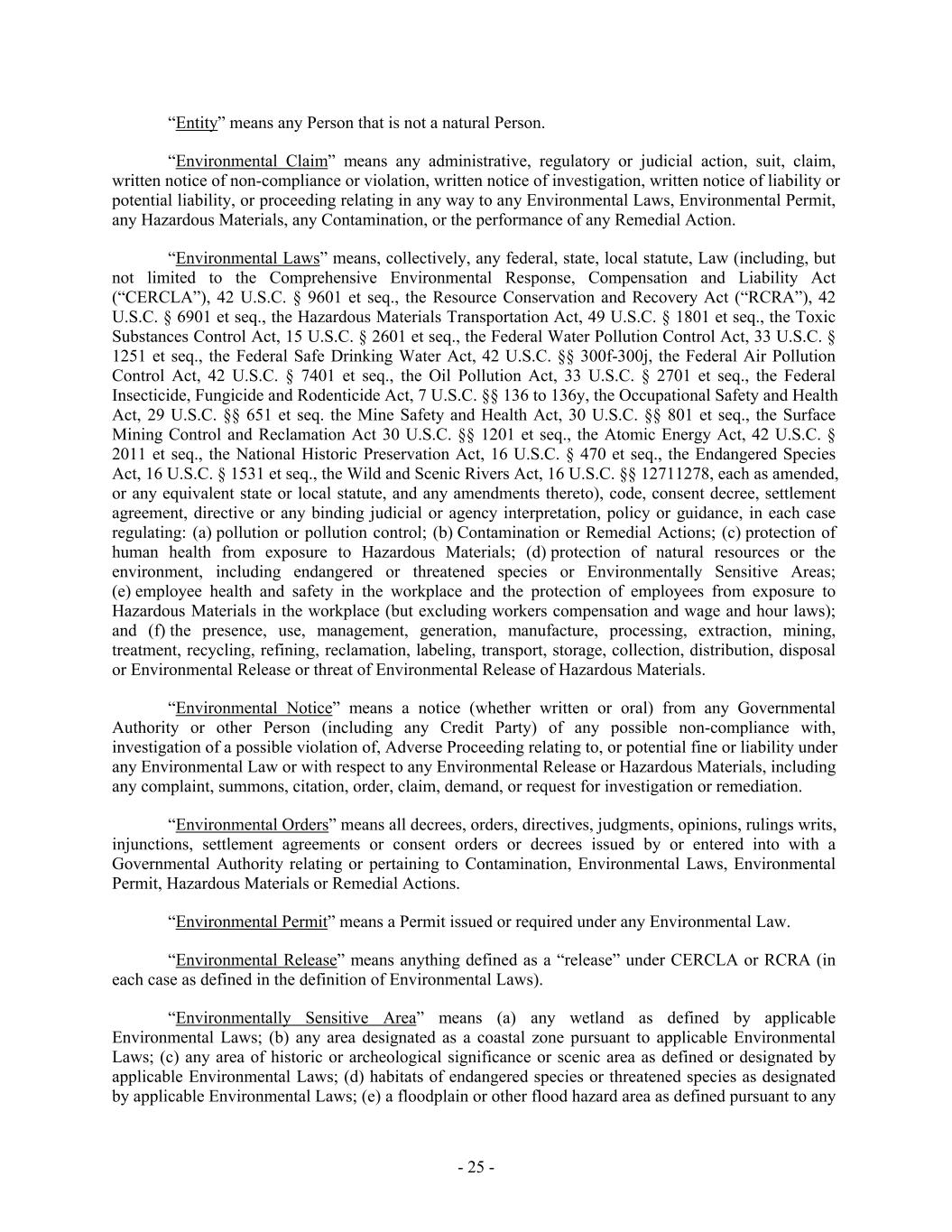 “Entity” means any Person that is not a natural Person. “Environmental Claim” means any administrative, regulatory or judicial action, suit, claim, written notice of non-compliance or violation, written notice of investigation, written notice of liability or potential liability, or proceeding relating in any way to any Environmental Laws, Environmental Permit, any Hazardous Materials, any Contamination, or the performance of any Remedial Action. “Environmental Laws” means, collectively, any federal, state, local statute, Law (including, but not limited to the Comprehensive Environmental Response, Compensation and Liability Act (“CERCLA”), 42 U.S.C. § 9601 et seq., the Resource Conservation and Recovery Act (“RCRA”), 42 U.S.C. § 6901 et seq., the Hazardous Materials Transportation Act, 49 U.S.C. § 1801 et seq., the Toxic Substances Control Act, 15 U.S.C. § 2601 et seq., the Federal Water Pollution Control Act, 33 U.S.C. § 1251 et seq., the Federal Safe Drinking Water Act, 42 U.S.C. §§ 300f-300j, the Federal Air Pollution Control Act, 42 U.S.C. § 7401 et seq., the Oil Pollution Act, 33 U.S.C. § 2701 et seq., the Federal Insecticide, Fungicide and Rodenticide Act, 7 U.S.C. §§ 136 to 136y, the Occupational Safety and Health Act, 29 U.S.C. §§ 651 et seq. the Mine Safety and Health Act, 30 U.S.C. §§ 801 et seq., the Surface Mining Control and Reclamation Act 30 U.S.C. §§ 1201 et seq., the Atomic Energy Act, 42 U.S.C. § 2011 et seq., the National Historic Preservation Act, 16 U.S.C. § 470 et seq., the Endangered Species Act, 16 U.S.C. § 1531 et seq., the Wild and Scenic Rivers Act, 16 U.S.C. §§ 12711278, each as amended, or any equivalent state or local statute, and any amendments thereto), code, consent decree, settlement agreement, directive or any binding judicial or agency interpretation, policy or guidance, in each case regulating: (a) pollution or pollution control; (b) Contamination or Remedial Actions; (c) protection of human health from exposure to Hazardous Materials; (d) protection of natural resources or the environment, including endangered or threatened species or Environmentally Sensitive Areas; (e) employee health and safety in the workplace and the protection of employees from exposure to Hazardous Materials in the workplace (but excluding workers compensation and wage and hour laws); and (f) the presence, use, management, generation, manufacture, processing, extraction, mining, treatment, recycling, refining, reclamation, labeling, transport, storage, collection, distribution, disposal or Environmental Release or threat of Environmental Release of Hazardous Materials. “Environmental Notice” means a notice (whether written or oral) from any Governmental Authority or other Person (including any Credit Party) of any possible non-compliance with, investigation of a possible violation of, Adverse Proceeding relating to, or potential fine or liability under any Environmental Law or with respect to any Environmental Release or Hazardous Materials, including any complaint, summons, citation, order, claim, demand, or request for investigation or remediation. “Environmental Orders” means all decrees, orders, directives, judgments, opinions, rulings writs, injunctions, settlement agreements or consent orders or decrees issued by or entered into with a Governmental Authority relating or pertaining to Contamination, Environmental Laws, Environmental Permit, Hazardous Materials or Remedial Actions. “Environmental Permit” means a Permit issued or required under any Environmental Law. “Environmental Release” means anything defined as a “release” under CERCLA or RCRA (in each case as defined in the definition of Environmental Laws). “Environmentally Sensitive Area” means (a) any wetland as defined by applicable Environmental Laws; (b) any area designated as a coastal zone pursuant to applicable Environmental Laws; (c) any area of historic or archeological significance or scenic area as defined or designated by applicable Environmental Laws; (d) habitats of endangered species or threatened species as designated by applicable Environmental Laws; (e) a floodplain or other flood hazard area as defined pursuant to any - 25 -