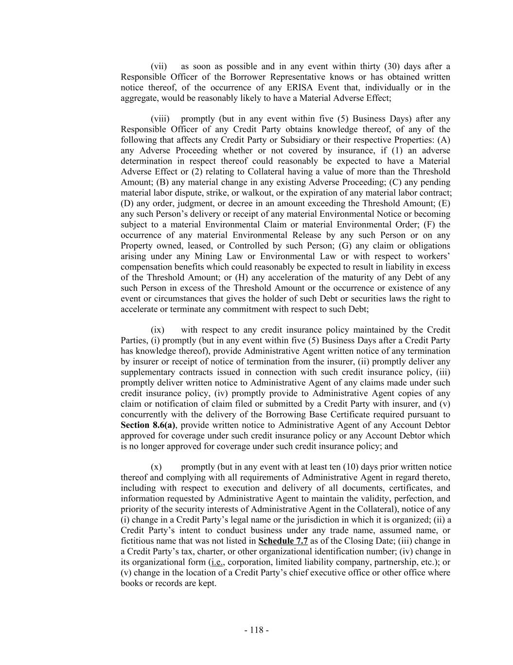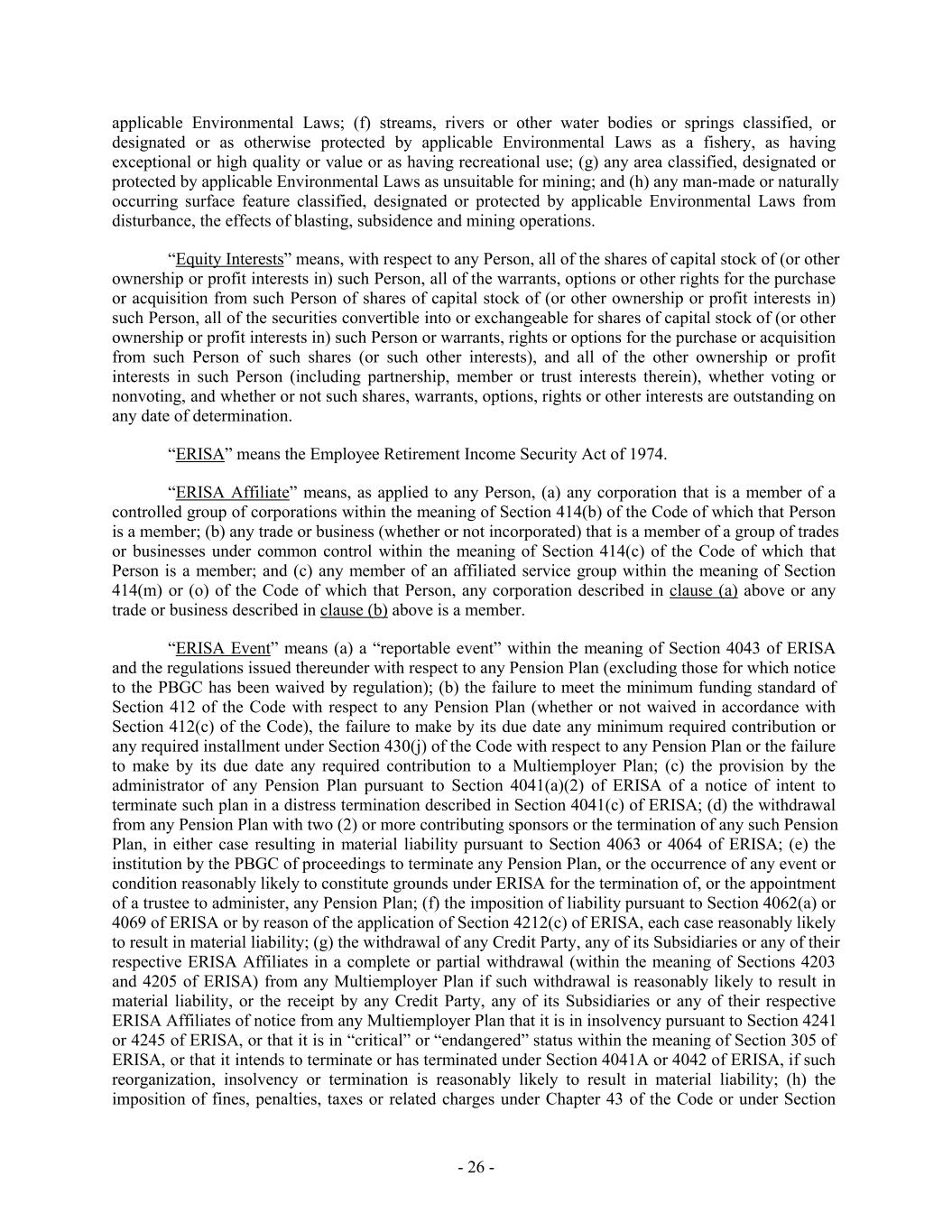 applicable Environmental Laws; (f) streams, rivers or other water bodies or springs classified, or designated or as otherwise protected by applicable Environmental Laws as a fishery, as having exceptional or high quality or value or as having recreational use; (g) any area classified, designated or protected by applicable Environmental Laws as unsuitable for mining; and (h) any man-made or naturally occurring surface feature classified, designated or protected by applicable Environmental Laws from disturbance, the effects of blasting, subsidence and mining operations. “Equity Interests” means, with respect to any Person, all of the shares of capital stock of (or other ownership or profit interests in) such Person, all of the warrants, options or other rights for the purchase or acquisition from such Person of shares of capital stock of (or other ownership or profit interests in) such Person, all of the securities convertible into or exchangeable for shares of capital stock of (or other ownership or profit interests in) such Person or warrants, rights or options for the purchase or acquisition from such Person of such shares (or such other interests), and all of the other ownership or profit interests in such Person (including partnership, member or trust interests therein), whether voting or nonvoting, and whether or not such shares, warrants, options, rights or other interests are outstanding on any date of determination. “ERISA” means the Employee Retirement Income Security Act of 1974. “ERISA Affiliate” means, as applied to any Person, (a) any corporation that is a member of a controlled group of corporations within the meaning of Section 414(b) of the Code of which that Person is a member; (b) any trade or business (whether or not incorporated) that is a member of a group of trades or businesses under common control within the meaning of Section 414(c) of the Code of which that Person is a member; and (c) any member of an affiliated service group within the meaning of Section 414(m) or (o) of the Code of which that Person, any corporation described in clause (a) above or any trade or business described in clause (b) above is a member. “ERISA Event” means (a) a “reportable event” within the meaning of Section 4043 of ERISA and the regulations issued thereunder with respect to any Pension Plan (excluding those for which notice to the PBGC has been waived by regulation); (b) the failure to meet the minimum funding standard of Section 412 of the Code with respect to any Pension Plan (whether or not waived in accordance with Section 412(c) of the Code), the failure to make by its due date any minimum required contribution or any required installment under Section 430(j) of the Code with respect to any Pension Plan or the failure to make by its due date any required contribution to a Multiemployer Plan; (c) the provision by the administrator of any Pension Plan pursuant to Section 4041(a)(2) of ERISA of a notice of intent to terminate such plan in a distress termination described in Section 4041(c) of ERISA; (d) the withdrawal from any Pension Plan with two (2) or more contributing sponsors or the termination of any such Pension Plan, in either case resulting in material liability pursuant to Section 4063 or 4064 of ERISA; (e) the institution by the PBGC of proceedings to terminate any Pension Plan, or the occurrence of any event or condition reasonably likely to constitute grounds under ERISA for the termination of, or the appointment of a trustee to administer, any Pension Plan; (f) the imposition of liability pursuant to Section 4062(a) or 4069 of ERISA or by reason of the application of Section 4212(c) of ERISA, each case reasonably likely to result in material liability; (g) the withdrawal of any Credit Party, any of its Subsidiaries or any of their respective ERISA Affiliates in a complete or partial withdrawal (within the meaning of Sections 4203 and 4205 of ERISA) from any Multiemployer Plan if such withdrawal is reasonably likely to result in material liability, or the receipt by any Credit Party, any of its Subsidiaries or any of their respective ERISA Affiliates of notice from any Multiemployer Plan that it is in insolvency pursuant to Section 4241 or 4245 of ERISA, or that it is in “critical” or “endangered” status within the meaning of Section 305 of ERISA, or that it intends to terminate or has terminated under Section 4041A or 4042 of ERISA, if such reorganization, insolvency or termination is reasonably likely to result in material liability; (h) the imposition of fines, penalties, taxes or related charges under Chapter 43 of the Code or under Section - 26 -