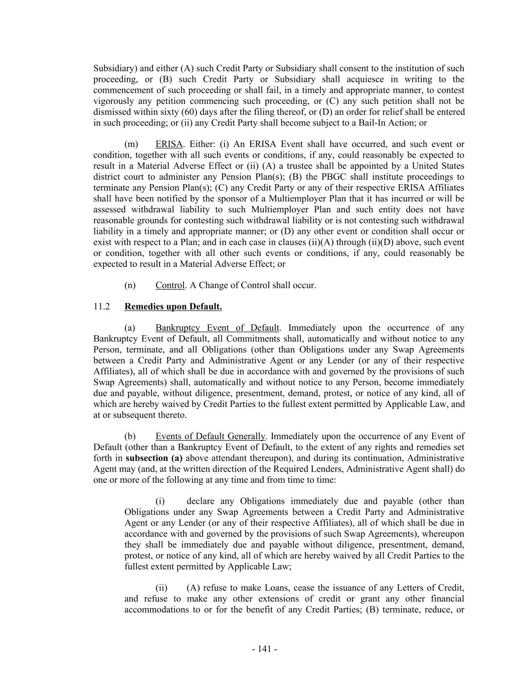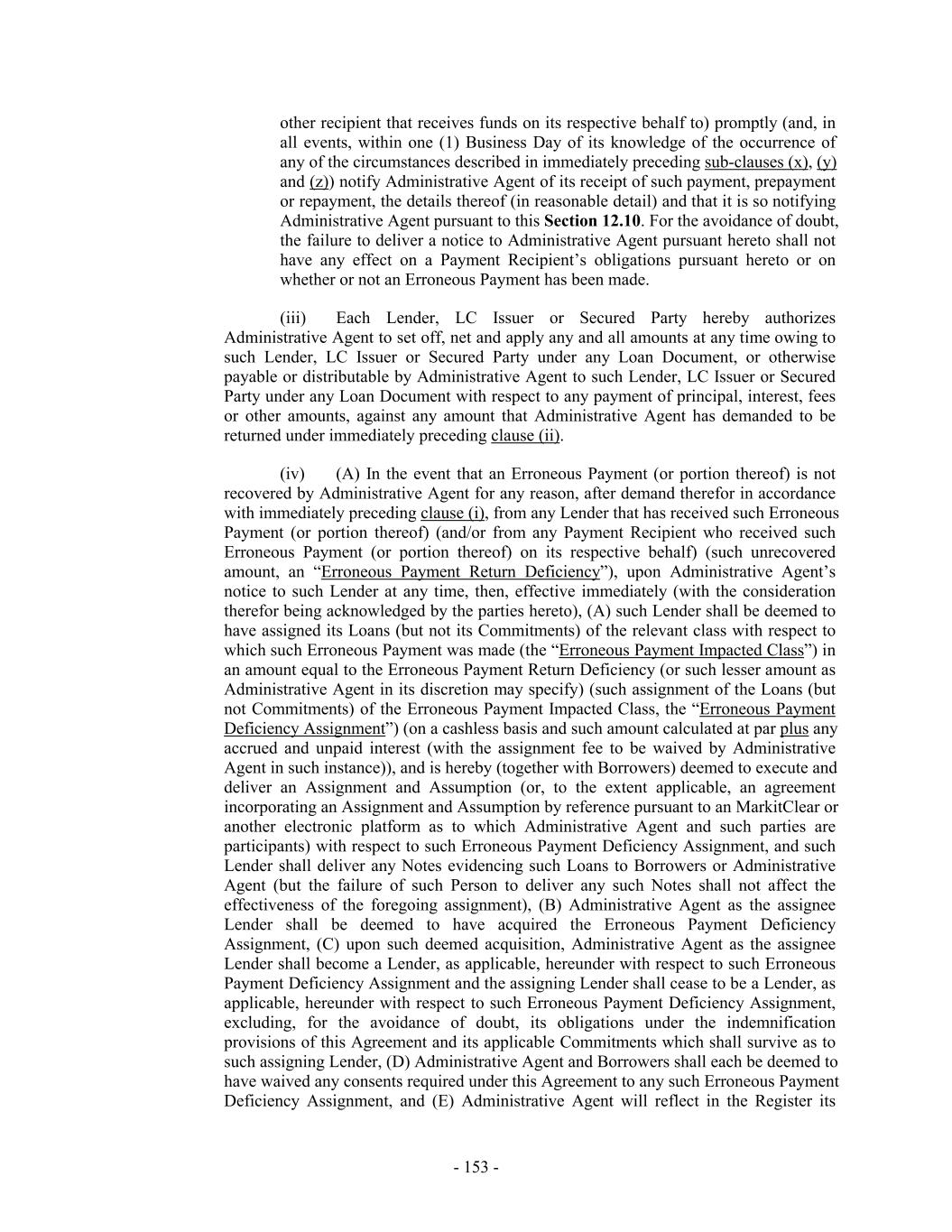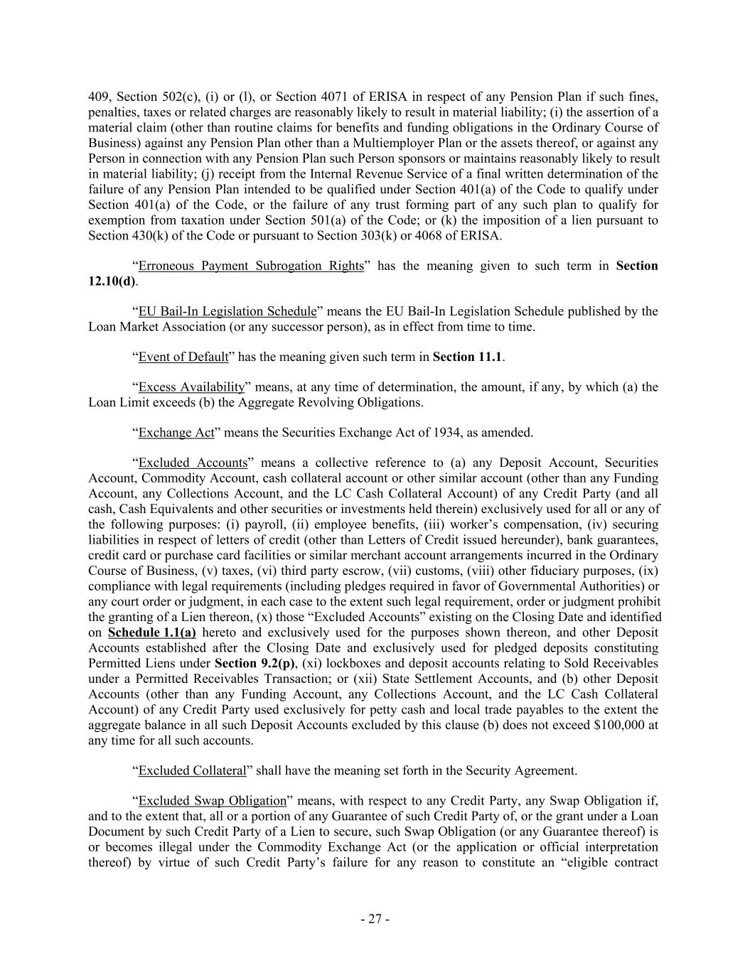 409, Section 502(c), (i) or (l), or Section 4071 of ERISA in respect of any Pension Plan if such fines, penalties, taxes or related charges are reasonably likely to result in material liability; (i) the assertion of a material claim (other than routine claims for benefits and funding obligations in the Ordinary Course of Business) against any Pension Plan other than a Multiemployer Plan or the assets thereof, or against any Person in connection with any Pension Plan such Person sponsors or maintains reasonably likely to result in material liability; (j) receipt from the Internal Revenue Service of a final written determination of the failure of any Pension Plan intended to be qualified under Section 401(a) of the Code to qualify under Section 401(a) of the Code, or the failure of any trust forming part of any such plan to qualify for exemption from taxation under Section 501(a) of the Code; or (k) the imposition of a lien pursuant to Section 430(k) of the Code or pursuant to Section 303(k) or 4068 of ERISA. “Erroneous Payment Subrogation Rights” has the meaning given to such term in Section 12.10(d). “EU Bail-In Legislation Schedule” means the EU Bail-In Legislation Schedule published by the Loan Market Association (or any successor person), as in effect from time to time. “Event of Default” has the meaning given such term in Section 11.1. “Excess Availability” means, at any time of determination, the amount, if any, by which (a) the Loan Limit exceeds (b) the Aggregate Revolving Obligations. “Exchange Act” means the Securities Exchange Act of 1934, as amended. “Excluded Accounts” means a collective reference to (a) any Deposit Account, Securities Account, Commodity Account, cash collateral account or other similar account (other than any Funding Account, any Collections Account, and the LC Cash Collateral Account) of any Credit Party (and all cash, Cash Equivalents and other securities or investments held therein) exclusively used for all or any of the following purposes: (i) payroll, (ii) employee benefits, (iii) worker’s compensation, (iv) securing liabilities in respect of letters of credit (other than Letters of Credit issued hereunder), bank guarantees, credit card or purchase card facilities or similar merchant account arrangements incurred in the Ordinary Course of Business, (v) taxes, (vi) third party escrow, (vii) customs, (viii) other fiduciary purposes, (ix) compliance with legal requirements (including pledges required in favor of Governmental Authorities) or any court order or judgment, in each case to the extent such legal requirement, order or judgment prohibit the granting of a Lien thereon, (x) those “Excluded Accounts” existing on the Closing Date and identified on Schedule 1.1(a) hereto and exclusively used for the purposes shown thereon, and other Deposit Accounts established after the Closing Date and exclusively used for pledged deposits constituting Permitted Liens under Section 9.2(p), (xi) lockboxes and deposit accounts relating to Sold Receivables under a Permitted Receivables Transaction; or (xii) State Settlement Accounts, and (b) other Deposit Accounts (other than any Funding Account, any Collections Account, and the LC Cash Collateral Account) of any Credit Party used exclusively for petty cash and local trade payables to the extent the aggregate balance in all such Deposit Accounts excluded by this clause (b) does not exceed $100,000 at any time for all such accounts. “Excluded Collateral” shall have the meaning set forth in the Security Agreement. “Excluded Swap Obligation” means, with respect to any Credit Party, any Swap Obligation if, and to the extent that, all or a portion of any Guarantee of such Credit Party of, or the grant under a Loan Document by such Credit Party of a Lien to secure, such Swap Obligation (or any Guarantee thereof) is or becomes illegal under the Commodity Exchange Act (or the application or official interpretation thereof) by virtue of such Credit Party’s failure for any reason to constitute an “eligible contract - 27 -