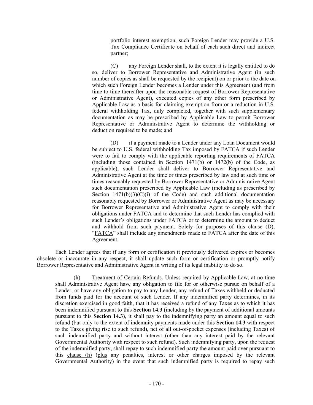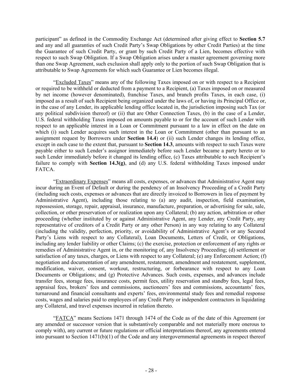 participant” as defined in the Commodity Exchange Act (determined after giving effect to Section 5.7 and any and all guaranties of such Credit Party’s Swap Obligations by other Credit Parties) at the time the Guarantee of such Credit Party, or grant by such Credit Party of a Lien, becomes effective with respect to such Swap Obligation. If a Swap Obligation arises under a master agreement governing more than one Swap Agreement, such exclusion shall apply only to the portion of such Swap Obligation that is attributable to Swap Agreements for which such Guarantee or Lien becomes illegal. “Excluded Taxes” means any of the following Taxes imposed on or with respect to a Recipient or required to be withheld or deducted from a payment to a Recipient, (a) Taxes imposed on or measured by net income (however denominated), franchise Taxes, and branch profits Taxes, in each case, (i) imposed as a result of such Recipient being organized under the laws of, or having its Principal Office or, in the case of any Lender, its applicable lending office located in, the jurisdiction imposing such Tax (or any political subdivision thereof) or (ii) that are Other Connection Taxes, (b) in the case of a Lender, U.S. federal withholding Taxes imposed on amounts payable to or for the account of such Lender with respect to an applicable interest in a Loan or Commitment pursuant to a law in effect on the date on which (i) such Lender acquires such interest in the Loan or Commitment (other than pursuant to an assignment request by Borrowers under Section 14.4) or (ii) such Lender changes its lending office, except in each case to the extent that, pursuant to Section 14.3, amounts with respect to such Taxes were payable either to such Lender’s assignor immediately before such Lender became a party hereto or to such Lender immediately before it changed its lending office, (c) Taxes attributable to such Recipient’s failure to comply with Section 14.3(g), and (d) any U.S. federal withholding Taxes imposed under FATCA. “Extraordinary Expenses” means all costs, expenses, or advances that Administrative Agent may incur during an Event of Default or during the pendency of an Insolvency Proceeding of a Credit Party (including such costs, expenses or advances that are directly invoiced to Borrowers in lieu of payment by Administrative Agent), including those relating to (a) any audit, inspection, field examination, repossession, storage, repair, appraisal, insurance, manufacture, preparation, or advertising for sale, sale, collection, or other preservation of or realization upon any Collateral; (b) any action, arbitration or other proceeding (whether instituted by or against Administrative Agent, any Lender, any Credit Party, any representative of creditors of a Credit Party or any other Person) in any way relating to any Collateral (including the validity, perfection, priority, or avoidability of Administrative Agent’s or any Secured Party’s Liens with respect to any Collateral), Loan Documents, Letters of Credit, or Obligations, including any lender liability or other Claims; (c) the exercise, protection or enforcement of any rights or remedies of Administrative Agent in, or the monitoring of, any Insolvency Proceeding; (d) settlement or satisfaction of any taxes, charges, or Liens with respect to any Collateral; (e) any Enforcement Action; (f) negotiation and documentation of any amendment, restatement, amendment and restatement, supplement, modification, waiver, consent, workout, restructuring, or forbearance with respect to any Loan Documents or Obligations; and (g) Protective Advances. Such costs, expenses, and advances include transfer fees, storage fees, insurance costs, permit fees, utility reservation and standby fees, legal fees, appraisal fees, brokers’ fees and commissions, auctioneers’ fees and commissions, accountants’ fees, turnaround and financial consultants and experts’ fees, environmental study fees and remedial response costs, wages and salaries paid to employees of any Credit Party or independent contractors in liquidating any Collateral, and travel expenses incurred in relation thereto. “FATCA” means Sections 1471 through 1474 of the Code as of the date of this Agreement (or any amended or successor version that is substantively comparable and not materially more onerous to comply with), any current or future regulations or official interpretations thereof, any agreements entered into pursuant to Section 1471(b)(1) of the Code and any intergovernmental agreements in respect thereof - 28 -