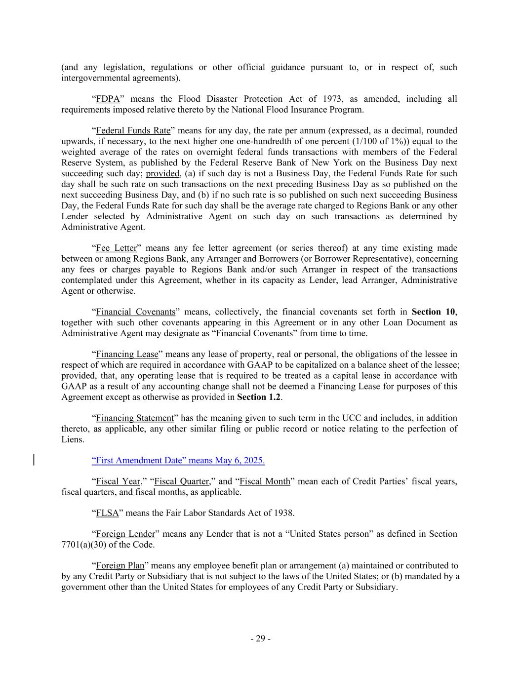 (and any legislation, regulations or other official guidance pursuant to, or in respect of, such intergovernmental agreements). “FDPA” means the Flood Disaster Protection Act of 1973, as amended, including all requirements imposed relative thereto by the National Flood Insurance Program. “Federal Funds Rate” means for any day, the rate per annum (expressed, as a decimal, rounded upwards, if necessary, to the next higher one one-hundredth of one percent (1/100 of 1%)) equal to the weighted average of the rates on overnight federal funds transactions with members of the Federal Reserve System, as published by the Federal Reserve Bank of New York on the Business Day next succeeding such day; provided, (a) if such day is not a Business Day, the Federal Funds Rate for such day shall be such rate on such transactions on the next preceding Business Day as so published on the next succeeding Business Day, and (b) if no such rate is so published on such next succeeding Business Day, the Federal Funds Rate for such day shall be the average rate charged to Regions Bank or any other Lender selected by Administrative Agent on such day on such transactions as determined by Administrative Agent. “Fee Letter” means any fee letter agreement (or series thereof) at any time existing made between or among Regions Bank, any Arranger and Borrowers (or Borrower Representative), concerning any fees or charges payable to Regions Bank and/or such Arranger in respect of the transactions contemplated under this Agreement, whether in its capacity as Lender, lead Arranger, Administrative Agent or otherwise. “Financial Covenants” means, collectively, the financial covenants set forth in Section 10, together with such other covenants appearing in this Agreement or in any other Loan Document as Administrative Agent may designate as “Financial Covenants” from time to time. “Financing Lease” means any lease of property, real or personal, the obligations of the lessee in respect of which are required in accordance with GAAP to be capitalized on a balance sheet of the lessee; provided, that, any operating lease that is required to be treated as a capital lease in accordance with GAAP as a result of any accounting change shall not be deemed a Financing Lease for purposes of this Agreement except as otherwise as provided in Section 1.2. “Financing Statement” has the meaning given to such term in the UCC and includes, in addition thereto, as applicable, any other similar filing or public record or notice relating to the perfection of Liens. “First Amendment Date” means May 6, 2025. “Fiscal Year,” “Fiscal Quarter,” and “Fiscal Month” mean each of Credit Parties’ fiscal years, fiscal quarters, and fiscal months, as applicable. “FLSA” means the Fair Labor Standards Act of 1938. “Foreign Lender” means any Lender that is not a “United States person” as defined in Section 7701(a)(30) of the Code. “Foreign Plan” means any employee benefit plan or arrangement (a) maintained or contributed to by any Credit Party or Subsidiary that is not subject to the laws of the United States; or (b) mandated by a government other than the United States for employees of any Credit Party or Subsidiary. - 29 -