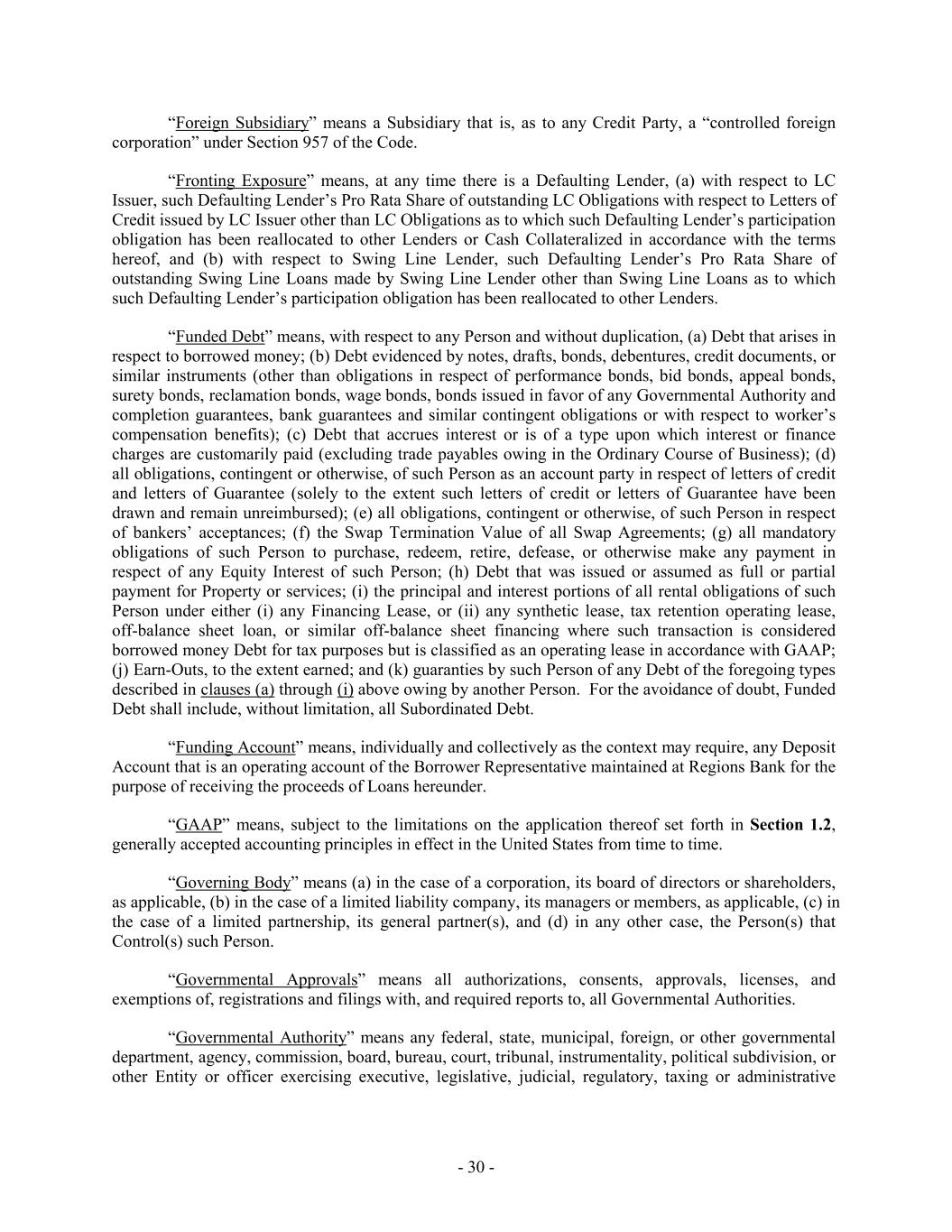 “Foreign Subsidiary” means a Subsidiary that is, as to any Credit Party, a “controlled foreign corporation” under Section 957 of the Code. “Fronting Exposure” means, at any time there is a Defaulting Lender, (a) with respect to LC Issuer, such Defaulting Lender’s Pro Rata Share of outstanding LC Obligations with respect to Letters of Credit issued by LC Issuer other than LC Obligations as to which such Defaulting Lender’s participation obligation has been reallocated to other Lenders or Cash Collateralized in accordance with the terms hereof, and (b) with respect to Swing Line Lender, such Defaulting Lender’s Pro Rata Share of outstanding Swing Line Loans made by Swing Line Lender other than Swing Line Loans as to which such Defaulting Lender’s participation obligation has been reallocated to other Lenders. “Funded Debt” means, with respect to any Person and without duplication, (a) Debt that arises in respect to borrowed money; (b) Debt evidenced by notes, drafts, bonds, debentures, credit documents, or similar instruments (other than obligations in respect of performance bonds, bid bonds, appeal bonds, surety bonds, reclamation bonds, wage bonds, bonds issued in favor of any Governmental Authority and completion guarantees, bank guarantees and similar contingent obligations or with respect to worker’s compensation benefits); (c) Debt that accrues interest or is of a type upon which interest or finance charges are customarily paid (excluding trade payables owing in the Ordinary Course of Business); (d) all obligations, contingent or otherwise, of such Person as an account party in respect of letters of credit and letters of Guarantee (solely to the extent such letters of credit or letters of Guarantee have been drawn and remain unreimbursed); (e) all obligations, contingent or otherwise, of such Person in respect of bankers’ acceptances; (f) the Swap Termination Value of all Swap Agreements; (g) all mandatory obligations of such Person to purchase, redeem, retire, defease, or otherwise make any payment in respect of any Equity Interest of such Person; (h) Debt that was issued or assumed as full or partial payment for Property or services; (i) the principal and interest portions of all rental obligations of such Person under either (i) any Financing Lease, or (ii) any synthetic lease, tax retention operating lease, off-balance sheet loan, or similar off-balance sheet financing where such transaction is considered borrowed money Debt for tax purposes but is classified as an operating lease in accordance with GAAP; (j) Earn-Outs, to the extent earned; and (k) guaranties by such Person of any Debt of the foregoing types described in clauses (a) through (i) above owing by another Person. For the avoidance of doubt, Funded Debt shall include, without limitation, all Subordinated Debt. “Funding Account” means, individually and collectively as the context may require, any Deposit Account that is an operating account of the Borrower Representative maintained at Regions Bank for the purpose of receiving the proceeds of Loans hereunder. “GAAP” means, subject to the limitations on the application thereof set forth in Section 1.2, generally accepted accounting principles in effect in the United States from time to time. “Governing Body” means (a) in the case of a corporation, its board of directors or shareholders, as applicable, (b) in the case of a limited liability company, its managers or members, as applicable, (c) in the case of a limited partnership, its general partner(s), and (d) in any other case, the Person(s) that Control(s) such Person. “Governmental Approvals” means all authorizations, consents, approvals, licenses, and exemptions of, registrations and filings with, and required reports to, all Governmental Authorities. “Governmental Authority” means any federal, state, municipal, foreign, or other governmental department, agency, commission, board, bureau, court, tribunal, instrumentality, political subdivision, or other Entity or officer exercising executive, legislative, judicial, regulatory, taxing or administrative - 30 -