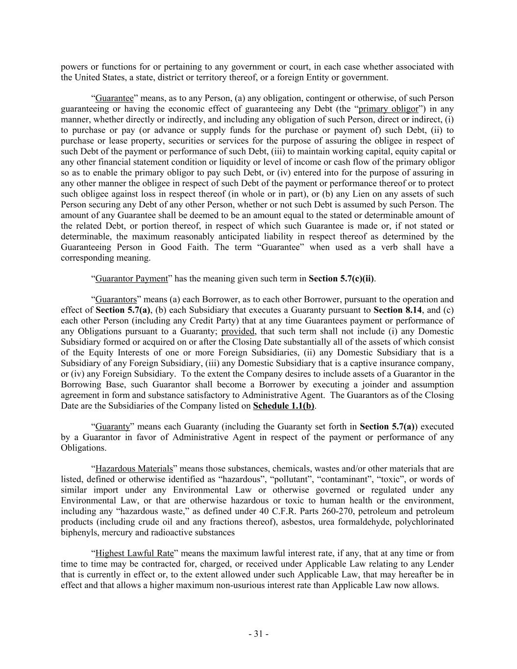 powers or functions for or pertaining to any government or court, in each case whether associated with the United States, a state, district or territory thereof, or a foreign Entity or government. “Guarantee” means, as to any Person, (a) any obligation, contingent or otherwise, of such Person guaranteeing or having the economic effect of guaranteeing any Debt (the “primary obligor”) in any manner, whether directly or indirectly, and including any obligation of such Person, direct or indirect, (i) to purchase or pay (or advance or supply funds for the purchase or payment of) such Debt, (ii) to purchase or lease property, securities or services for the purpose of assuring the obligee in respect of such Debt of the payment or performance of such Debt, (iii) to maintain working capital, equity capital or any other financial statement condition or liquidity or level of income or cash flow of the primary obligor so as to enable the primary obligor to pay such Debt, or (iv) entered into for the purpose of assuring in any other manner the obligee in respect of such Debt of the payment or performance thereof or to protect such obligee against loss in respect thereof (in whole or in part), or (b) any Lien on any assets of such Person securing any Debt of any other Person, whether or not such Debt is assumed by such Person. The amount of any Guarantee shall be deemed to be an amount equal to the stated or determinable amount of the related Debt, or portion thereof, in respect of which such Guarantee is made or, if not stated or determinable, the maximum reasonably anticipated liability in respect thereof as determined by the Guaranteeing Person in Good Faith. The term “Guarantee” when used as a verb shall have a corresponding meaning. “Guarantor Payment” has the meaning given such term in Section 5.7(c)(ii). “Guarantors” means (a) each Borrower, as to each other Borrower, pursuant to the operation and effect of Section 5.7(a), (b) each Subsidiary that executes a Guaranty pursuant to Section 8.14, and (c) each other Person (including any Credit Party) that at any time Guarantees payment or performance of any Obligations pursuant to a Guaranty; provided, that such term shall not include (i) any Domestic Subsidiary formed or acquired on or after the Closing Date substantially all of the assets of which consist of the Equity Interests of one or more Foreign Subsidiaries, (ii) any Domestic Subsidiary that is a Subsidiary of any Foreign Subsidiary, (iii) any Domestic Subsidiary that is a captive insurance company, or (iv) any Foreign Subsidiary. To the extent the Company desires to include assets of a Guarantor in the Borrowing Base, such Guarantor shall become a Borrower by executing a joinder and assumption agreement in form and substance satisfactory to Administrative Agent. The Guarantors as of the Closing Date are the Subsidiaries of the Company listed on Schedule 1.1(b). “Guaranty” means each Guaranty (including the Guaranty set forth in Section 5.7(a)) executed by a Guarantor in favor of Administrative Agent in respect of the payment or performance of any Obligations. “Hazardous Materials” means those substances, chemicals, wastes and/or other materials that are listed, defined or otherwise identified as “hazardous”, “pollutant”, “contaminant”, “toxic”, or words of similar import under any Environmental Law or otherwise governed or regulated under any Environmental Law, or that are otherwise hazardous or toxic to human health or the environment, including any “hazardous waste,” as defined under 40 C.F.R. Parts 260-270, petroleum and petroleum products (including crude oil and any fractions thereof), asbestos, urea formaldehyde, polychlorinated biphenyls, mercury and radioactive substances “Highest Lawful Rate” means the maximum lawful interest rate, if any, that at any time or from time to time may be contracted for, charged, or received under Applicable Law relating to any Lender that is currently in effect or, to the extent allowed under such Applicable Law, that may hereafter be in effect and that allows a higher maximum non-usurious interest rate than Applicable Law now allows. - 31 -
