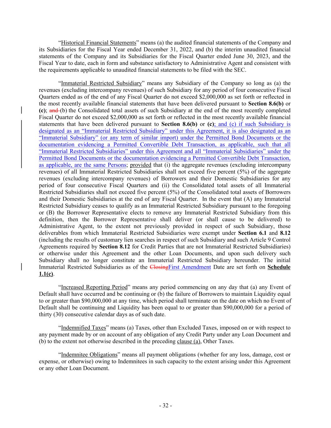 “Historical Financial Statements” means (a) the audited financial statements of the Company and its Subsidiaries for the Fiscal Year ended December 31, 2022, and (b) the interim unaudited financial statements of the Company and its Subsidiaries for the Fiscal Quarter ended June 30, 2023, and the Fiscal Year to date, each in form and substance satisfactory to Administrative Agent and consistent with the requirements applicable to unaudited financial statements to be filed with the SEC. “Immaterial Restricted Subsidiary” means any Subsidiary of the Company so long as (a) the revenues (excluding intercompany revenues) of such Subsidiary for any period of four consecutive Fiscal Quarters ended as of the end of any Fiscal Quarter do not exceed $2,000,000 as set forth or reflected in the most recently available financial statements that have been delivered pursuant to Section 8.6(b) or (c); and (b) the Consolidated total assets of such Subsidiary at the end of the most recently completed Fiscal Quarter do not exceed $2,000,000 as set forth or reflected in the most recently available financial statements that have been delivered pursuant to Section 8.6(b) or (c); and (c) if such Subsidiary is designated as an “Immaterial Restricted Subsidiary” under this Agreement, it is also designated as an “Immaterial Subsidiary” (or any term of similar import) under the Permitted Bond Documents or the documentation evidencing a Permitted Convertible Debt Transaction, as applicable, such that all “Immaterial Restricted Subsidiaries” under this Agreement and all “Immaterial Subsidiaries” under the Permitted Bond Documents or the documentation evidencing a Permitted Convertible Debt Transaction, as applicable, are the same Persons; provided that (i) the aggregate revenues (excluding intercompany revenues) of all Immaterial Restricted Subsidiaries shall not exceed five percent (5%) of the aggregate revenues (excluding intercompany revenues) of Borrowers and their Domestic Subsidiaries for any period of four consecutive Fiscal Quarters and (ii) the Consolidated total assets of all Immaterial Restricted Subsidiaries shall not exceed five percent (5%) of the Consolidated total assets of Borrowers and their Domestic Subsidiaries at the end of any Fiscal Quarter. In the event that (A) any Immaterial Restricted Subsidiary ceases to qualify as an Immaterial Restricted Subsidiary pursuant to the foregoing or (B) the Borrower Representative elects to remove any Immaterial Restricted Subsidiary from this definition, then the Borrower Representative shall deliver (or shall cause to be delivered) to Administrative Agent, to the extent not previously provided in respect of such Subsidiary, those deliverables from which Immaterial Restricted Subsidiaries were exempt under Section 6.1 and 8.12 (including the results of customary lien searches in respect of such Subsidiary and such Article 9 Control Agreements required by Section 8.12 for Credit Parties that are not Immaterial Restricted Subsidiaries) or otherwise under this Agreement and the other Loan Documents, and upon such delivery such Subsidiary shall no longer constitute an Immaterial Restricted Subsidiary hereunder. The initial Immaterial Restricted Subsidiaries as of the ClosingFirst Amendment Date are set forth on Schedule 1.1(c). “Increased Reporting Period” means any period commencing on any day that (a) any Event of Default shall have occurred and be continuing or (b) the failure of Borrowers to maintain Liquidity equal to or greater than $90,000,000 at any time, which period shall terminate on the date on which no Event of Default shall be continuing and Liquidity has been equal to or greater than $90,000,000 for a period of thirty (30) consecutive calendar days as of such date. “Indemnified Taxes” means (a) Taxes, other than Excluded Taxes, imposed on or with respect to any payment made by or on account of any obligation of any Credit Party under any Loan Document and (b) to the extent not otherwise described in the preceding clause (a), Other Taxes. “Indemnitee Obligations” means all payment obligations (whether for any loss, damage, cost or expense, or otherwise) owing to Indemnitees in such capacity to the extent arising under this Agreement or any other Loan Document. - 32 -