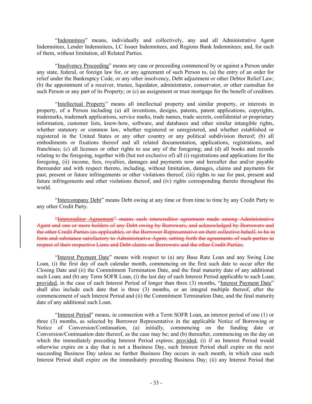 “Indemnitees” means, individually and collectively, any and all Administrative Agent Indemnitees, Lender Indemnitees, LC Issuer Indemnitees, and Regions Bank Indemnitees; and, for each of them, without limitation, all Related Parties. “Insolvency Proceeding” means any case or proceeding commenced by or against a Person under any state, federal, or foreign law for, or any agreement of such Person to, (a) the entry of an order for relief under the Bankruptcy Code, or any other insolvency, Debt adjustment or other Debtor Relief Law; (b) the appointment of a receiver, trustee, liquidator, administrator, conservator, or other custodian for such Person or any part of its Property; or (c) an assignment or trust mortgage for the benefit of creditors. “Intellectual Property” means all intellectual property and similar property, or interests in property, of a Person including (a) all inventions, designs, patents, patent applications, copyrights, trademarks, trademark applications, service marks, trade names, trade secrets, confidential or proprietary information, customer lists, know-how, software, and databases and other similar intangible rights, whether statutory or common law, whether registered or unregistered, and whether established or registered in the United States or any other country or any political subdivision thereof; (b) all embodiments or fixations thereof and all related documentation, applications, registrations, and franchises; (c) all licenses or other rights to use any of the foregoing; and (d) all books and records relating to the foregoing, together with (but not exclusive of) all (i) registrations and applications for the foregoing, (ii) income, fees, royalties, damages and payments now and hereafter due and/or payable thereunder and with respect thereto, including, without limitation, damages, claims and payments for past, present or future infringements or other violations thereof, (iii) rights to sue for past, present and future infringements and other violations thereof, and (iv) rights corresponding thereto throughout the world. “Intercompany Debt” means Debt owing at any time or from time to time by any Credit Party to any other Credit Party. “Intercreditor Agreement” means each intercreditor agreement made among Administrative Agent and one or more holders of any Debt owing by Borrowers, and acknowledged by Borrowers and the other Credit Parties (as applicable), or the Borrower Representative on their collective behalf, to be in form and substance satisfactory to Administrative Agent, setting forth the agreements of such parties in respect of their respective Liens and Debt claims on Borrowers and the other Credit Parties. “Interest Payment Date” means with respect to (a) any Base Rate Loan and any Swing Line Loan, (i) the first day of each calendar month, commencing on the first such date to occur after the Closing Date and (ii) the Commitment Termination Date, and the final maturity date of any additional such Loan; and (b) any Term SOFR Loan, (i) the last day of each Interest Period applicable to such Loan; provided, in the case of each Interest Period of longer than three (3) months, “Interest Payment Date” shall also include each date that is three (3) months, or an integral multiple thereof, after the commencement of such Interest Period and (ii) the Commitment Termination Date, and the final maturity date of any additional such Loan. “Interest Period” means, in connection with a Term SOFR Loan, an interest period of one (1) or three (3) months, as selected by Borrower Representative in the applicable Notice of Borrowing or Notice of Conversion/Continuation, (a) initially, commencing on the funding date or Conversion/Continuation date thereof, as the case may be; and (b) thereafter, commencing on the day on which the immediately preceding Interest Period expires; provided, (i) if an Interest Period would otherwise expire on a day that is not a Business Day, such Interest Period shall expire on the next succeeding Business Day unless no further Business Day occurs in such month, in which case such Interest Period shall expire on the immediately preceding Business Day; (ii) any Interest Period that - 33 -