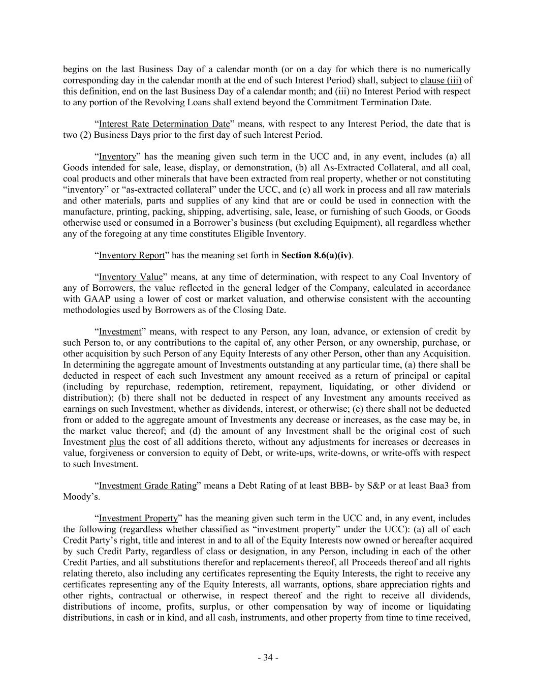 begins on the last Business Day of a calendar month (or on a day for which there is no numerically corresponding day in the calendar month at the end of such Interest Period) shall, subject to clause (iii) of this definition, end on the last Business Day of a calendar month; and (iii) no Interest Period with respect to any portion of the Revolving Loans shall extend beyond the Commitment Termination Date. “Interest Rate Determination Date” means, with respect to any Interest Period, the date that is two (2) Business Days prior to the first day of such Interest Period. “Inventory” has the meaning given such term in the UCC and, in any event, includes (a) all Goods intended for sale, lease, display, or demonstration, (b) all As-Extracted Collateral, and all coal, coal products and other minerals that have been extracted from real property, whether or not constituting “inventory” or “as-extracted collateral” under the UCC, and (c) all work in process and all raw materials and other materials, parts and supplies of any kind that are or could be used in connection with the manufacture, printing, packing, shipping, advertising, sale, lease, or furnishing of such Goods, or Goods otherwise used or consumed in a Borrower’s business (but excluding Equipment), all regardless whether any of the foregoing at any time constitutes Eligible Inventory. “Inventory Report” has the meaning set forth in Section 8.6(a)(iv). “Inventory Value” means, at any time of determination, with respect to any Coal Inventory of any of Borrowers, the value reflected in the general ledger of the Company, calculated in accordance with GAAP using a lower of cost or market valuation, and otherwise consistent with the accounting methodologies used by Borrowers as of the Closing Date. “Investment” means, with respect to any Person, any loan, advance, or extension of credit by such Person to, or any contributions to the capital of, any other Person, or any ownership, purchase, or other acquisition by such Person of any Equity Interests of any other Person, other than any Acquisition. In determining the aggregate amount of Investments outstanding at any particular time, (a) there shall be deducted in respect of each such Investment any amount received as a return of principal or capital (including by repurchase, redemption, retirement, repayment, liquidating, or other dividend or distribution); (b) there shall not be deducted in respect of any Investment any amounts received as earnings on such Investment, whether as dividends, interest, or otherwise; (c) there shall not be deducted from or added to the aggregate amount of Investments any decrease or increases, as the case may be, in the market value thereof; and (d) the amount of any Investment shall be the original cost of such Investment plus the cost of all additions thereto, without any adjustments for increases or decreases in value, forgiveness or conversion to equity of Debt, or write-ups, write-downs, or write-offs with respect to such Investment. “Investment Grade Rating” means a Debt Rating of at least BBB- by S&P or at least Baa3 from Moody’s. “Investment Property” has the meaning given such term in the UCC and, in any event, includes the following (regardless whether classified as “investment property” under the UCC): (a) all of each Credit Party’s right, title and interest in and to all of the Equity Interests now owned or hereafter acquired by such Credit Party, regardless of class or designation, in any Person, including in each of the other Credit Parties, and all substitutions therefor and replacements thereof, all Proceeds thereof and all rights relating thereto, also including any certificates representing the Equity Interests, the right to receive any certificates representing any of the Equity Interests, all warrants, options, share appreciation rights and other rights, contractual or otherwise, in respect thereof and the right to receive all dividends, distributions of income, profits, surplus, or other compensation by way of income or liquidating distributions, in cash or in kind, and all cash, instruments, and other property from time to time received, - 34 -