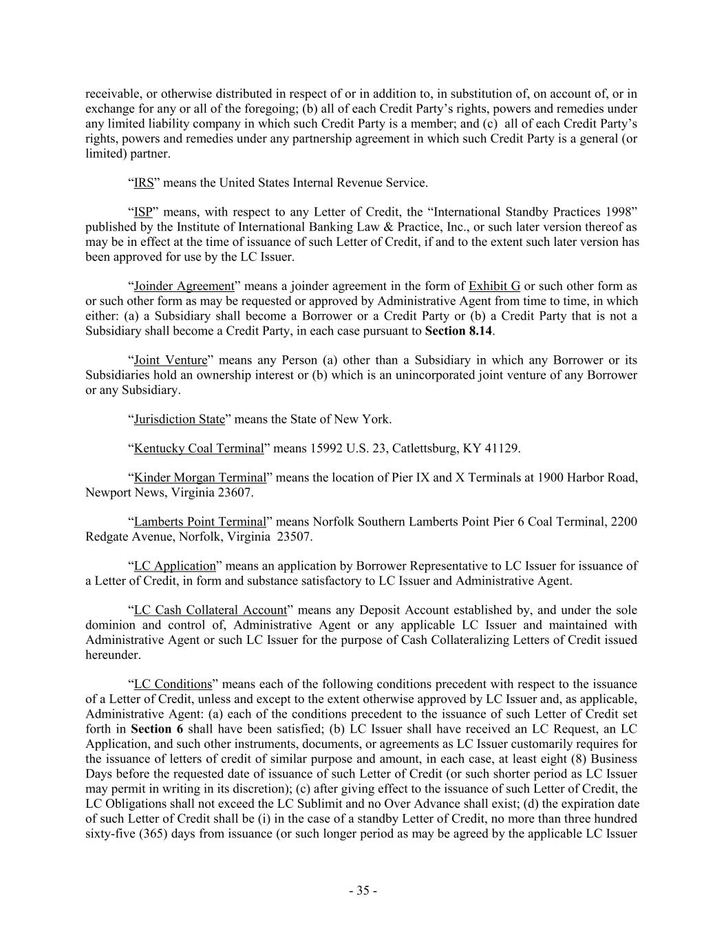 receivable, or otherwise distributed in respect of or in addition to, in substitution of, on account of, or in exchange for any or all of the foregoing; (b) all of each Credit Party’s rights, powers and remedies under any limited liability company in which such Credit Party is a member; and (c) all of each Credit Party’s rights, powers and remedies under any partnership agreement in which such Credit Party is a general (or limited) partner. “IRS” means the United States Internal Revenue Service. “ISP” means, with respect to any Letter of Credit, the “International Standby Practices 1998” published by the Institute of International Banking Law & Practice, Inc., or such later version thereof as may be in effect at the time of issuance of such Letter of Credit, if and to the extent such later version has been approved for use by the LC Issuer. “Joinder Agreement” means a joinder agreement in the form of Exhibit G or such other form as or such other form as may be requested or approved by Administrative Agent from time to time, in which either: (a) a Subsidiary shall become a Borrower or a Credit Party or (b) a Credit Party that is not a Subsidiary shall become a Credit Party, in each case pursuant to Section 8.14. “Joint Venture” means any Person (a) other than a Subsidiary in which any Borrower or its Subsidiaries hold an ownership interest or (b) which is an unincorporated joint venture of any Borrower or any Subsidiary. “Jurisdiction State” means the State of New York. “Kentucky Coal Terminal” means 15992 U.S. 23, Catlettsburg, KY 41129. “Kinder Morgan Terminal” means the location of Pier IX and X Terminals at 1900 Harbor Road, Newport News, Virginia 23607. “Lamberts Point Terminal” means Norfolk Southern Lamberts Point Pier 6 Coal Terminal, 2200 Redgate Avenue, Norfolk, Virginia 23507. “LC Application” means an application by Borrower Representative to LC Issuer for issuance of a Letter of Credit, in form and substance satisfactory to LC Issuer and Administrative Agent. “LC Cash Collateral Account” means any Deposit Account established by, and under the sole dominion and control of, Administrative Agent or any applicable LC Issuer and maintained with Administrative Agent or such LC Issuer for the purpose of Cash Collateralizing Letters of Credit issued hereunder. “LC Conditions” means each of the following conditions precedent with respect to the issuance of a Letter of Credit, unless and except to the extent otherwise approved by LC Issuer and, as applicable, Administrative Agent: (a) each of the conditions precedent to the issuance of such Letter of Credit set forth in Section 6 shall have been satisfied; (b) LC Issuer shall have received an LC Request, an LC Application, and such other instruments, documents, or agreements as LC Issuer customarily requires for the issuance of letters of credit of similar purpose and amount, in each case, at least eight (8) Business Days before the requested date of issuance of such Letter of Credit (or such shorter period as LC Issuer may permit in writing in its discretion); (c) after giving effect to the issuance of such Letter of Credit, the LC Obligations shall not exceed the LC Sublimit and no Over Advance shall exist; (d) the expiration date of such Letter of Credit shall be (i) in the case of a standby Letter of Credit, no more than three hundred sixty-five (365) days from issuance (or such longer period as may be agreed by the applicable LC Issuer - 35 -
