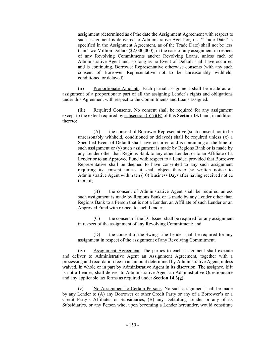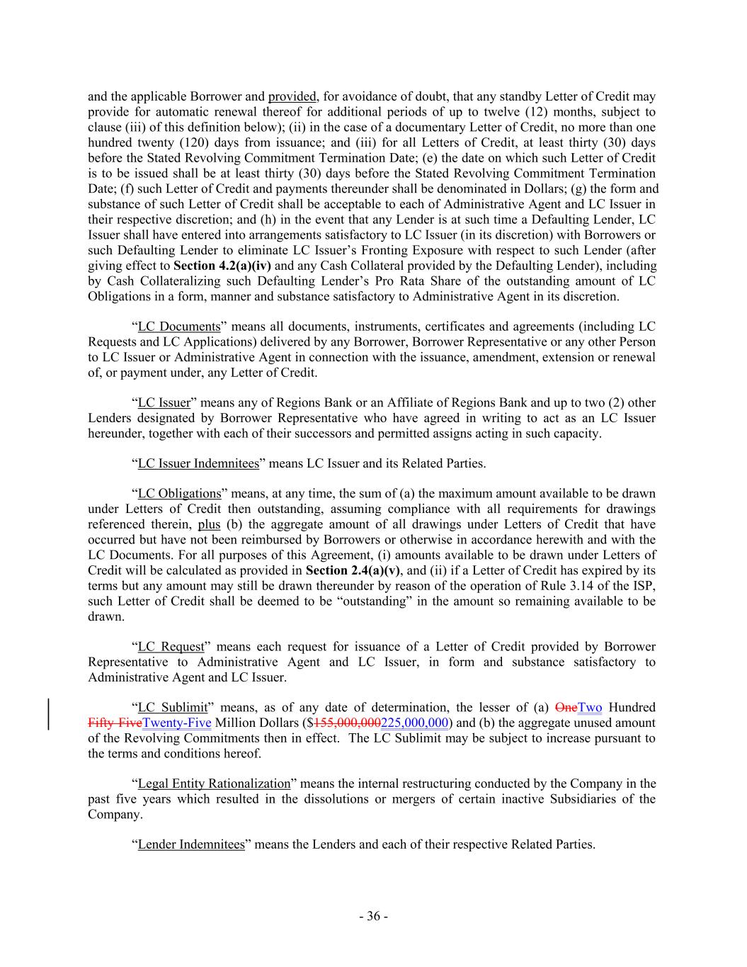 and the applicable Borrower and provided, for avoidance of doubt, that any standby Letter of Credit may provide for automatic renewal thereof for additional periods of up to twelve (12) months, subject to clause (iii) of this definition below); (ii) in the case of a documentary Letter of Credit, no more than one hundred twenty (120) days from issuance; and (iii) for all Letters of Credit, at least thirty (30) days before the Stated Revolving Commitment Termination Date; (e) the date on which such Letter of Credit is to be issued shall be at least thirty (30) days before the Stated Revolving Commitment Termination Date; (f) such Letter of Credit and payments thereunder shall be denominated in Dollars; (g) the form and substance of such Letter of Credit shall be acceptable to each of Administrative Agent and LC Issuer in their respective discretion; and (h) in the event that any Lender is at such time a Defaulting Lender, LC Issuer shall have entered into arrangements satisfactory to LC Issuer (in its discretion) with Borrowers or such Defaulting Lender to eliminate LC Issuer’s Fronting Exposure with respect to such Lender (after giving effect to Section 4.2(a)(iv) and any Cash Collateral provided by the Defaulting Lender), including by Cash Collateralizing such Defaulting Lender’s Pro Rata Share of the outstanding amount of LC Obligations in a form, manner and substance satisfactory to Administrative Agent in its discretion. “LC Documents” means all documents, instruments, certificates and agreements (including LC Requests and LC Applications) delivered by any Borrower, Borrower Representative or any other Person to LC Issuer or Administrative Agent in connection with the issuance, amendment, extension or renewal of, or payment under, any Letter of Credit. “LC Issuer” means any of Regions Bank or an Affiliate of Regions Bank and up to two (2) other Lenders designated by Borrower Representative who have agreed in writing to act as an LC Issuer hereunder, together with each of their successors and permitted assigns acting in such capacity. “LC Issuer Indemnitees” means LC Issuer and its Related Parties. “LC Obligations” means, at any time, the sum of (a) the maximum amount available to be drawn under Letters of Credit then outstanding, assuming compliance with all requirements for drawings referenced therein, plus (b) the aggregate amount of all drawings under Letters of Credit that have occurred but have not been reimbursed by Borrowers or otherwise in accordance herewith and with the LC Documents. For all purposes of this Agreement, (i) amounts available to be drawn under Letters of Credit will be calculated as provided in Section 2.4(a)(v), and (ii) if a Letter of Credit has expired by its terms but any amount may still be drawn thereunder by reason of the operation of Rule 3.14 of the ISP, such Letter of Credit shall be deemed to be “outstanding” in the amount so remaining available to be drawn. “LC Request” means each request for issuance of a Letter of Credit provided by Borrower Representative to Administrative Agent and LC Issuer, in form and substance satisfactory to Administrative Agent and LC Issuer. “LC Sublimit” means, as of any date of determination, the lesser of (a) OneTwo Hundred Fifty FiveTwenty-Five Million Dollars ($155,000,000225,000,000) and (b) the aggregate unused amount of the Revolving Commitments then in effect. The LC Sublimit may be subject to increase pursuant to the terms and conditions hereof. “Legal Entity Rationalization” means the internal restructuring conducted by the Company in the past five years which resulted in the dissolutions or mergers of certain inactive Subsidiaries of the Company. “Lender Indemnitees” means the Lenders and each of their respective Related Parties. - 36 -