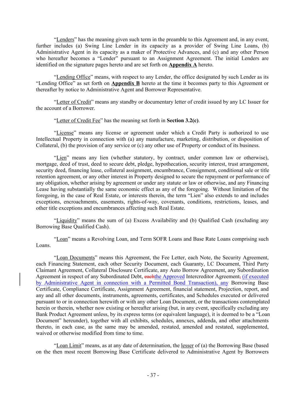 “Lenders” has the meaning given such term in the preamble to this Agreement and, in any event, further includes (a) Swing Line Lender in its capacity as a provider of Swing Line Loans, (b) Administrative Agent in its capacity as a maker of Protective Advances, and (c) and any other Person who hereafter becomes a “Lender” pursuant to an Assignment Agreement. The initial Lenders are identified on the signature pages hereto and are set forth on Appendix A hereto. “Lending Office” means, with respect to any Lender, the office designated by such Lender as its “Lending Office” as set forth on Appendix B hereto at the time it becomes party to this Agreement or thereafter by notice to Administrative Agent and Borrower Representative. “Letter of Credit” means any standby or documentary letter of credit issued by any LC Issuer for the account of a Borrower. “Letter of Credit Fee” has the meaning set forth in Section 3.2(c). “License” means any license or agreement under which a Credit Party is authorized to use Intellectual Property in connection with (a) any manufacture, marketing, distribution, or disposition of Collateral, (b) the provision of any service or (c) any other use of Property or conduct of its business. “Lien” means any lien (whether statutory, by contract, under common law or otherwise), mortgage, deed of trust, deed to secure debt, pledge, hypothecation, security interest, trust arrangement, security deed, financing lease, collateral assignment, encumbrance, Consignment, conditional sale or title retention agreement, or any other interest in Property designed to secure the repayment or performance of any obligation, whether arising by agreement or under any statute or law or otherwise, and any Financing Lease having substantially the same economic effect as any of the foregoing. Without limitation of the foregoing, in the case of Real Estate, or interests therein, the term “Lien” also extends to and includes exceptions, encroachments, easements, rights-of-way, covenants, conditions, restrictions, leases, and other title exceptions and encumbrances affecting such Real Estate. “Liquidity” means the sum of (a) Excess Availability and (b) Qualified Cash (excluding any Borrowing Base Qualified Cash). “Loan” means a Revolving Loan, and Term SOFR Loans and Base Rate Loans comprising such Loans. “Loan Documents” means this Agreement, the Fee Letter, each Note, the Security Agreement, each Financing Statement, each other Security Document, each Guaranty, LC Document, Third Party Claimant Agreement, Collateral Disclosure Certificate, any Auto Borrow Agreement, any Subordination Agreement in respect of any Subordinated Debt, eachthe Approved Intercreditor Agreement, (if executed by Administrative Agent in connection with a Permitted Bond Transaction), any Borrowing Base Certificate, Compliance Certificate, Assignment Agreement, financial statement, Projection, report, and any and all other documents, instruments, agreements, certificates, and Schedules executed or delivered pursuant to or in connection herewith or with any other Loan Document, or the transactions contemplated herein or therein, whether now existing or hereafter arising (but, in any event, specifically excluding any Bank Product Agreement unless, by its express terms (or equivalent language), it is deemed to be a “Loan Document” hereunder), together with all exhibits, schedules, annexes, addenda, and other attachments thereto, in each case, as the same may be amended, restated, amended and restated, supplemented, waived or otherwise modified from time to time. “Loan Limit” means, as at any date of determination, the lesser of (a) the Borrowing Base (based on the then most recent Borrowing Base Certificate delivered to Administrative Agent by Borrowers - 37 -